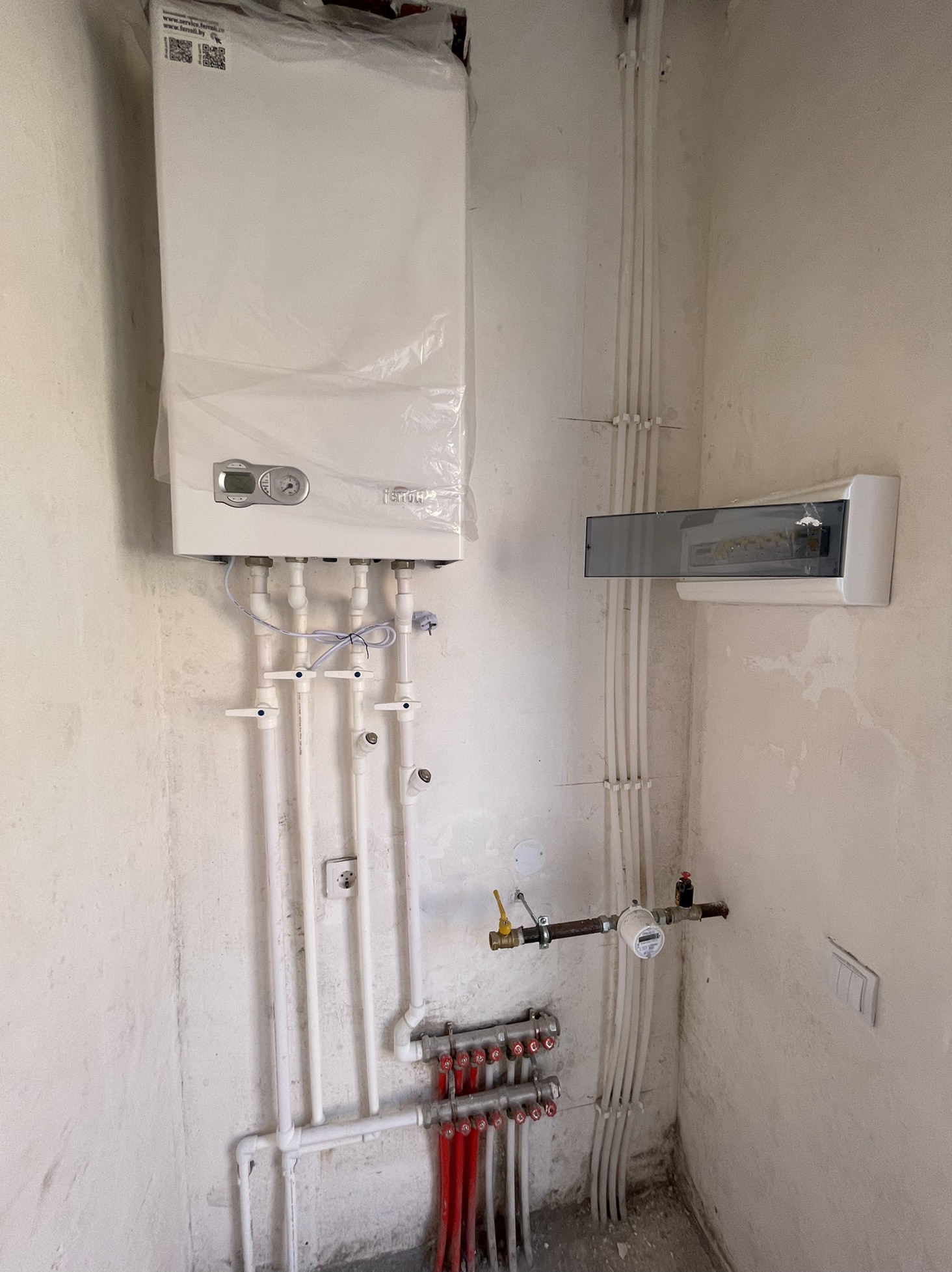Коммуникации: газ ( двухконтурный котёл на горячую воду и отопление), свет ( индивидуальные счётчики), вода центральная, слив - центральный