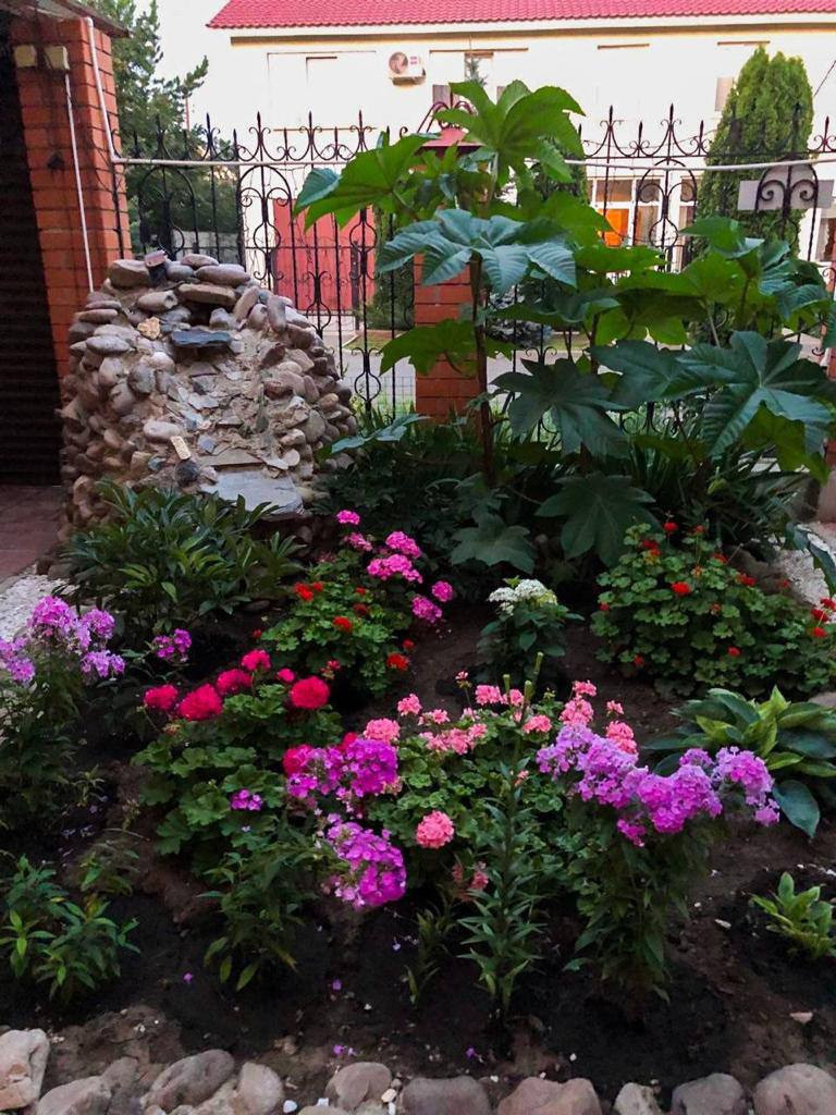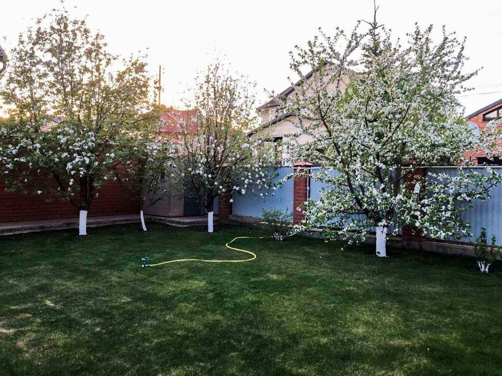 На участке газон и плодовые деревья, вдоль забора шикарные, большие, голубые ели.