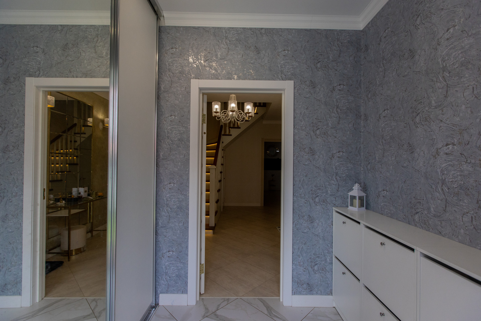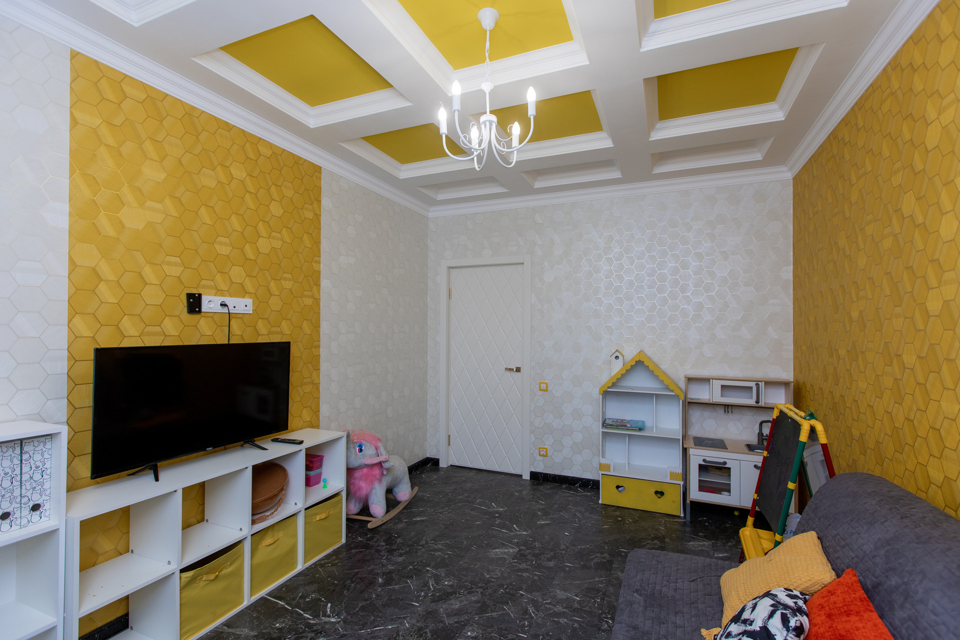 Первый этаж включает прихожую, уютный холл, кухню-гостиную площадью 26 кв.м и игровую комнату. На втором этаже расположены спальня с гардеробной (25 кв.м), детская комната, кабинет. Санузлы на каждом этаже.