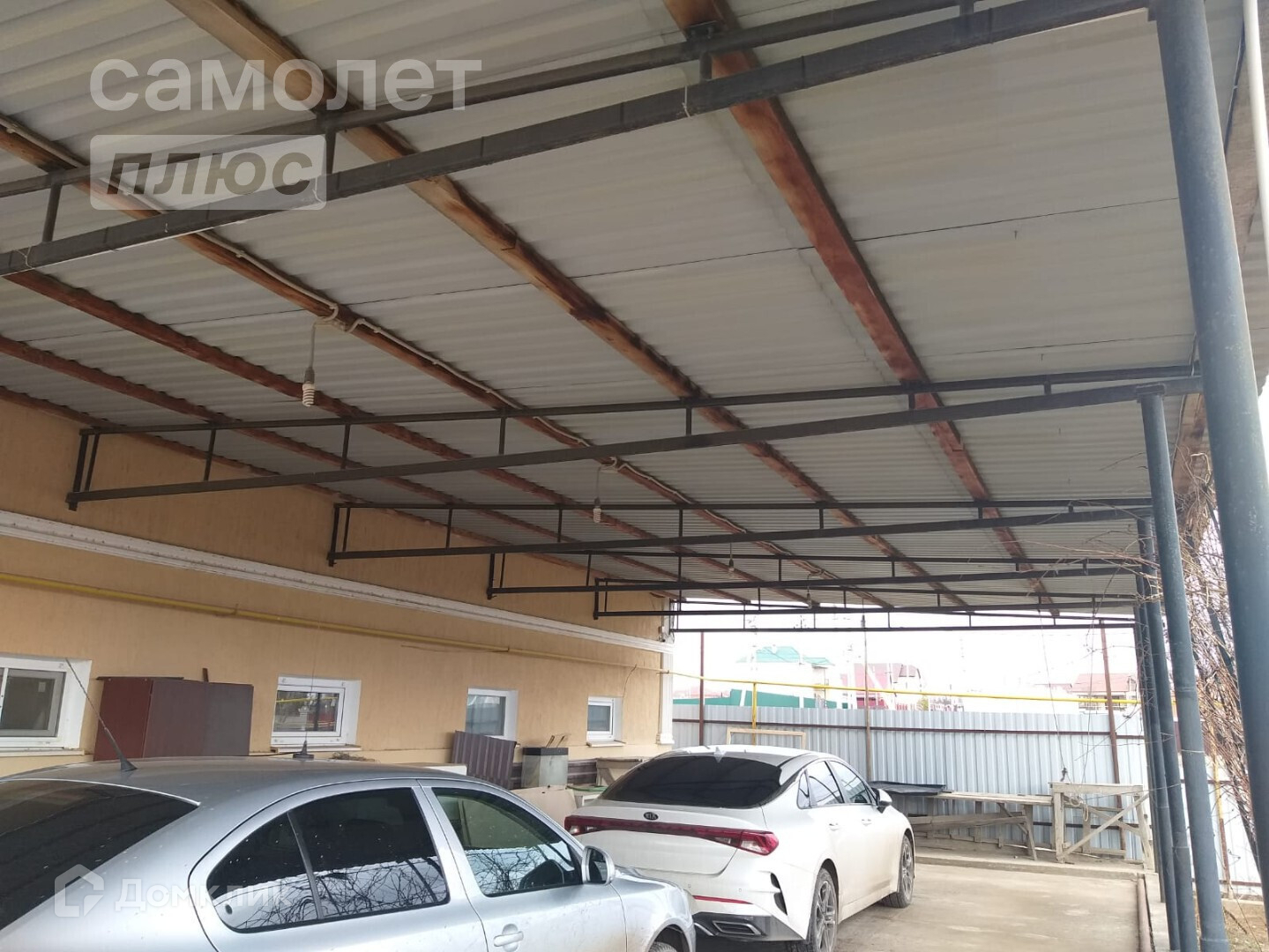 - На восьми сотках растут плодовые деревья, есть навес, в начале двора залита площадка.