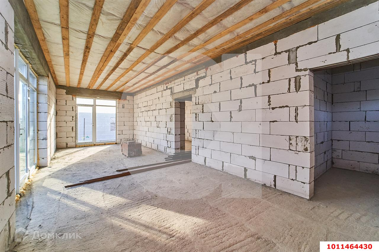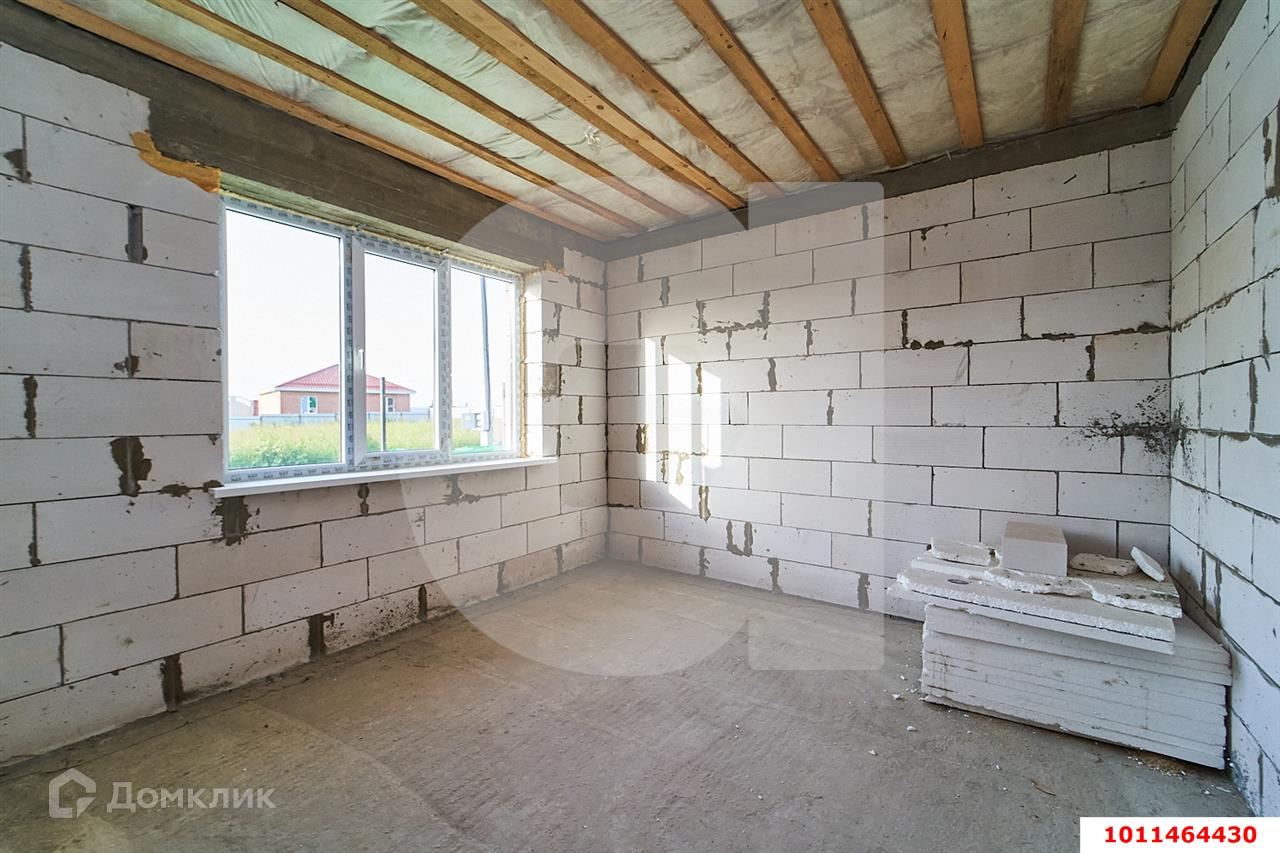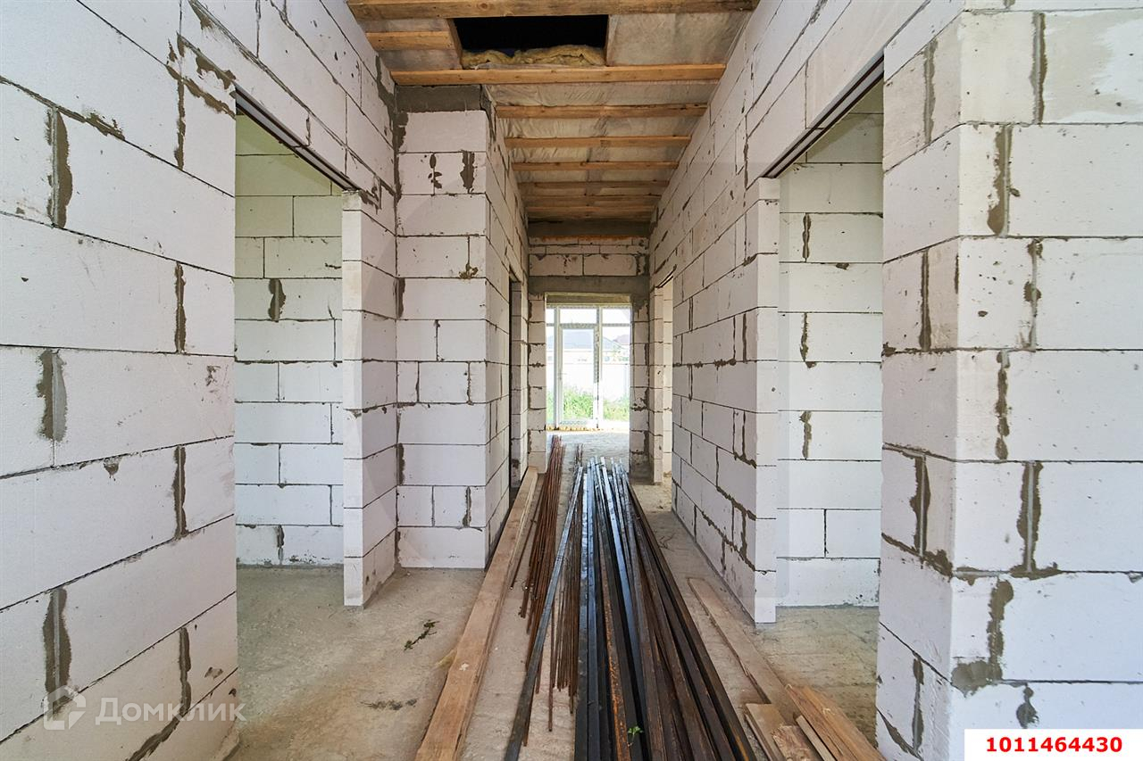 На текущий момент в доме: ленточный фундамент, газоблок 250мм, облицовочный Кирпич (Новокубанский), крыша металлочерепица, окна «Горница» ламинированные (энергосберегающие стеклопакеты), тёплая дверь 105ммЭлектричество3 фазы, 15 кВт
