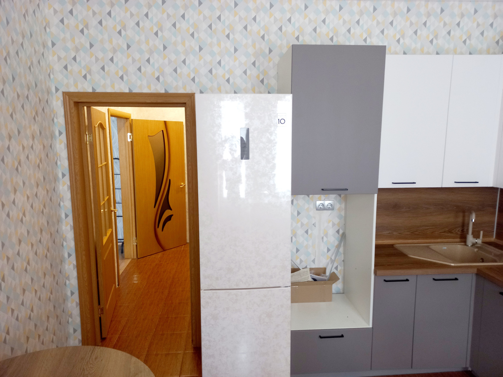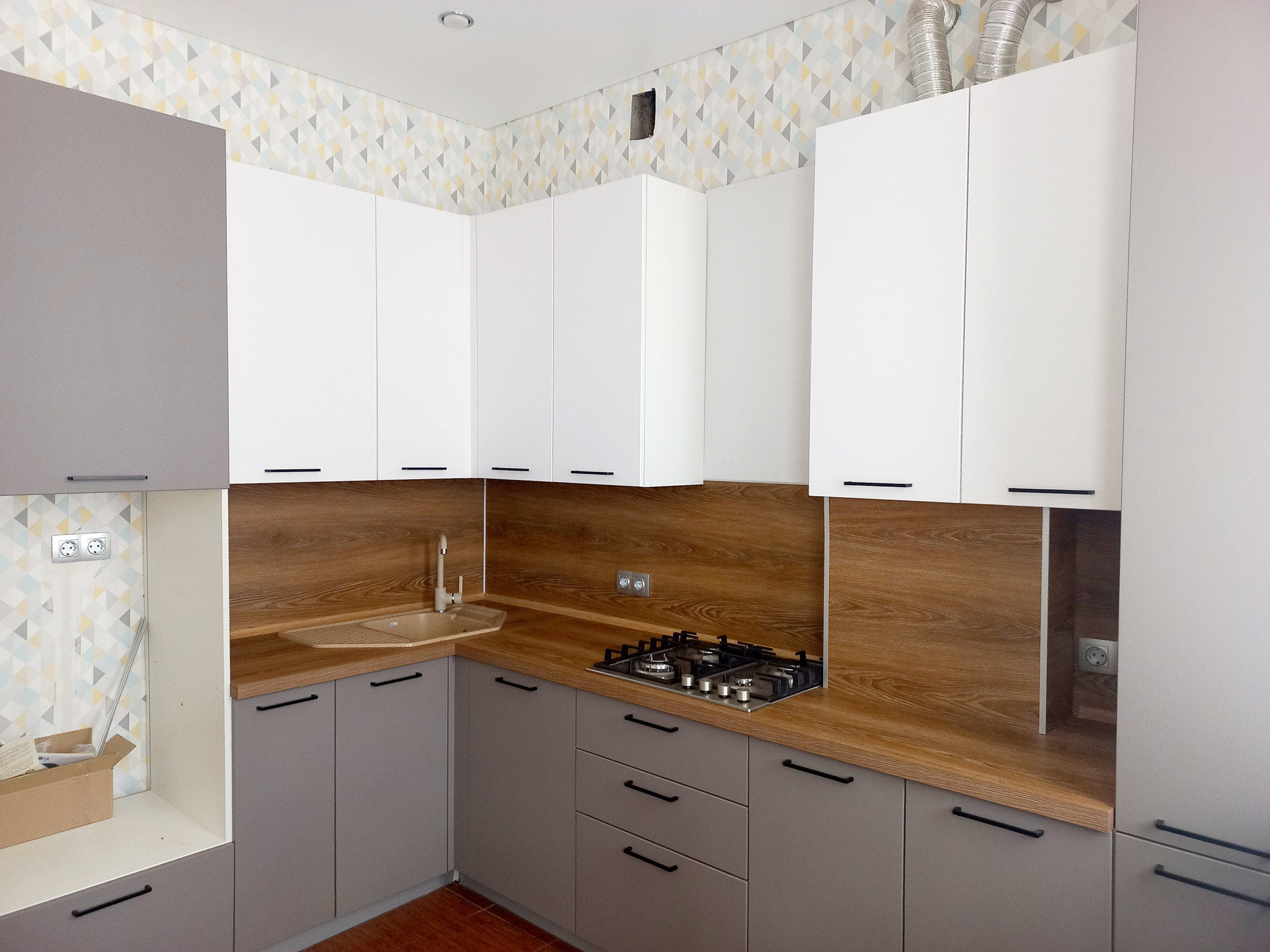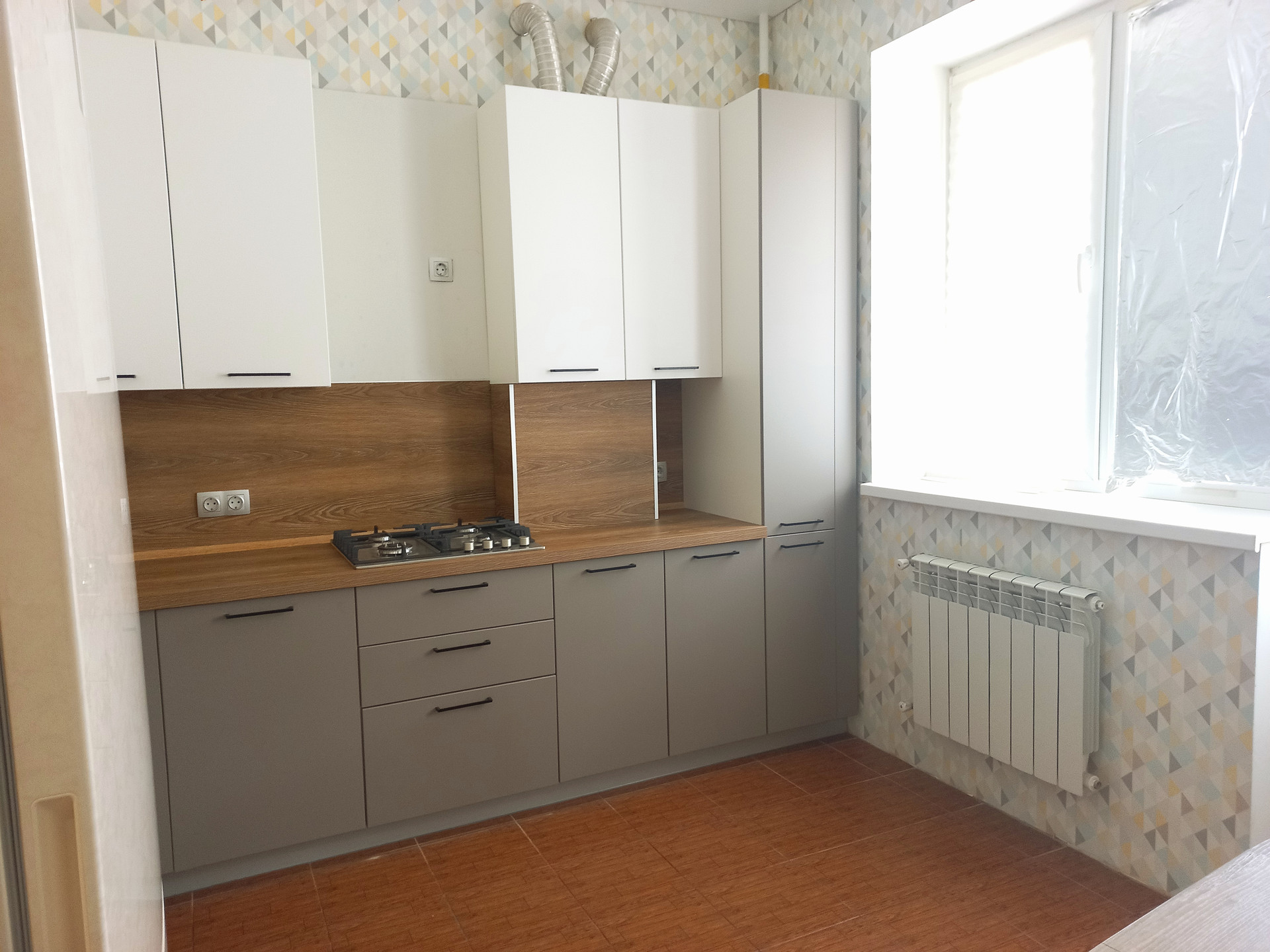 Установлен современный кухонный гарнитур, который остается в подарок покупателю.