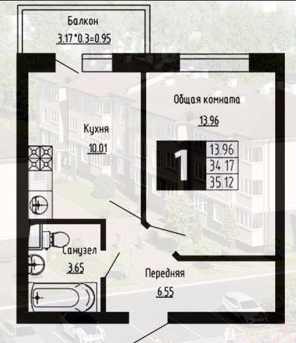 Общая площадь 35.12 м2