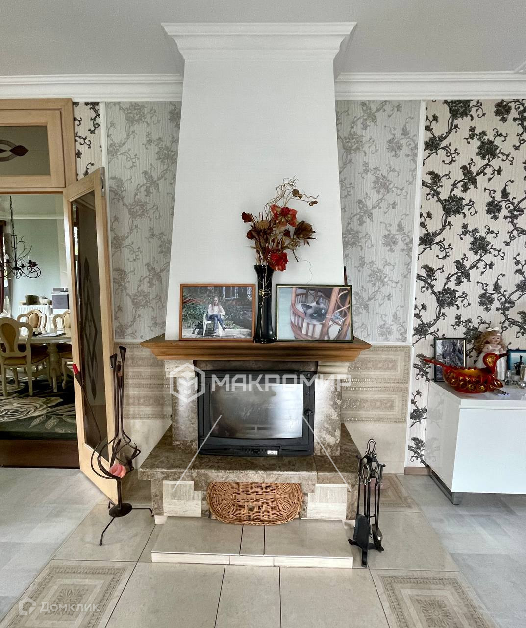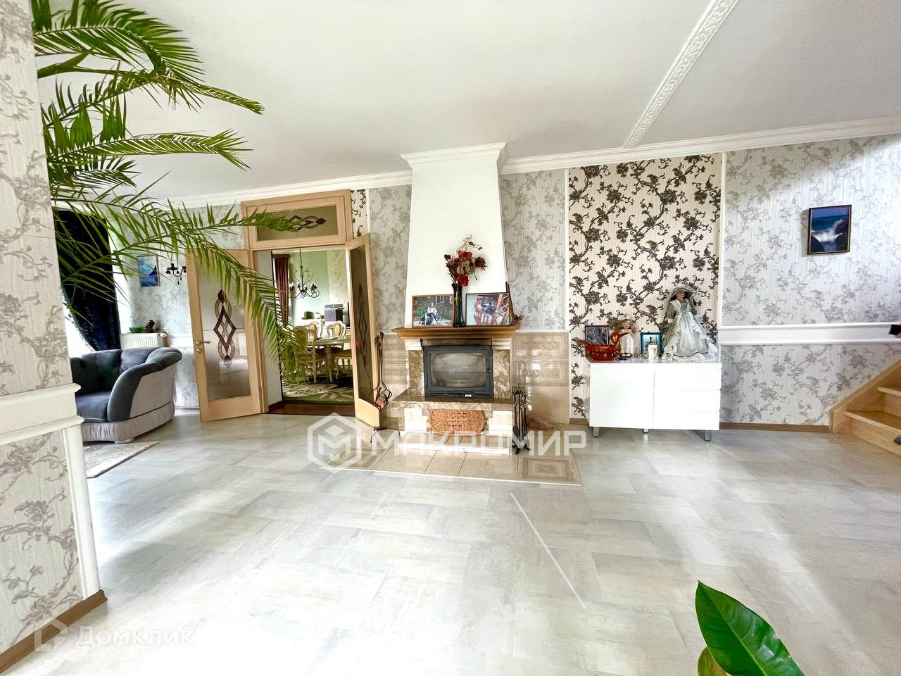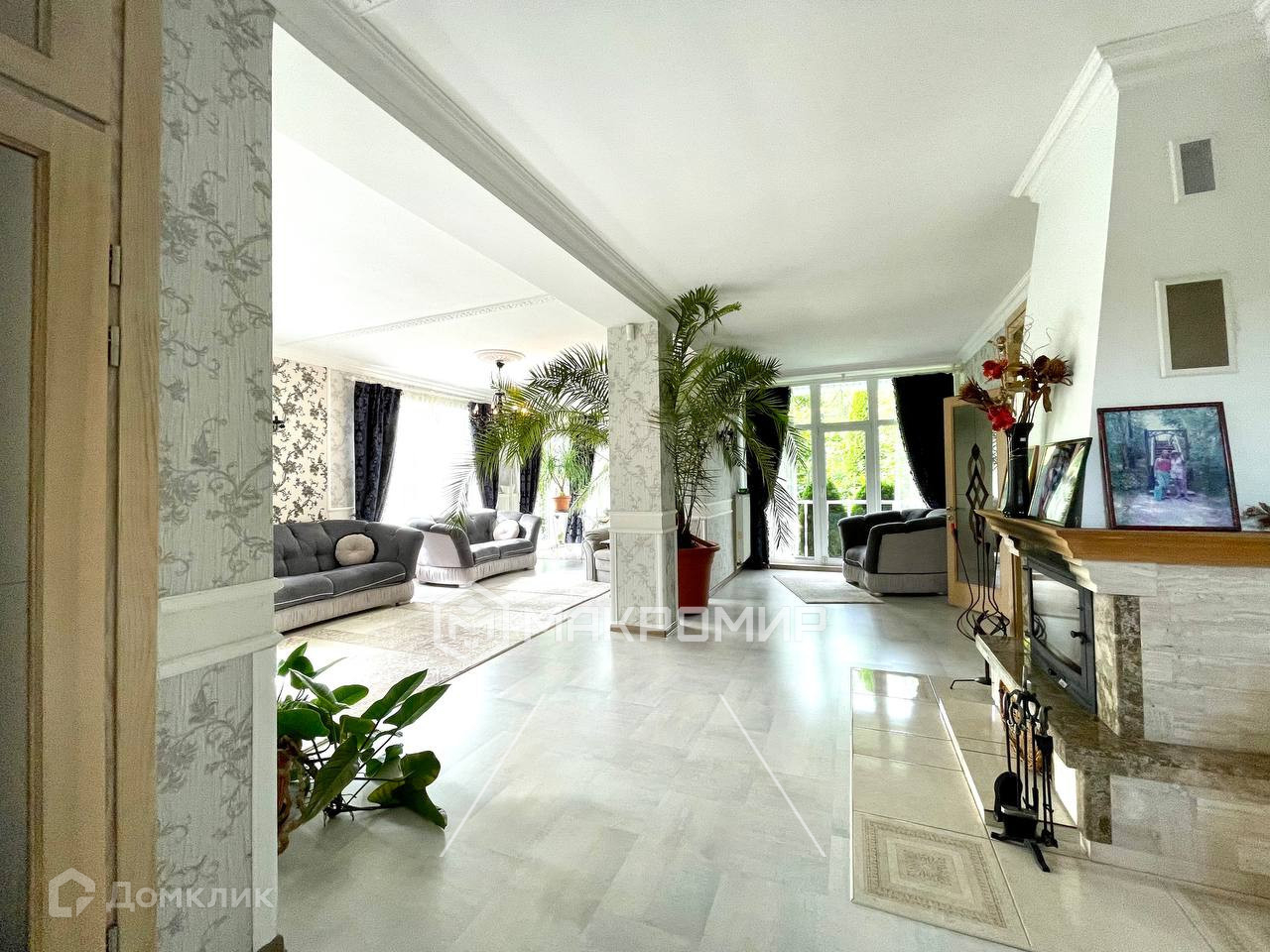 На первом этаже дома расположены гардеробная, огромная гостиная с камином 65м2, столовая, просторная кухня 18м2 с выходом на крытую террасу, хоз. комната с санузлом. Панорамные высококачественные окна в пол создают очень много дневного света и позволяют наслаждаться всей этой симфонией зелени вокруг дома.