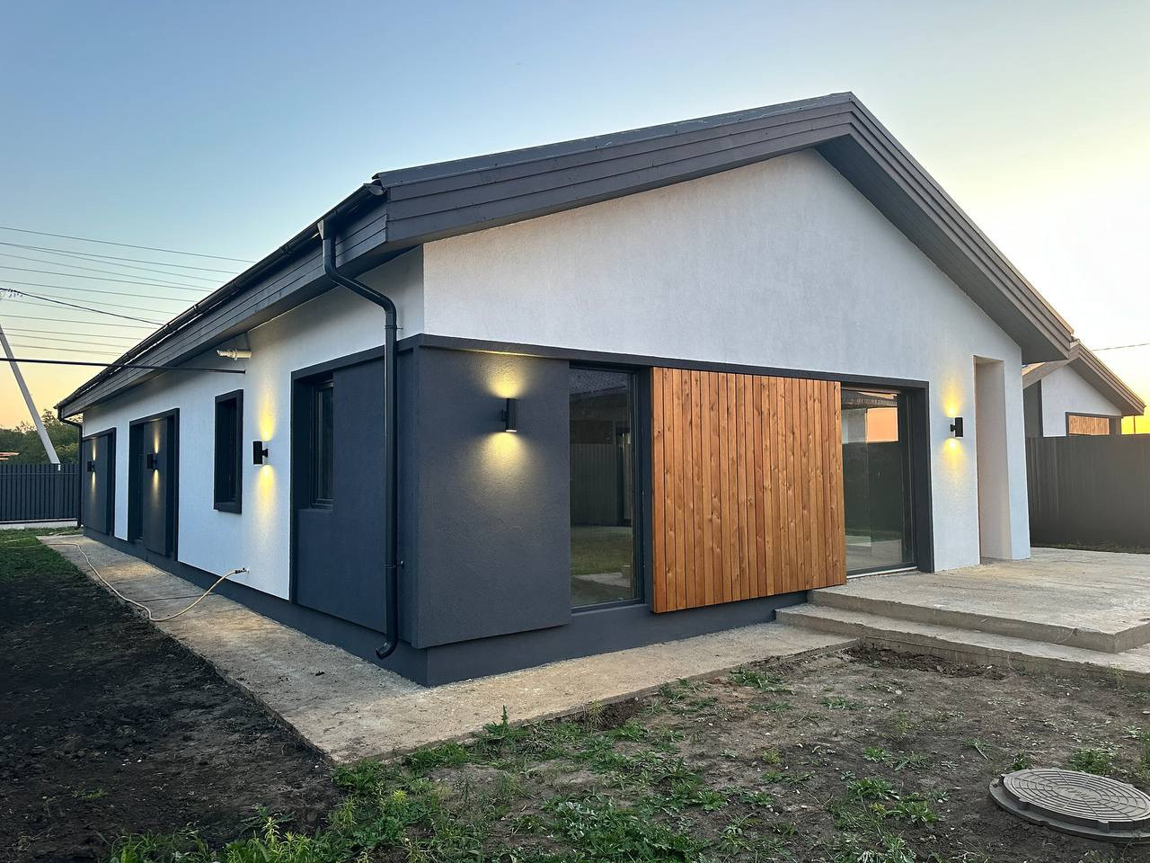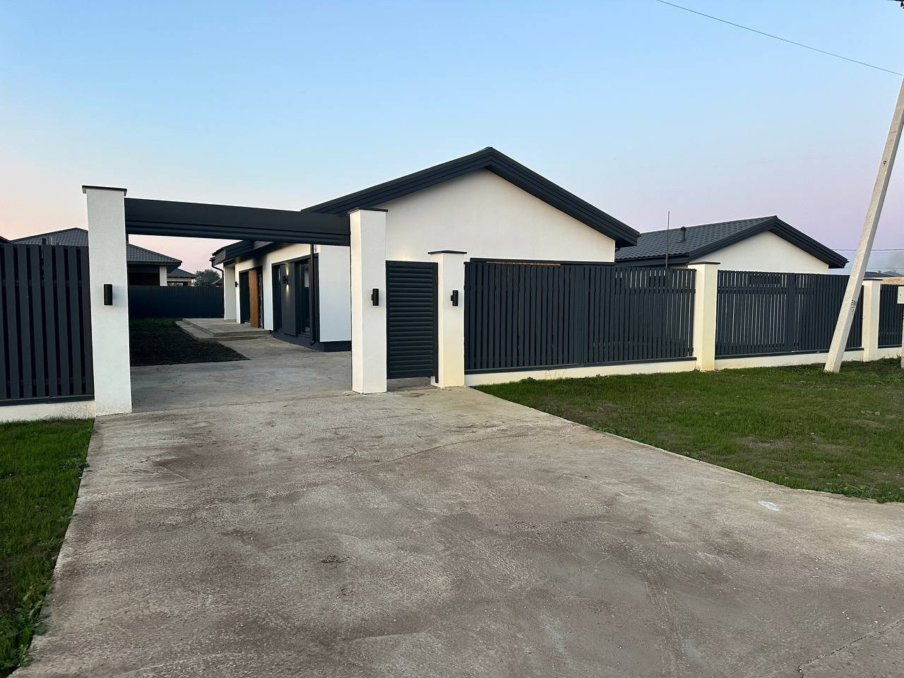 Залиты бетонные площадки под парковку внутри и снаружи на 3 машины! При необходимости можно сделать ещё больше. Все коммуникации заведены и подключены. Электричество в доме. Вода - своя скважина, заведена в дом. Газ всё подготовлено, смонтировано, остался только запуск, по договору должны подключить в течение 1-1,5 месяца. Канализация - двойной переливной септик сделан на 4 кольца каждый. По периметру участка смонтирован забор из проф.листа, фасадная часть – планкен. Ворота рулонные с дистанционным управлением. Калитка тоже есть. Участок чистый, отсыпан черноземом. Перед участком благоустроенная территория, посажен газон.