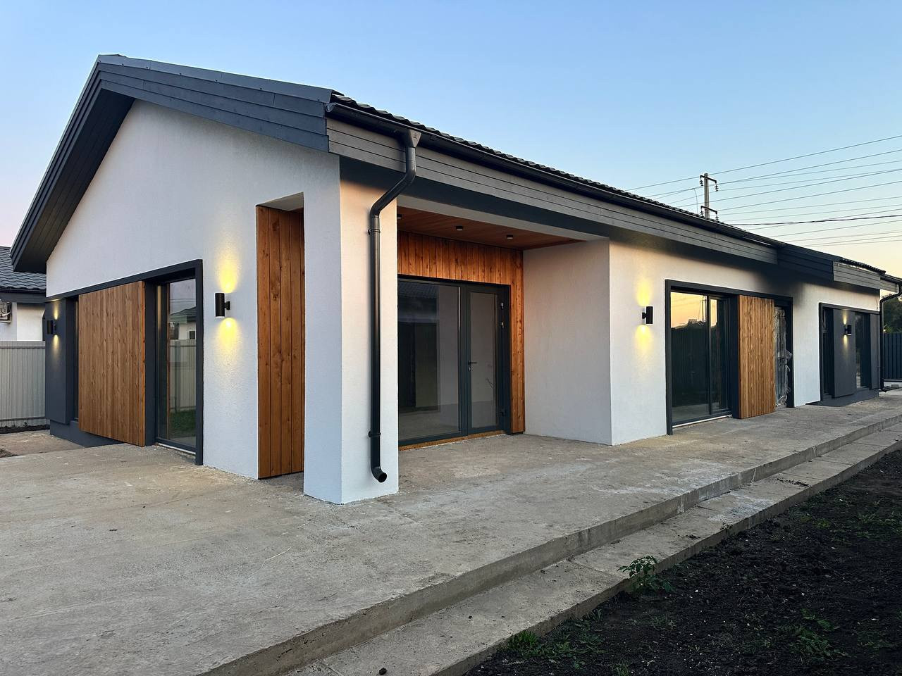 Конструктив дома: стены керамзитобетонный блок-200 мм., утеплитель-100мм негорючий пенополистирол. Отделка фасада короед рисунок «мелкий камешек», декоративные вставки выполнены планкеном из лиственницы. Кровля утепленная, из металлочерепицы. Окна пластиковые мультифункциональный энергосберегающий стеклопакет. Панорамные окна - в выполнены в телых алюминиевых рамах с калеными стеклами 6 и 8 мм. Выходы на террасу – теплый алюминий. Современная входная дверь с терморазрывом. Внутри выполнена разводка всех коммуникаций - электричества, розеток, выключателей, водоснабжения, канализации, отопления. Система отопления - теплый водяной пол. Установлен газовый котел + резервный электрокотел. Вентиляция естественная через вент. трубы. Установлена водосточная система. Наружное освещение дома и фасадной части забора!