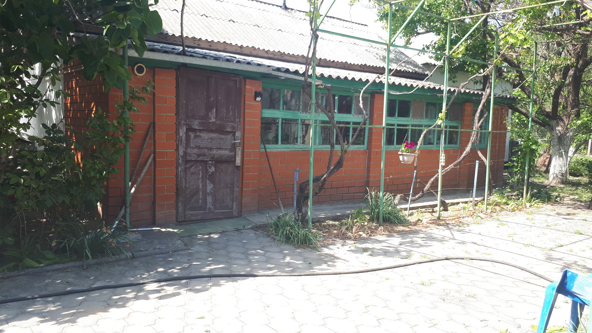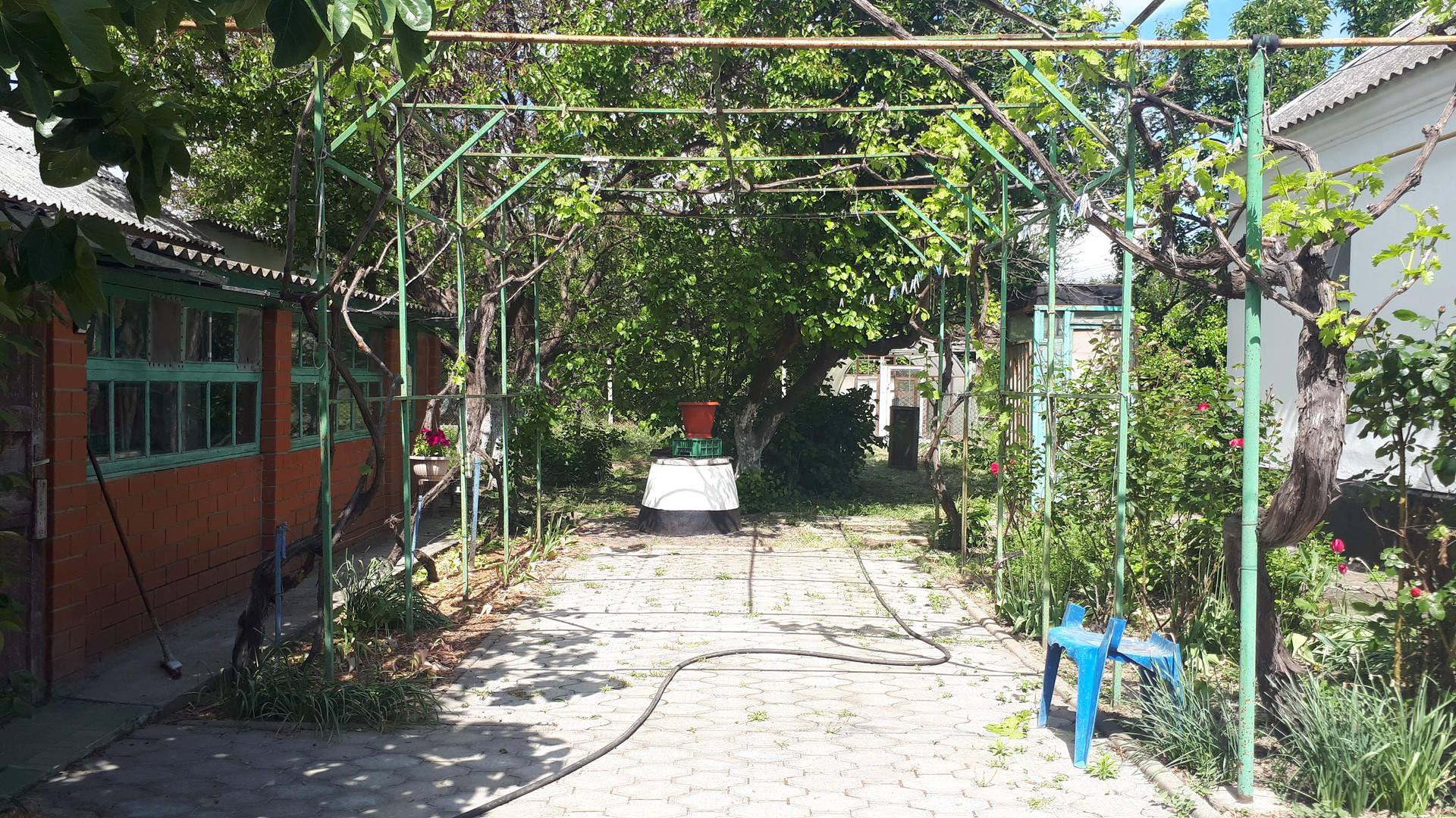 Двор в тротуарной плитке, затемнен виноградной беседкой. Во дворе много цветов.
