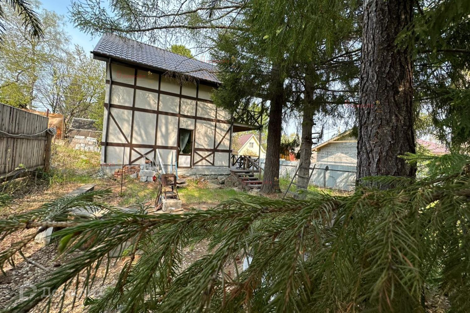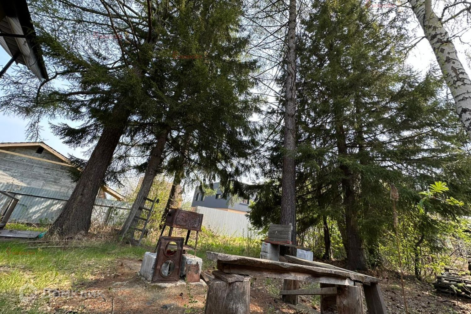 На участке старенький домик, в котором можно разместить гостей или оформить оригинальную игровую для детей- все, что угодно для души. На земельном участке растут вековые сосны и ели, имеется мангальная зона, два въезда на участок. Со второго этажа террасы открывается красивый вид на озеро!