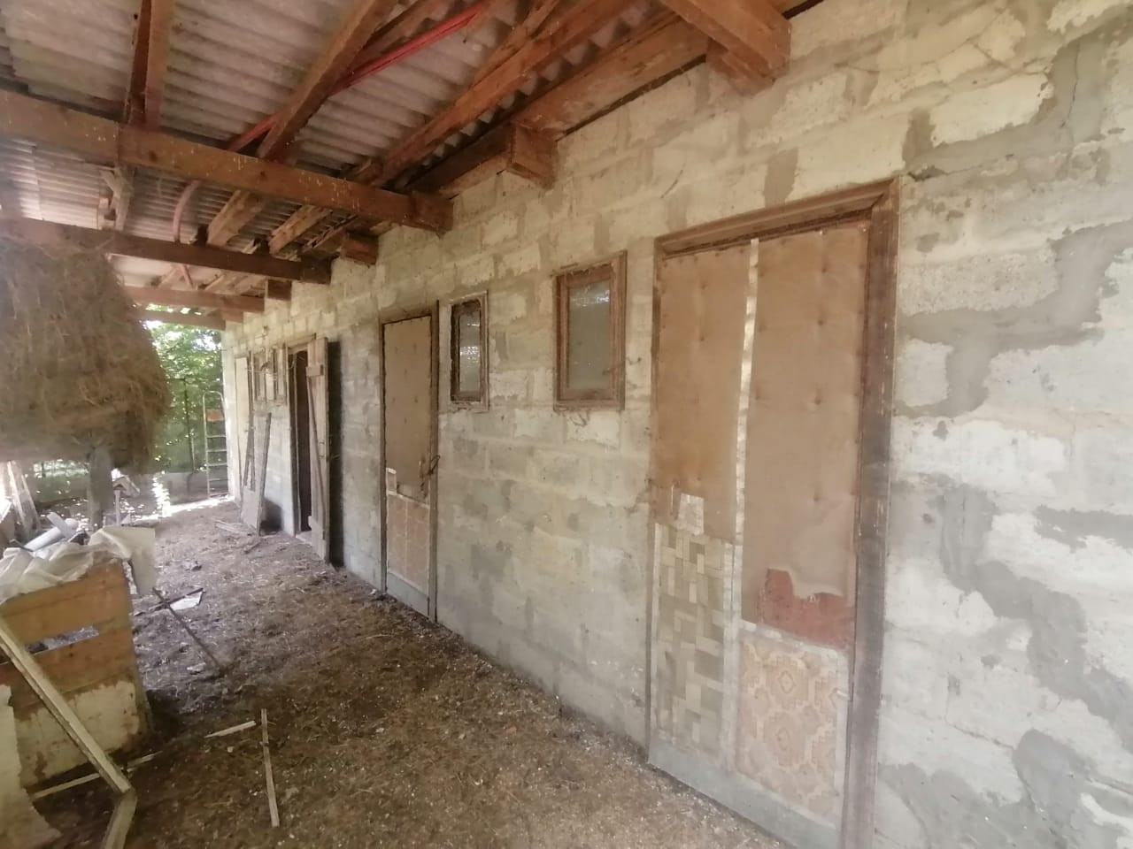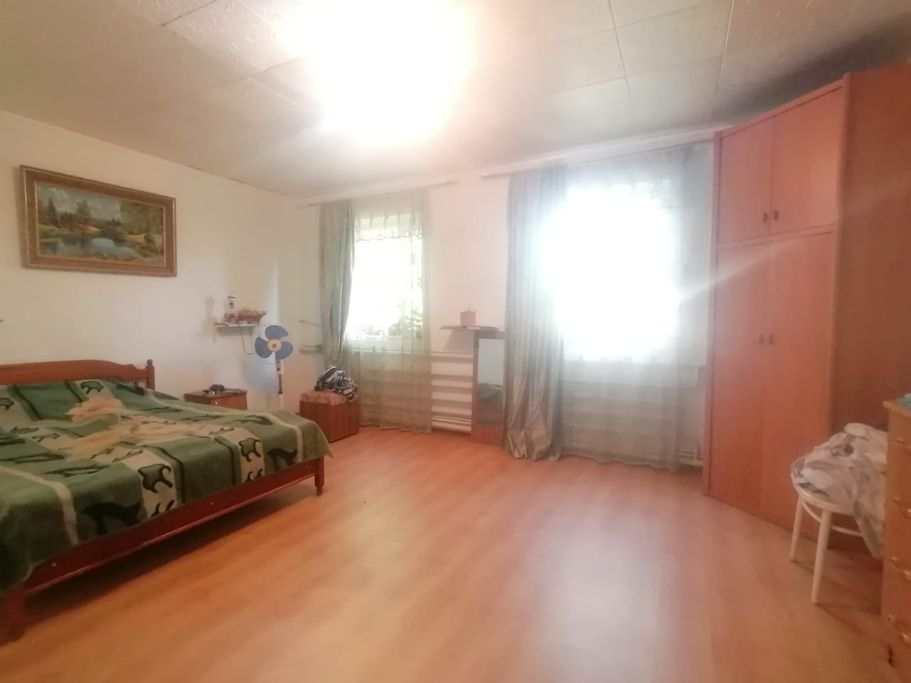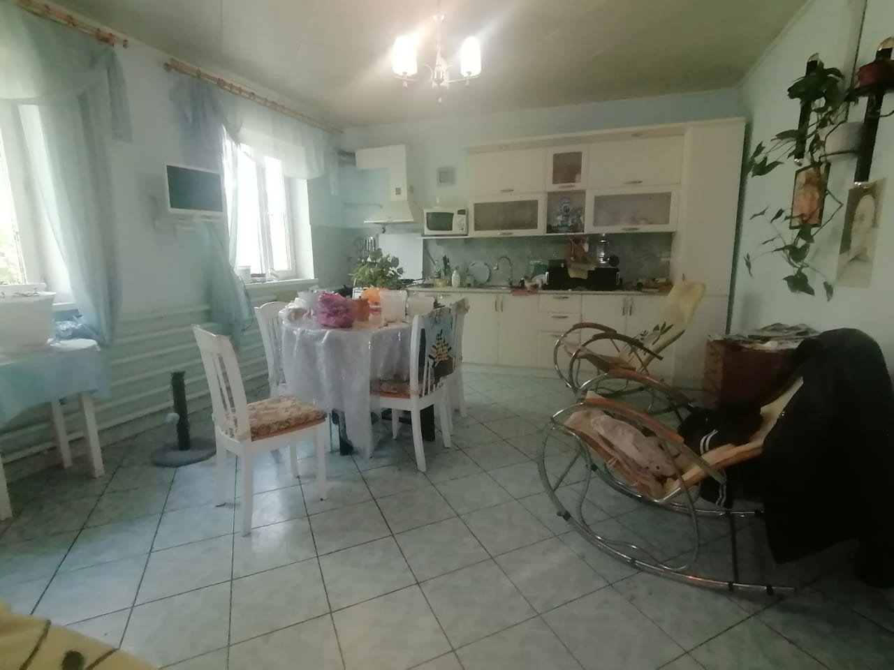 На 1м этаже гараж, большая кухня, большая гостиная, 2 комнаты, котельная и раздельный санузел, 2 большие прихожие в противоположных сторонах дома. Лестница на 2й этаж деревянная с витыми металлическими перилами.