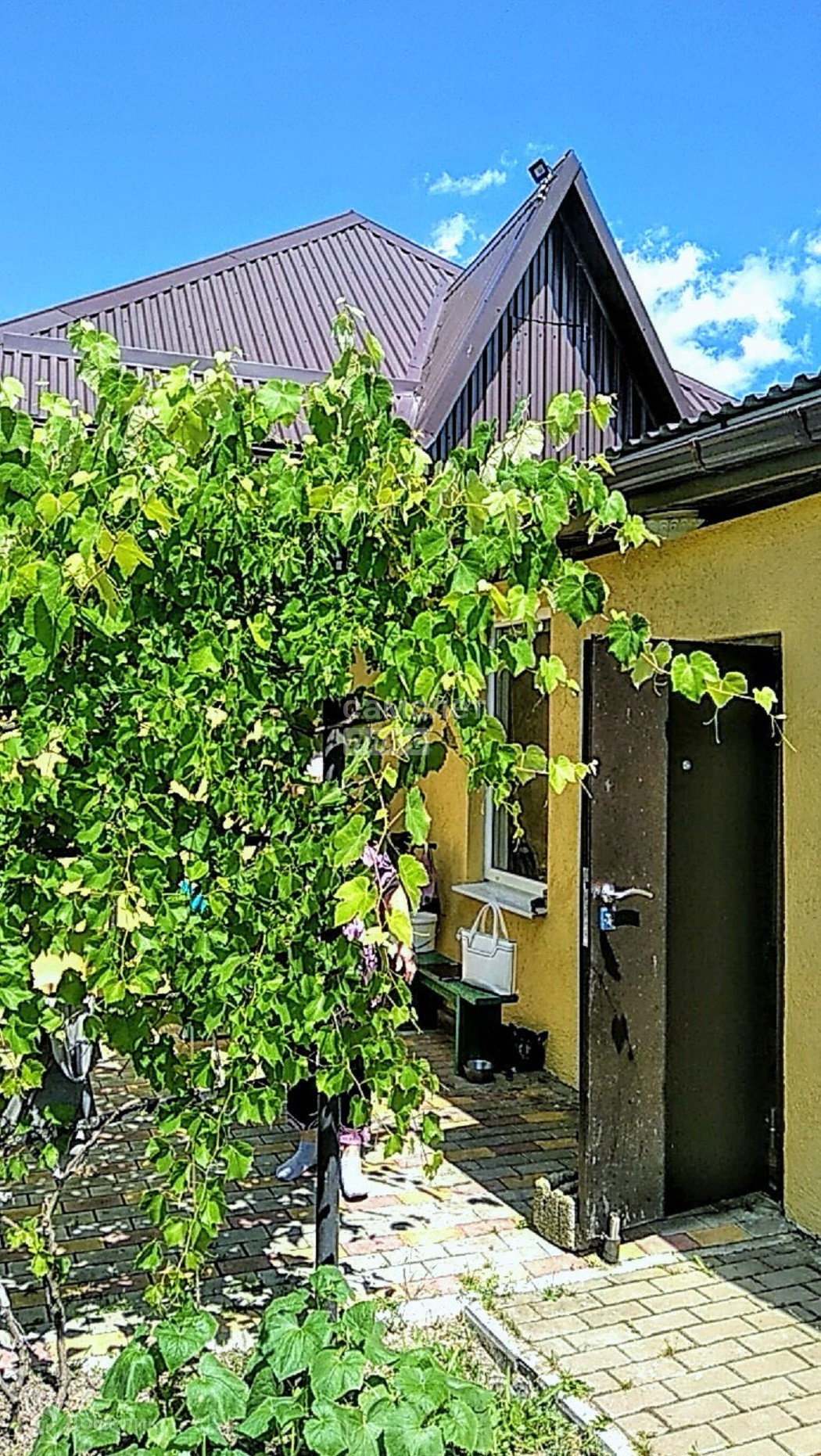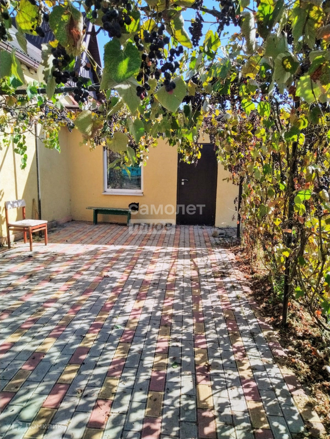 Земельный участок ухоженный, с плодоносящим садом. Двор выложен плиткой. Есть беседка с виноградником винного сорта.