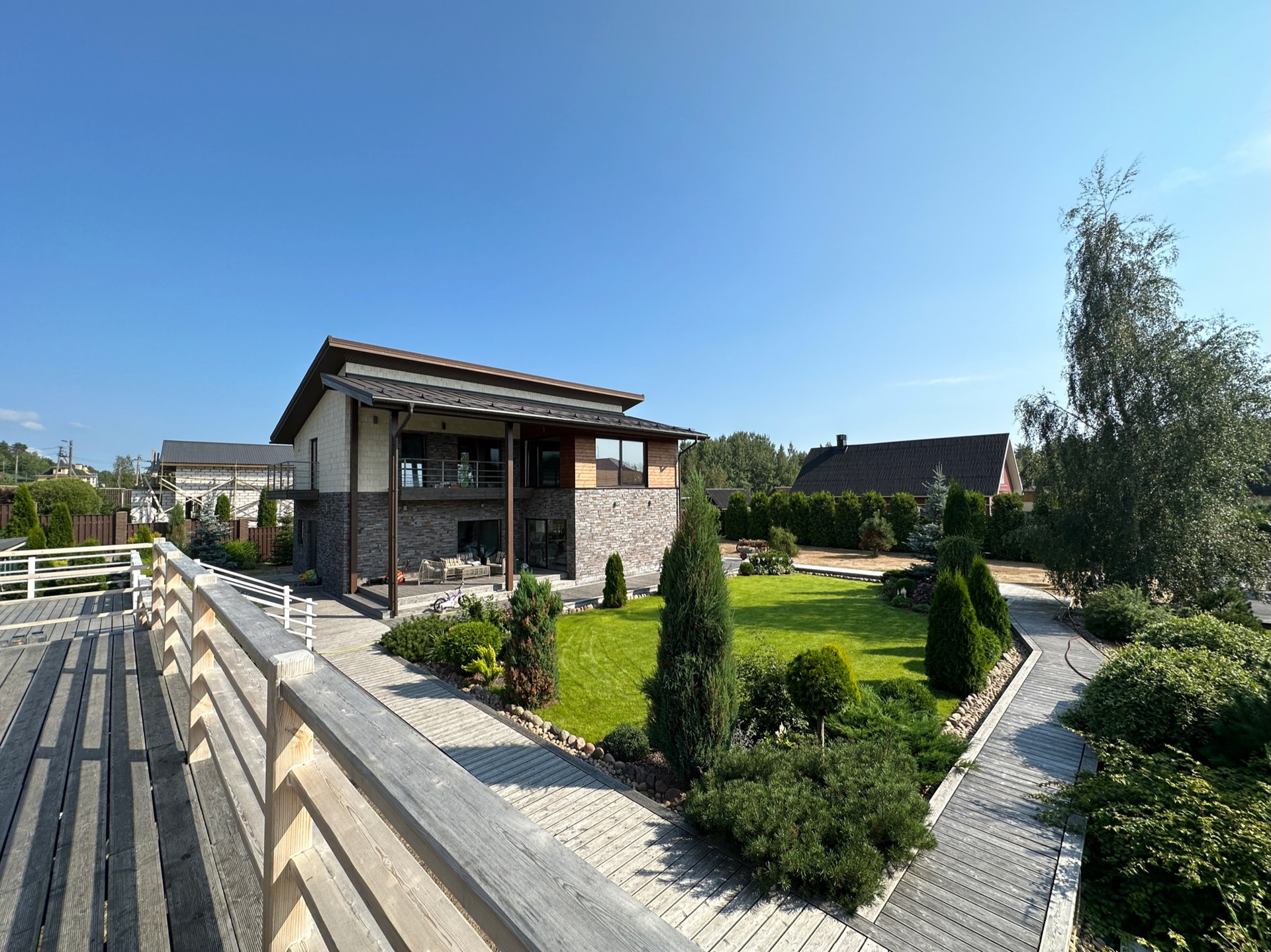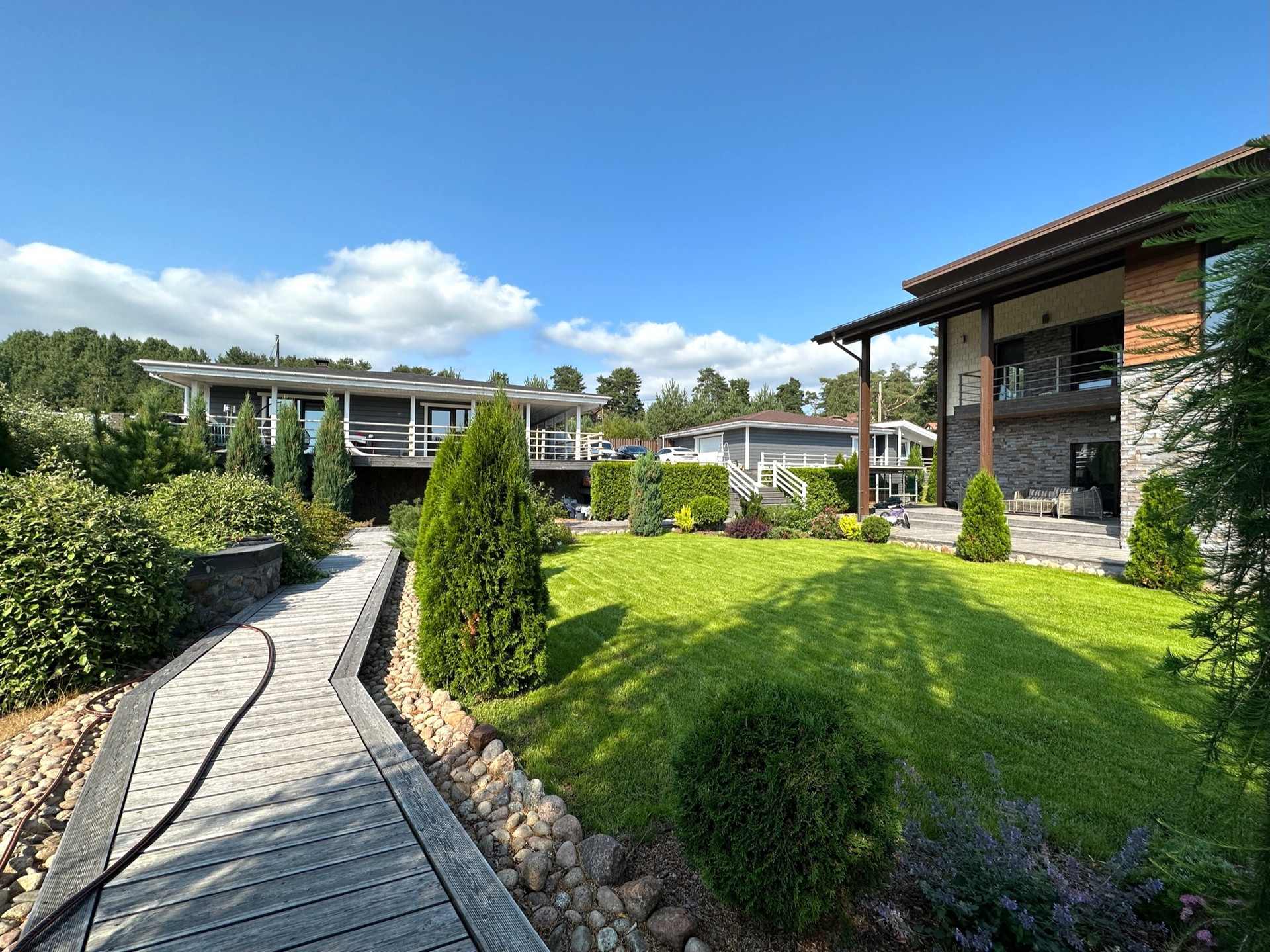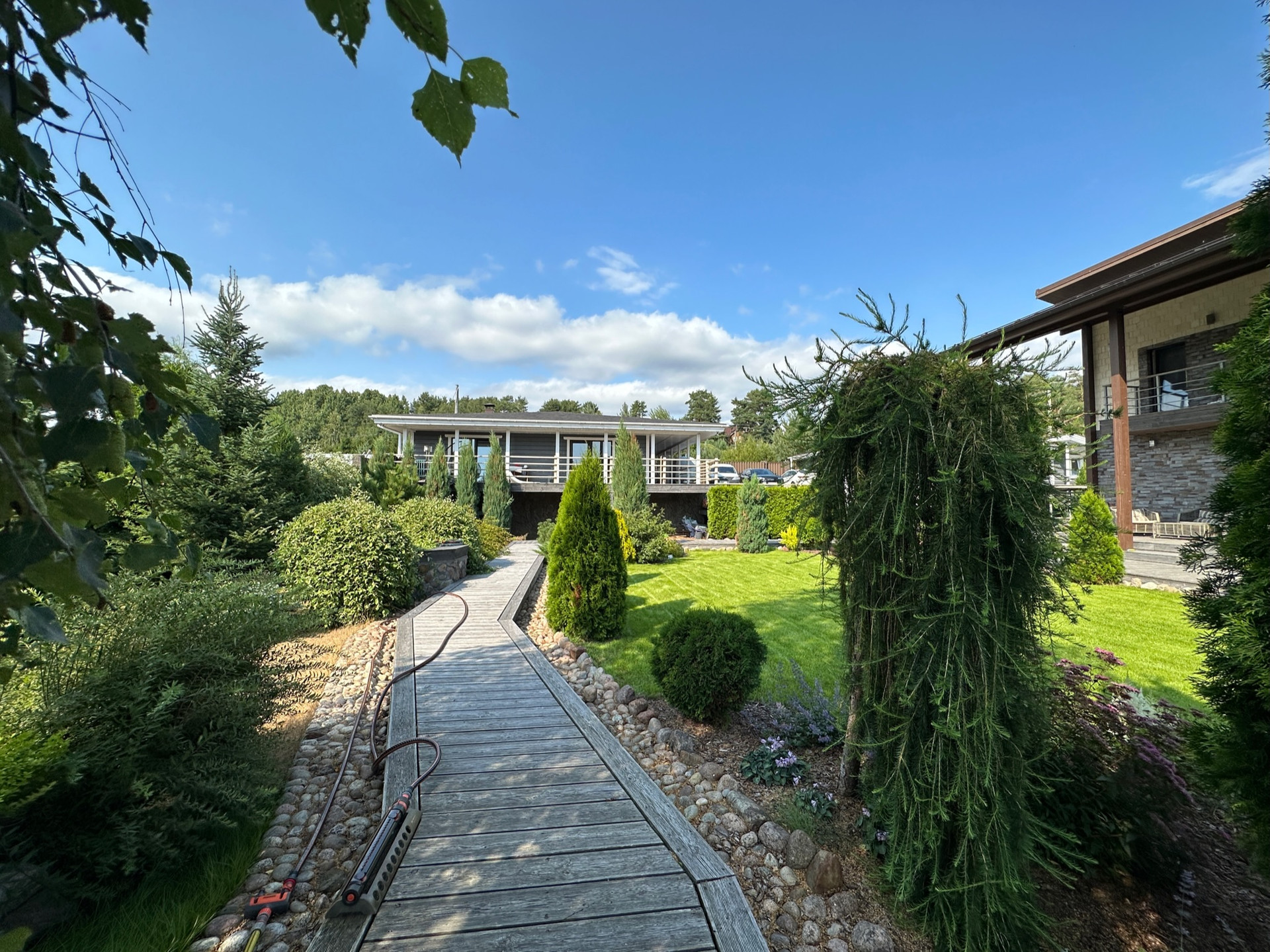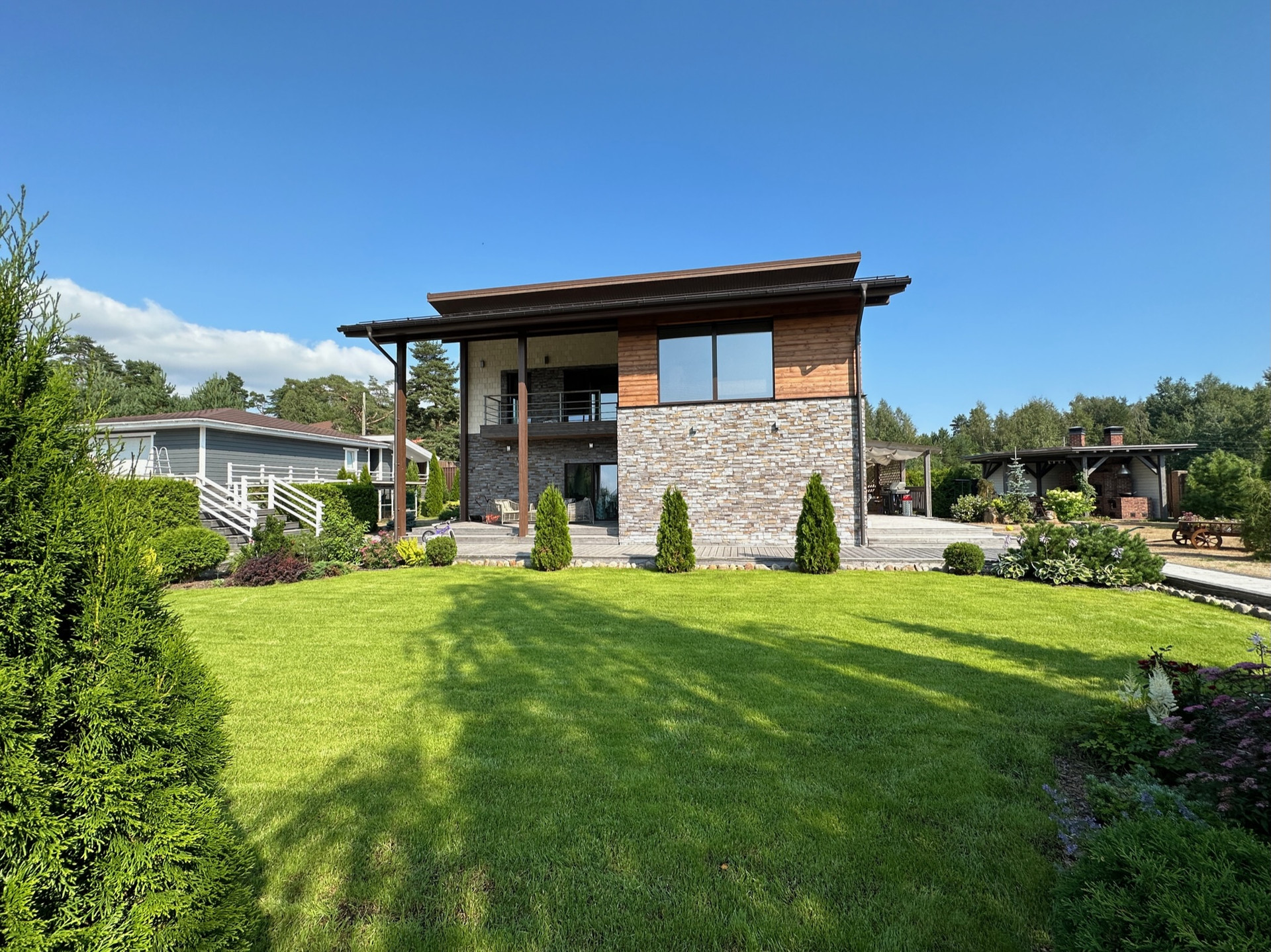 Такое решение дает много света и воздуха в доме, а также замечательные виды на участок с ландшафтным дизайном, зону барбекю и прочие строения из любого помещения.
