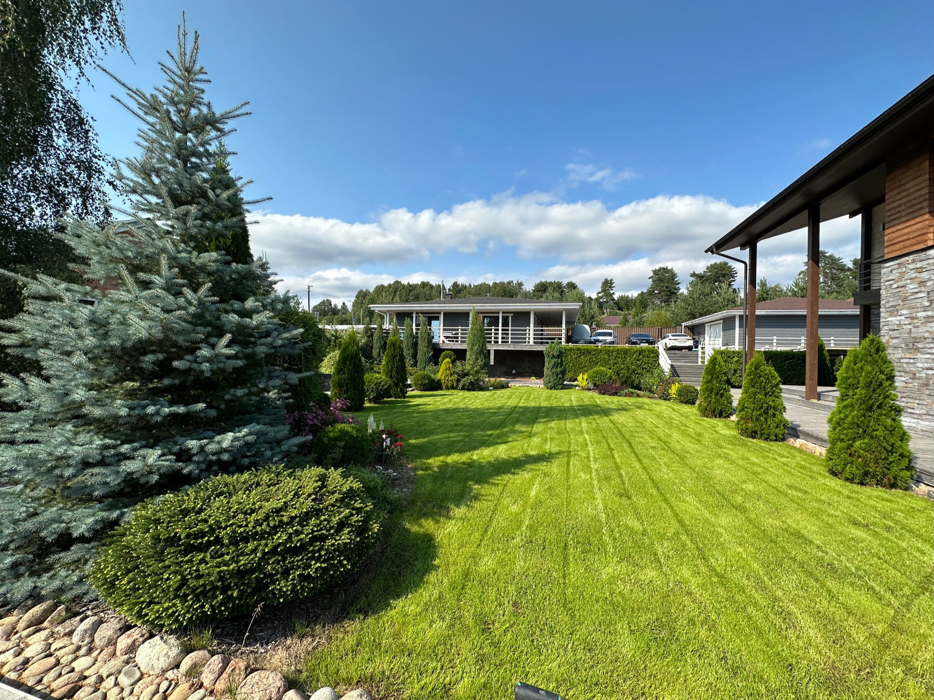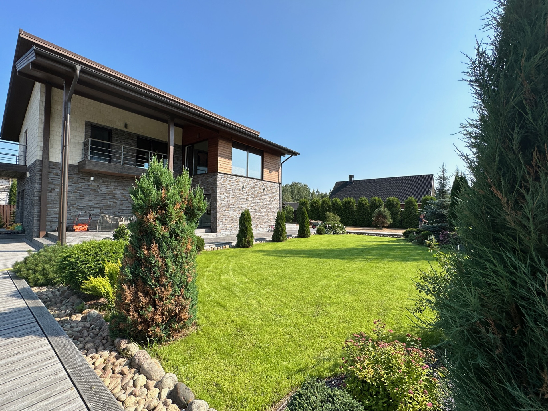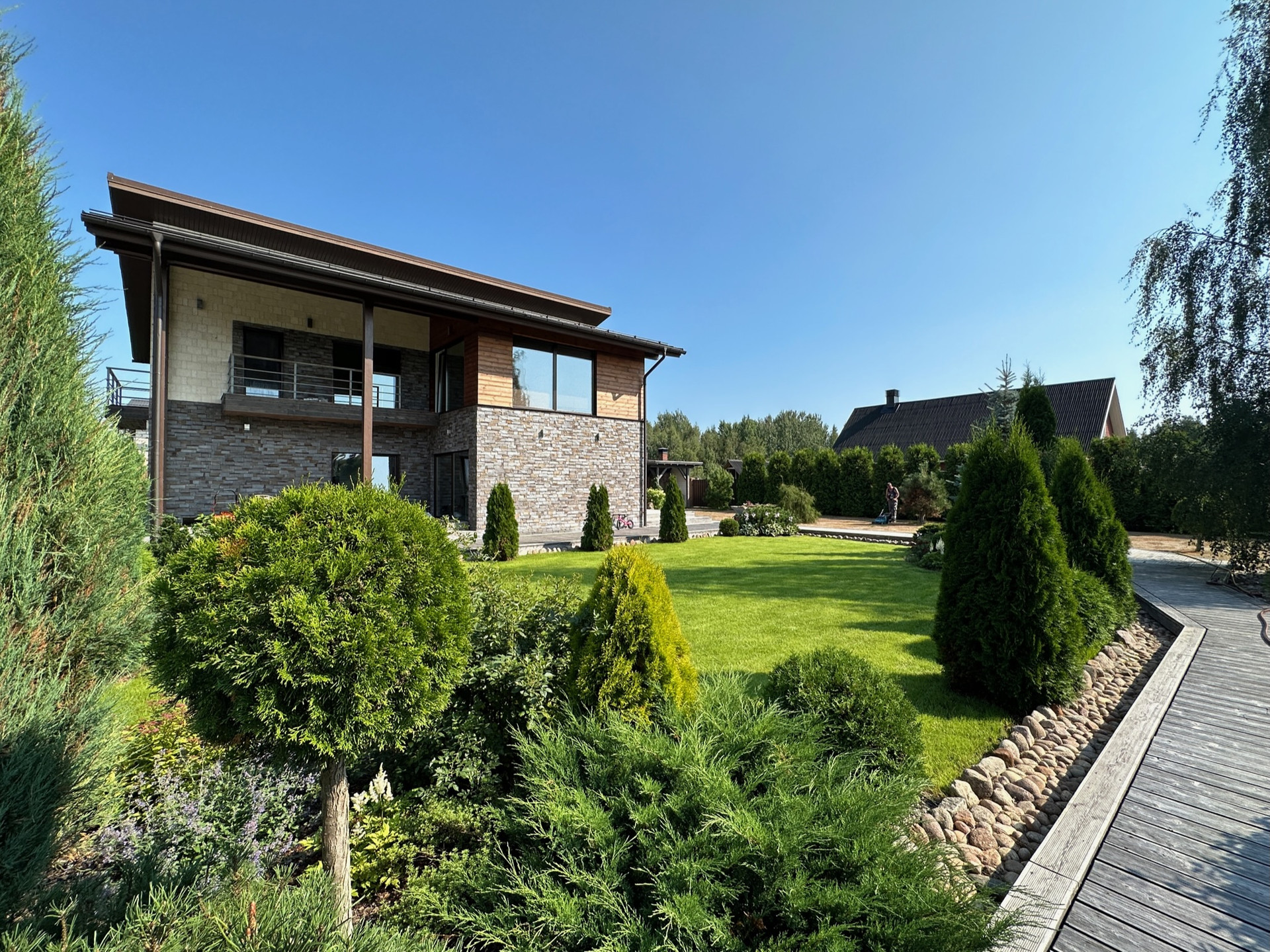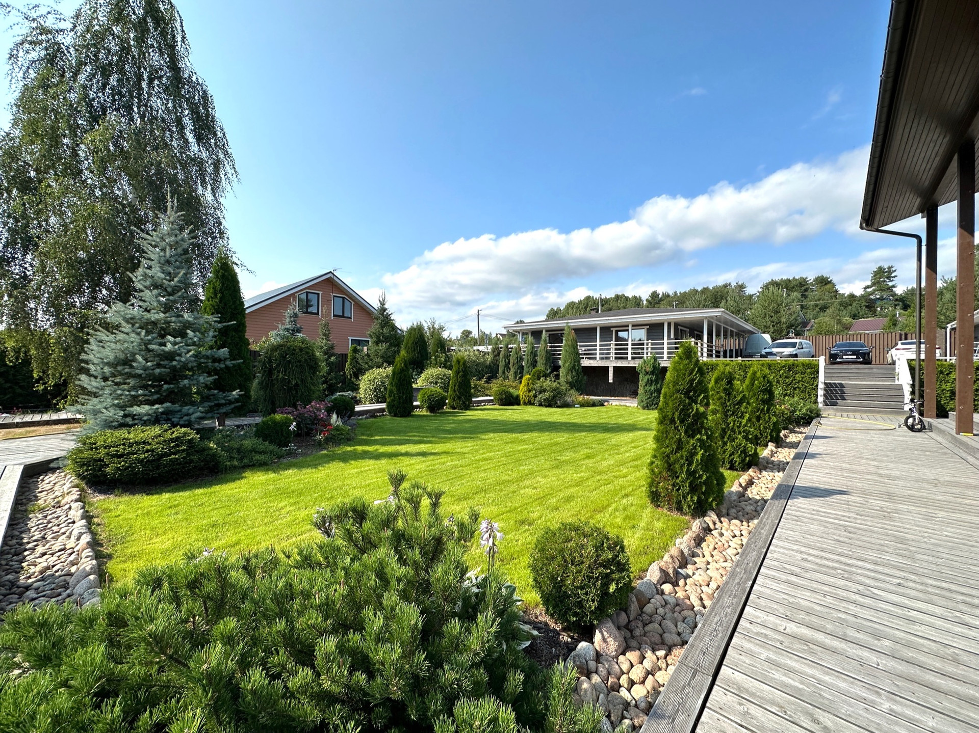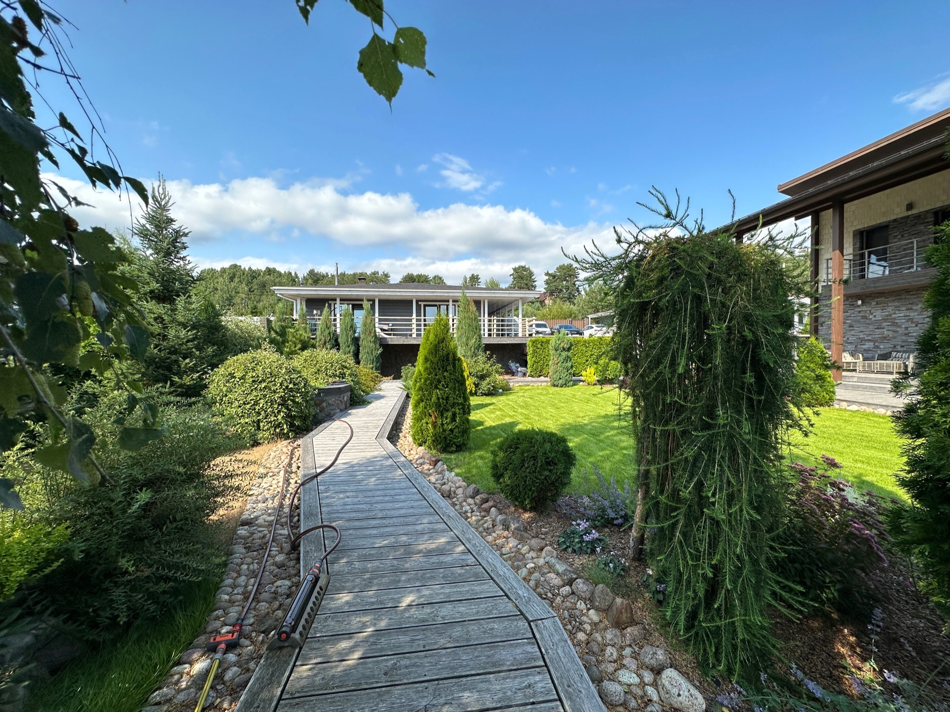 Такое решение дает много света и воздуха в доме, а также замечательные виды на участок с ландшафтным дизайном, зону барбекю и прочие строения из любого помещения.