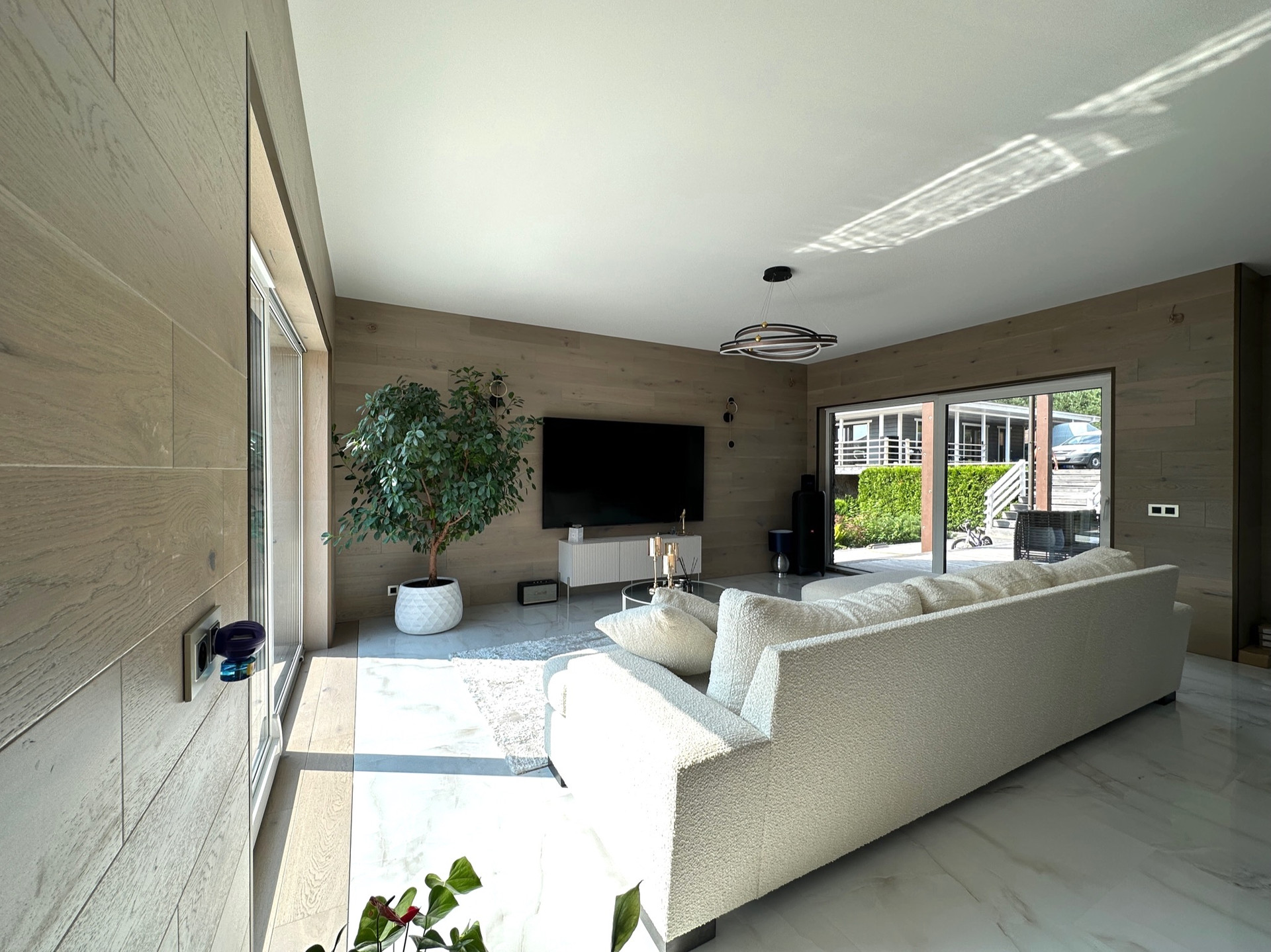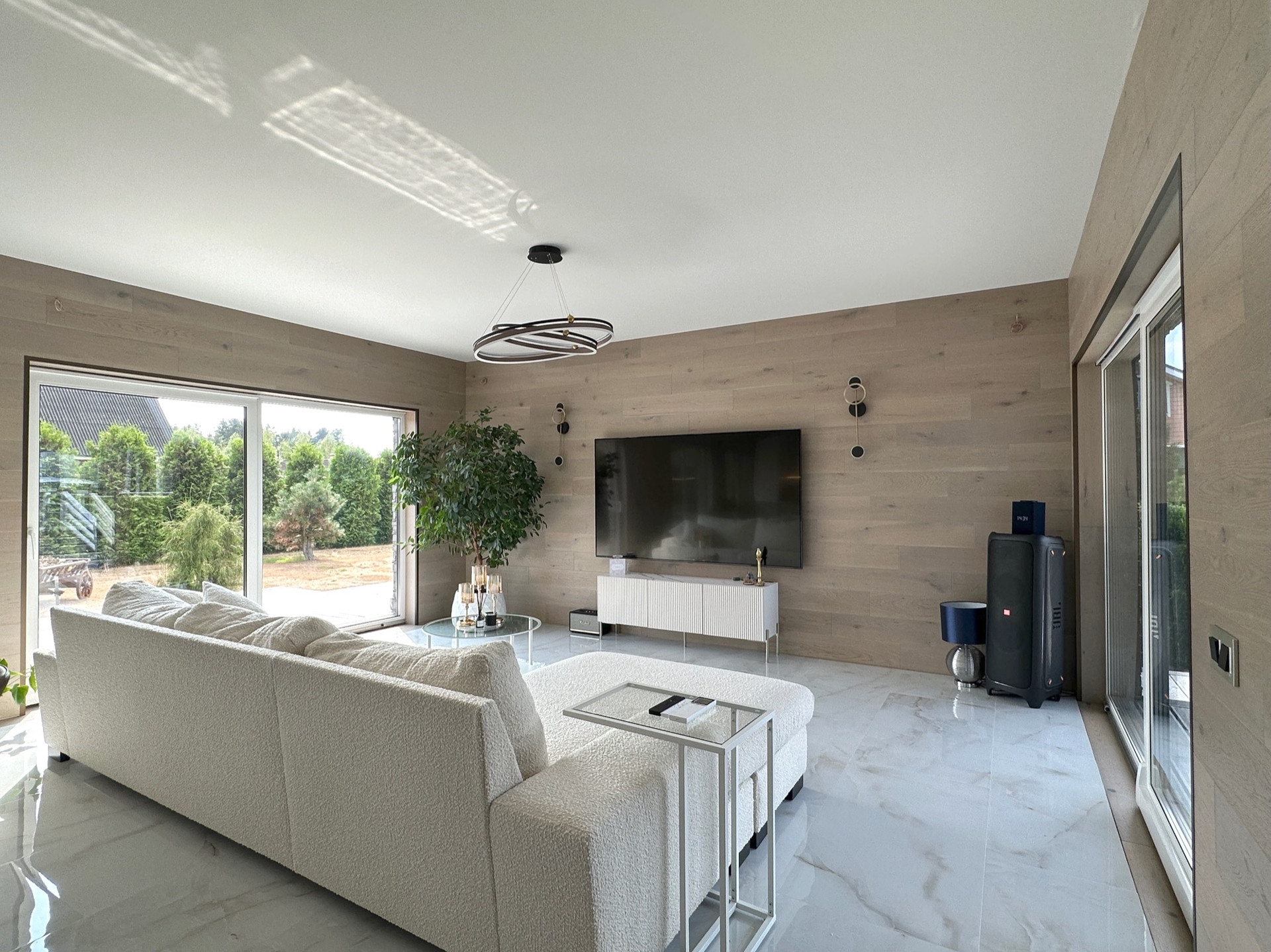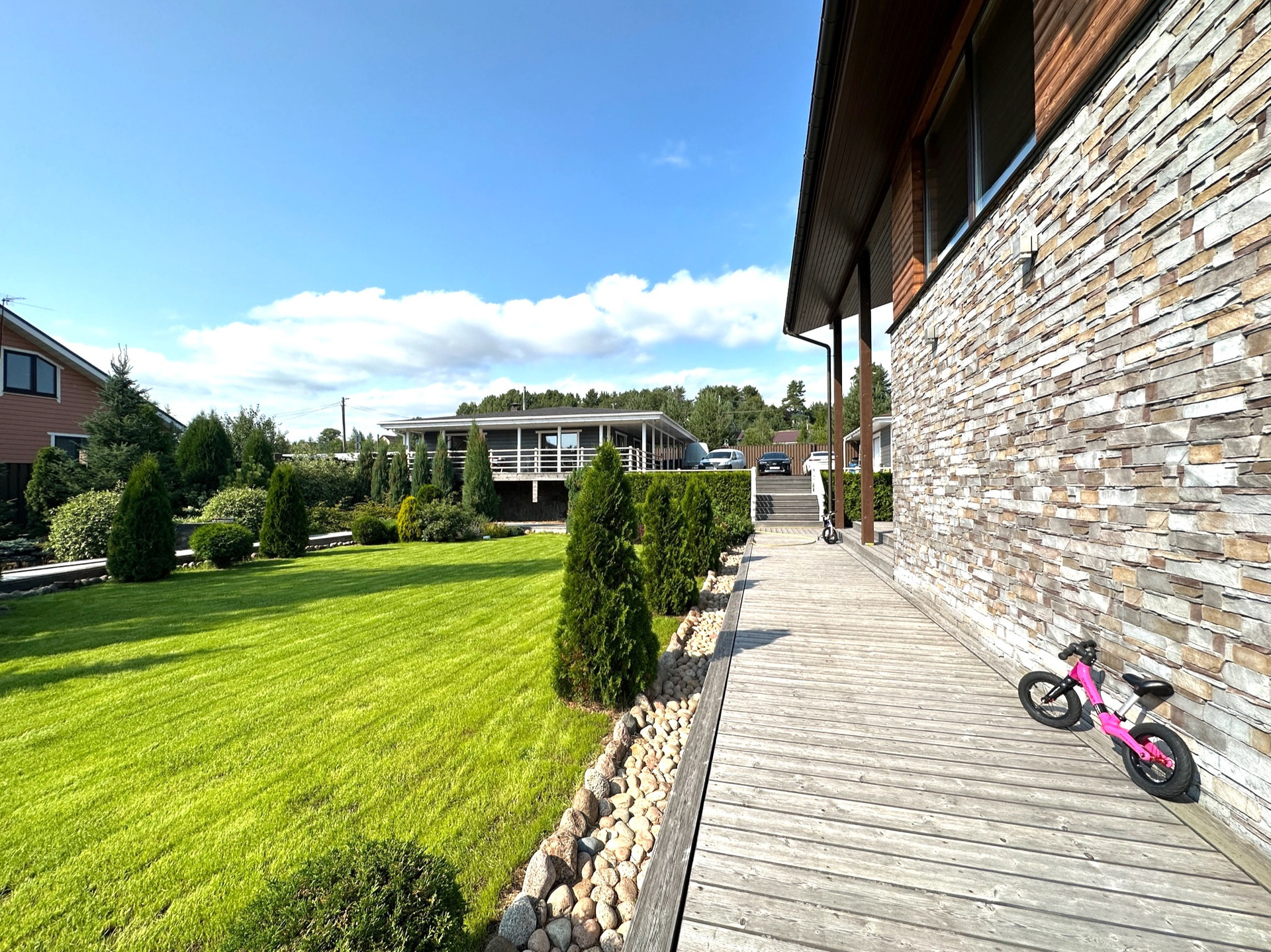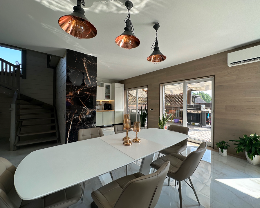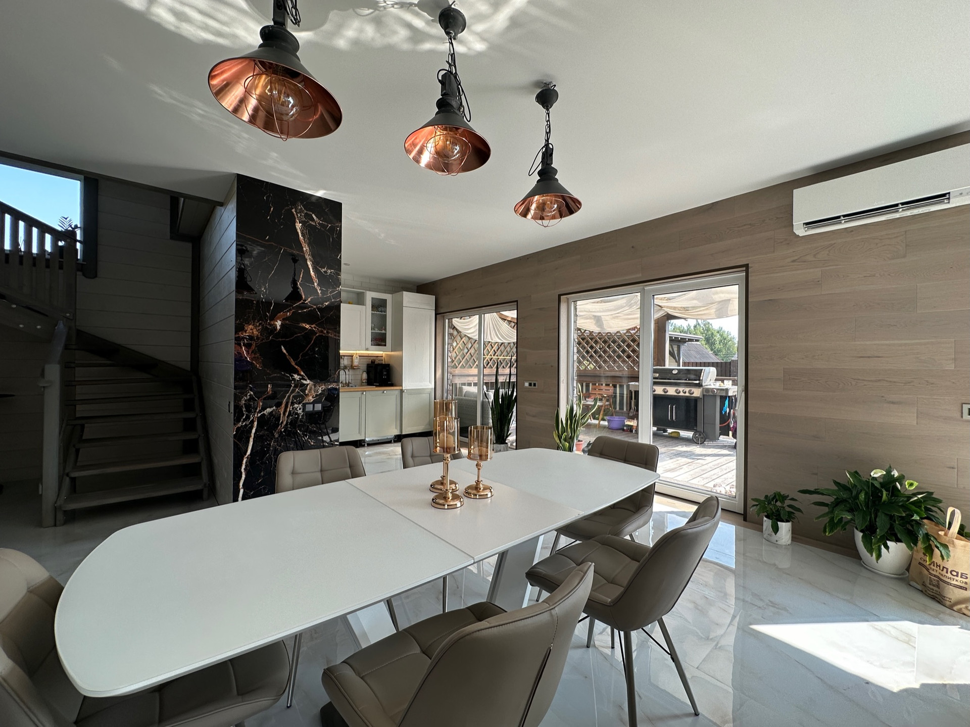 Такое решение дает много света и воздуха в доме, а также замечательные виды на участок с ландшафтным дизайном, зону барбекю и прочие строения из любого помещения.