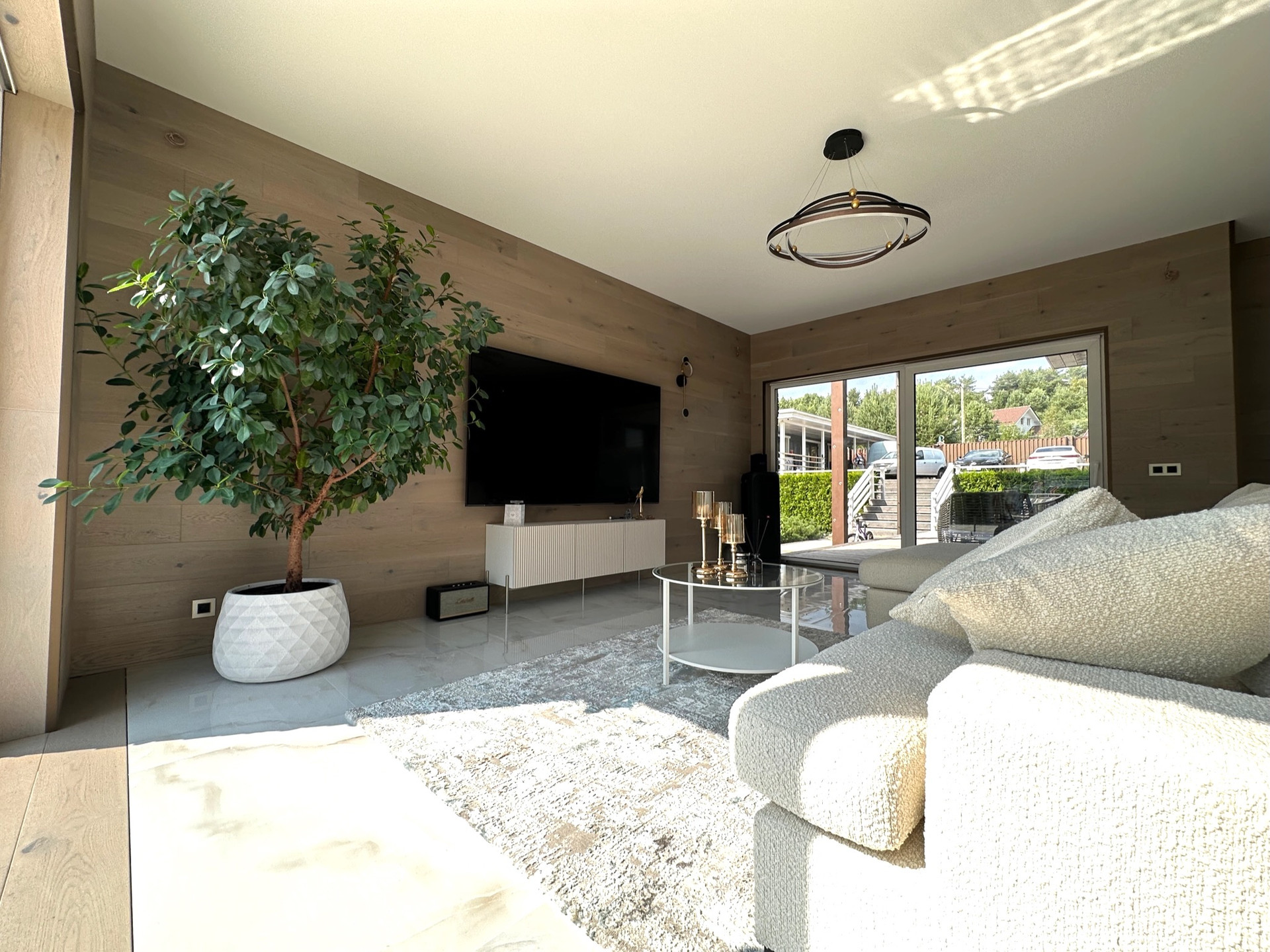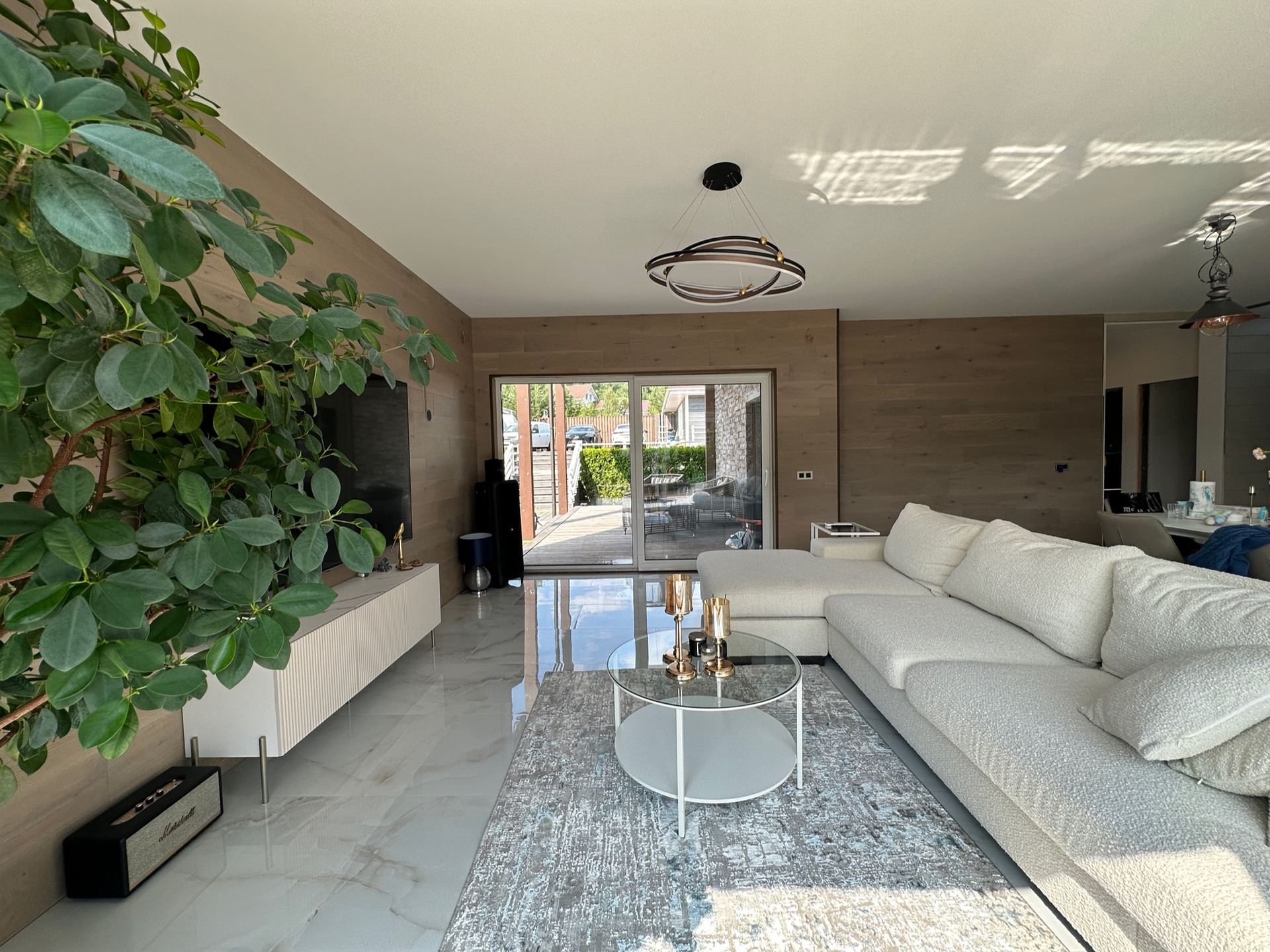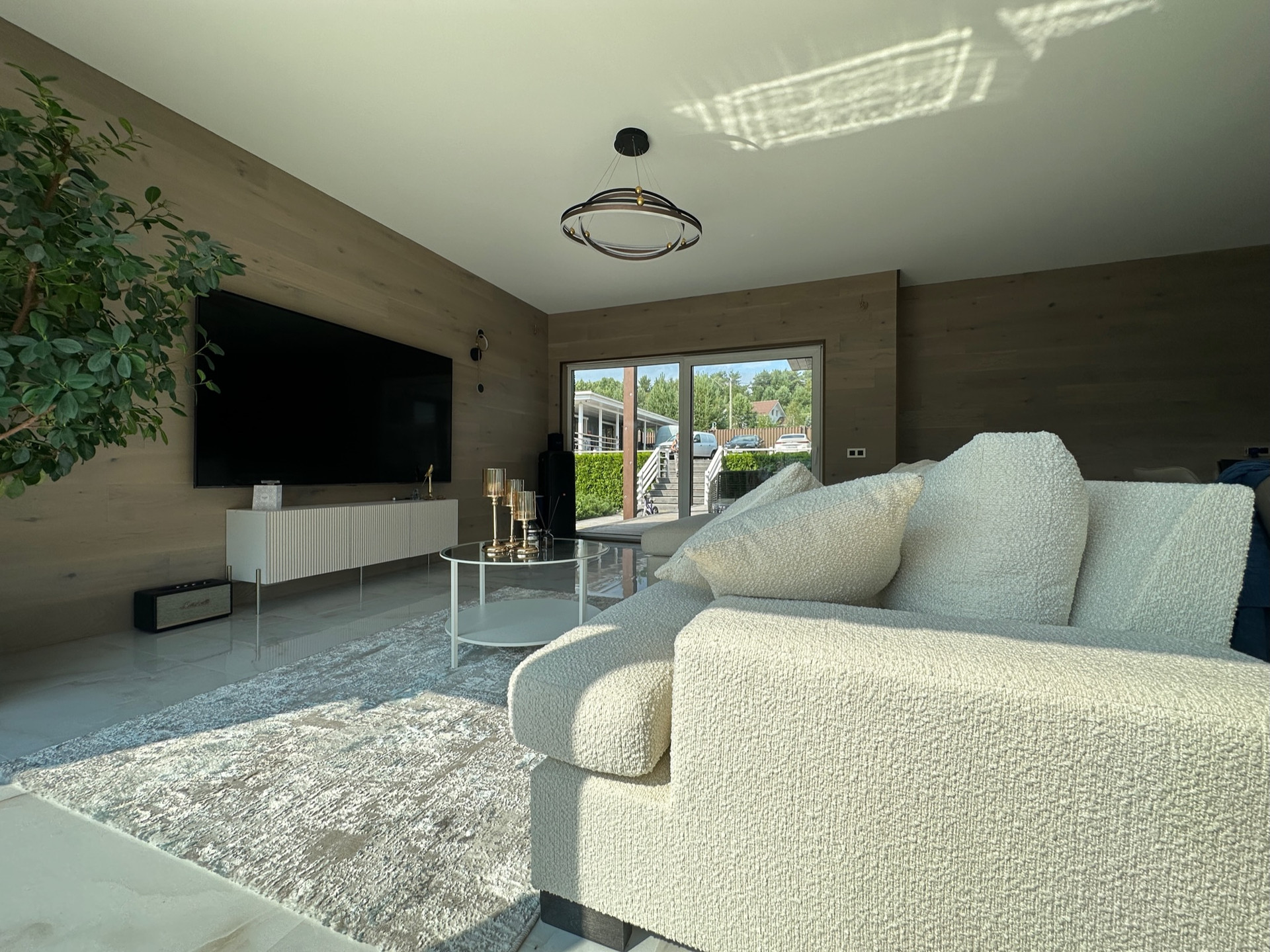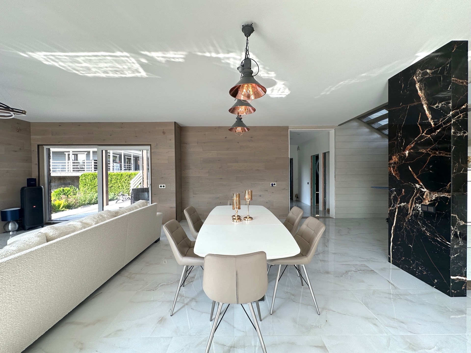 Такое решение дает много света и воздуха в доме, а также замечательные виды на участок с ландшафтным дизайном, зону барбекю и прочие строения из любого помещения.