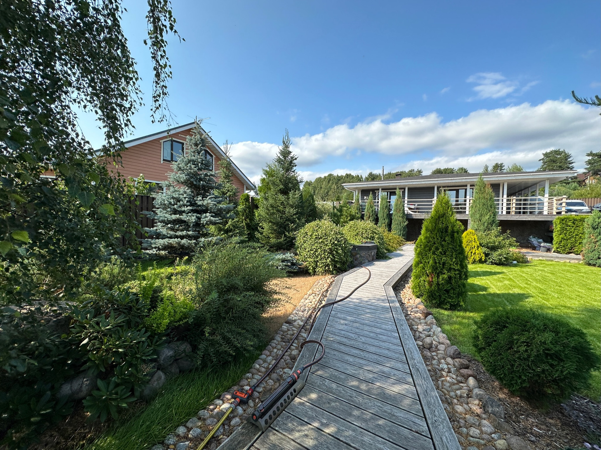 - Газон разделен на две территории, где посажены многолетние виды растений
