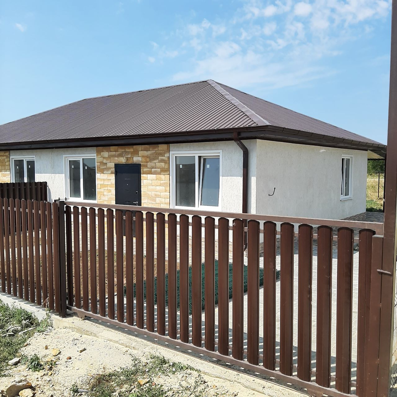 Двор: тротуарная плитка (дорожка к дому и парковочное место), навес,  фасадный забор (металлоштакетник) с откатными воротами и калиткой. По периметру огражден сеткой.К