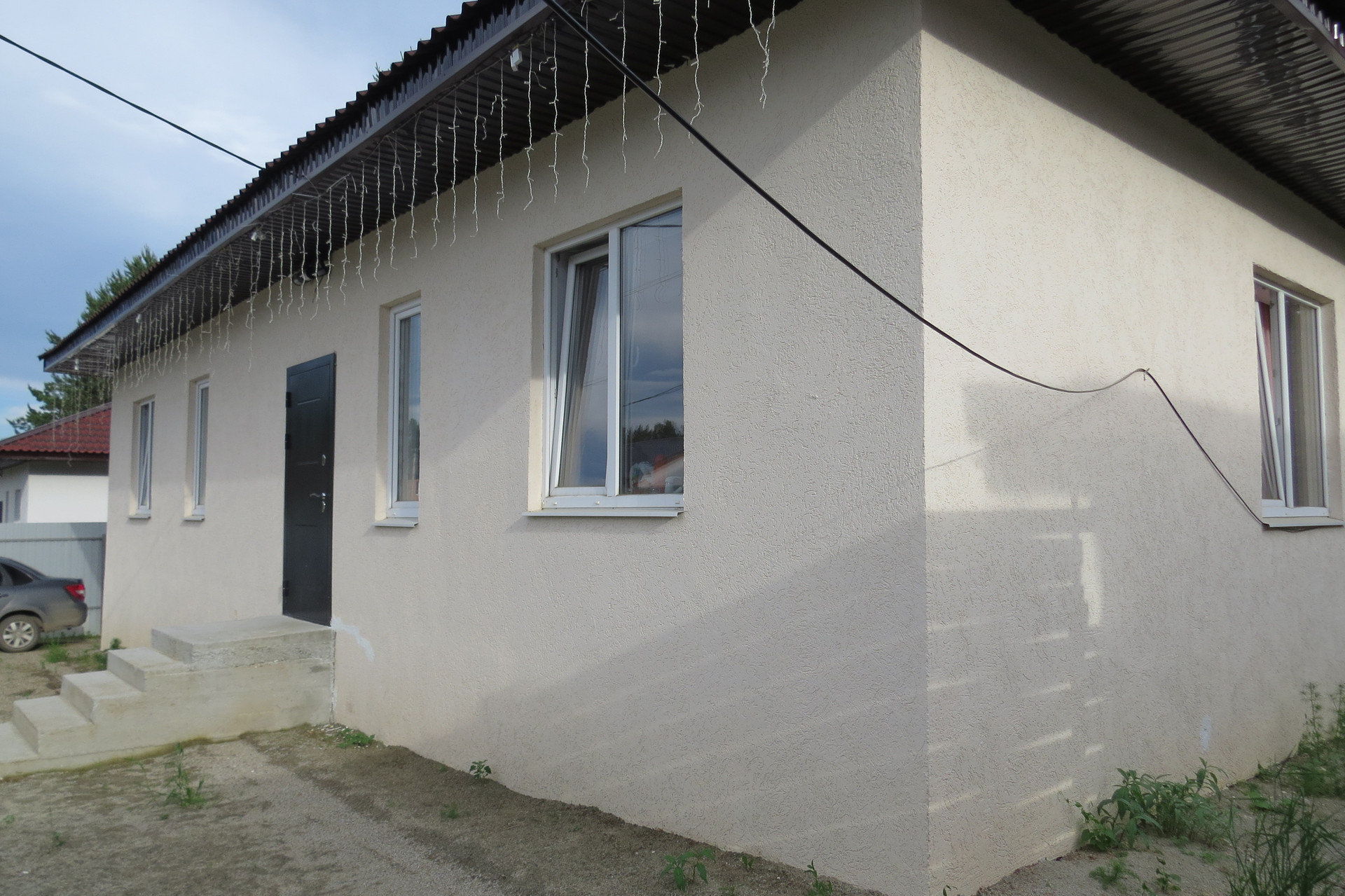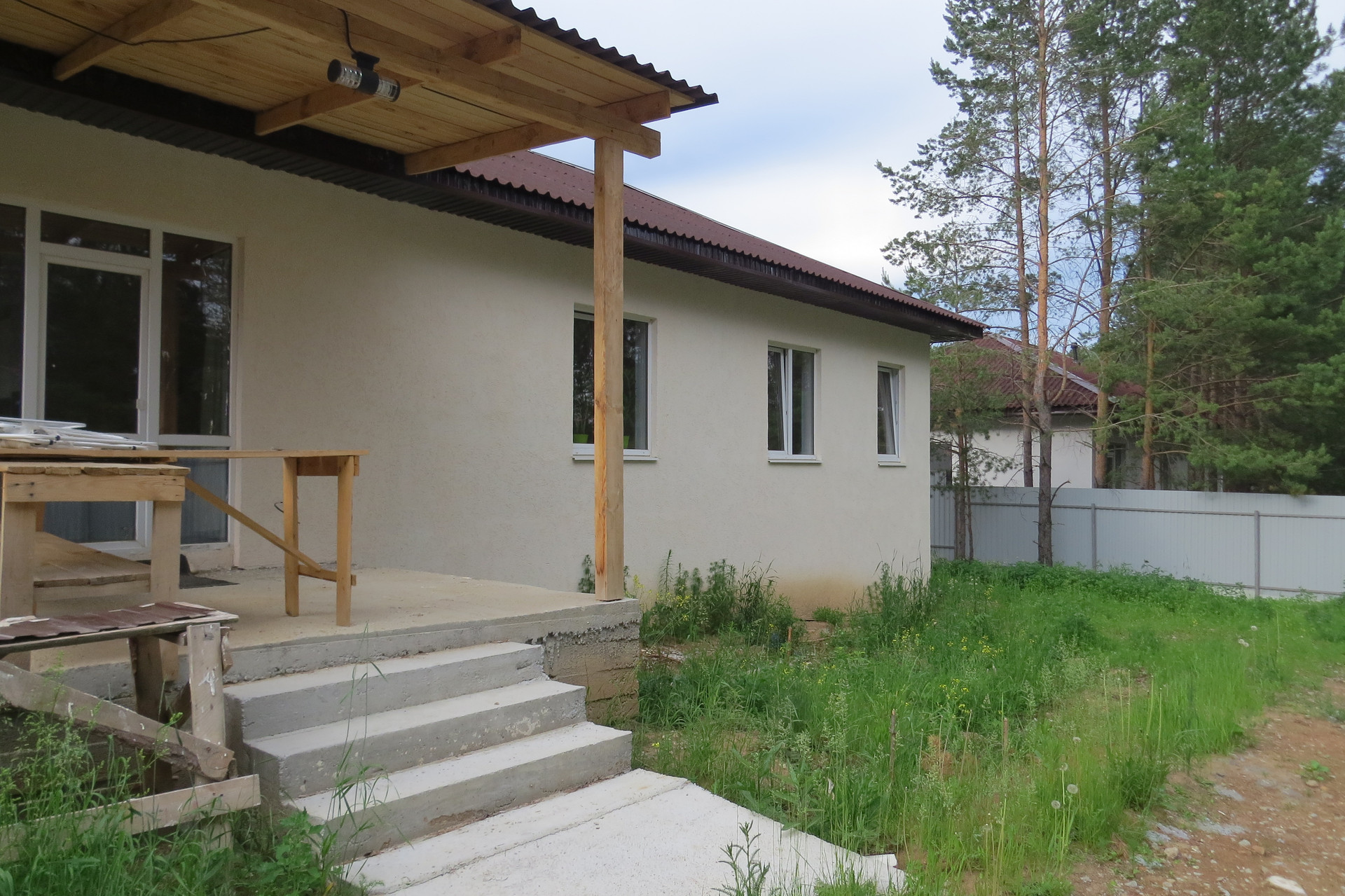 Фундамент: монолитная плита с пятью ребрами жесткости в виде ростверка расположенными на буро-заливных сваях из бетона. Кровля металлочерепица.