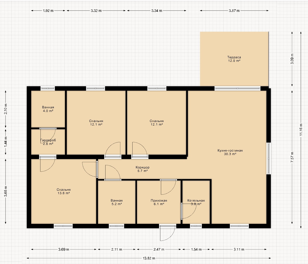 Функциональная планировка: 3 изолированные спальни, в одной из которых предусмотрена гардеробная и сан узел + просторная кухня - гостиная с панорамным остеклением и выходом на террасу. Большой с/у.