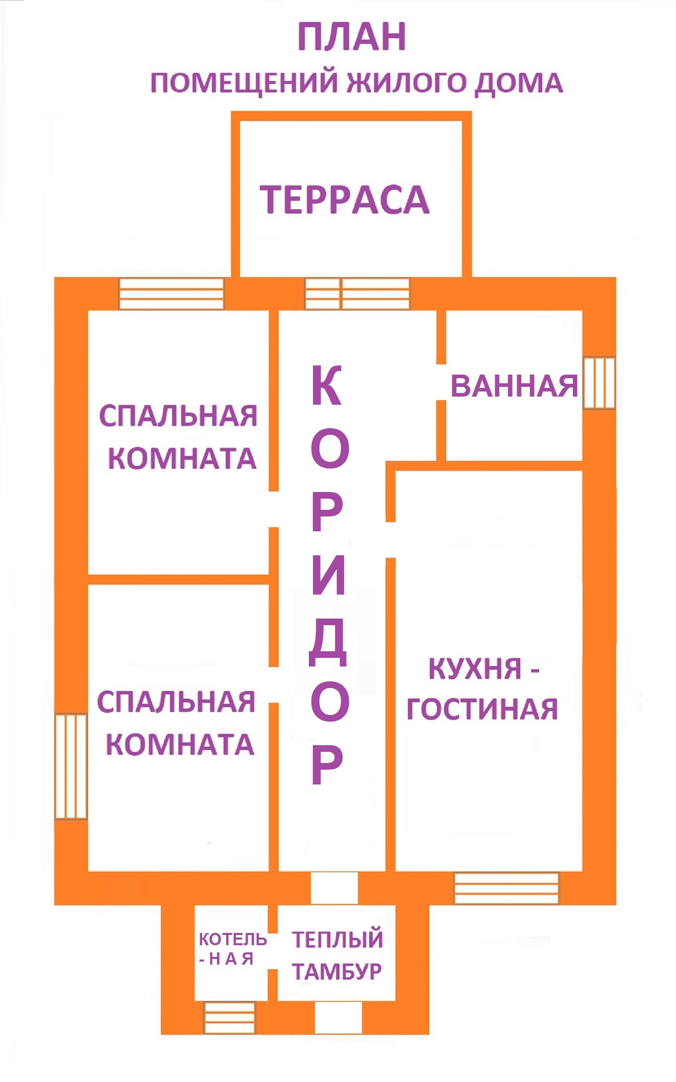 В доме 8 помещений: 3 жилых комнаты до 20 кв.м., кухонная зона, санузел, котельная зона, теплый тамбур, коридор, холодная кладовая.