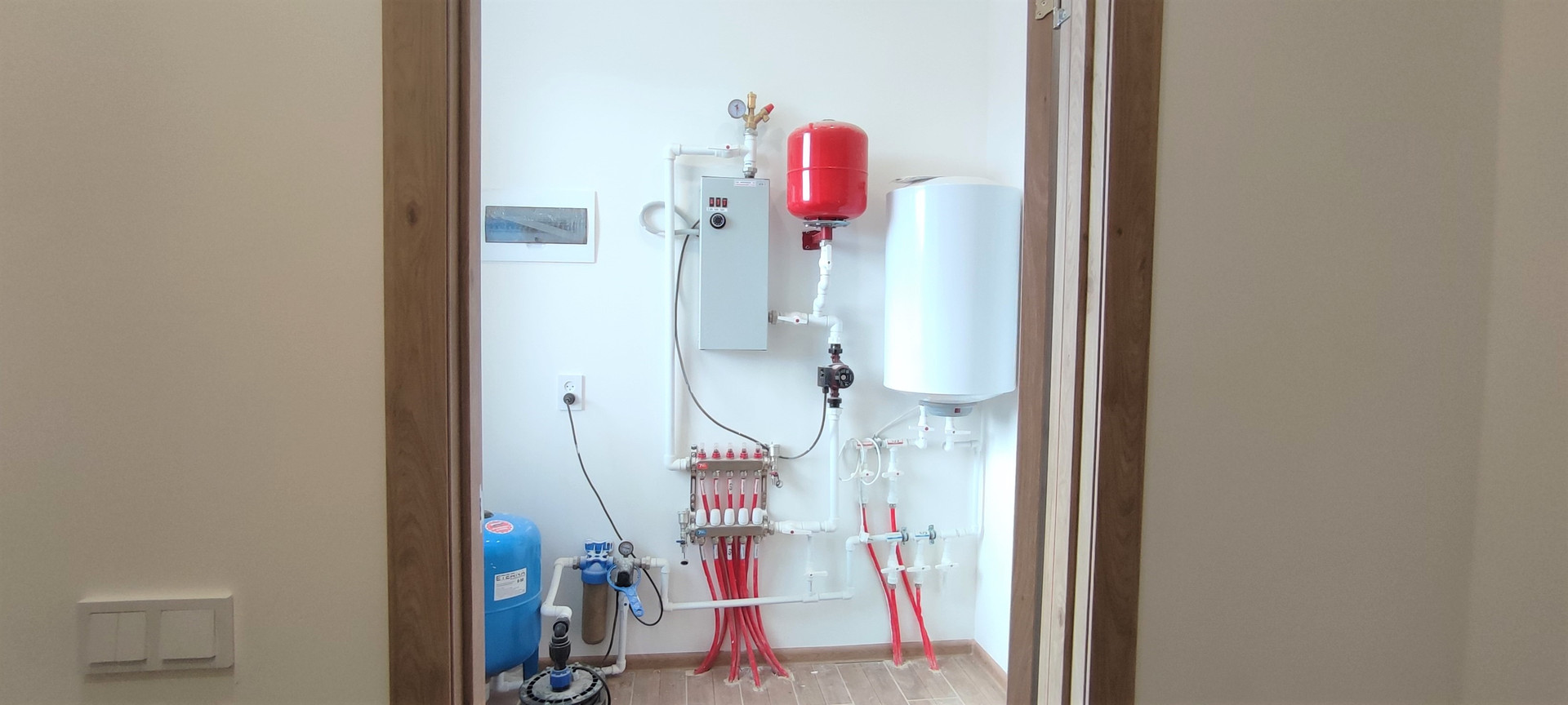 Котельная полностью укомплектована необходимым оборудованием: скважина 80 метров (артезианская вода), автономная станция водоснабжения с расширительным баком и центробежным глубинным насосом, бойлер для подачи горячей воды, трёхфазный жидкостный электрокотел, электрощиток с современными защитными автоматами, септик-дренаж.