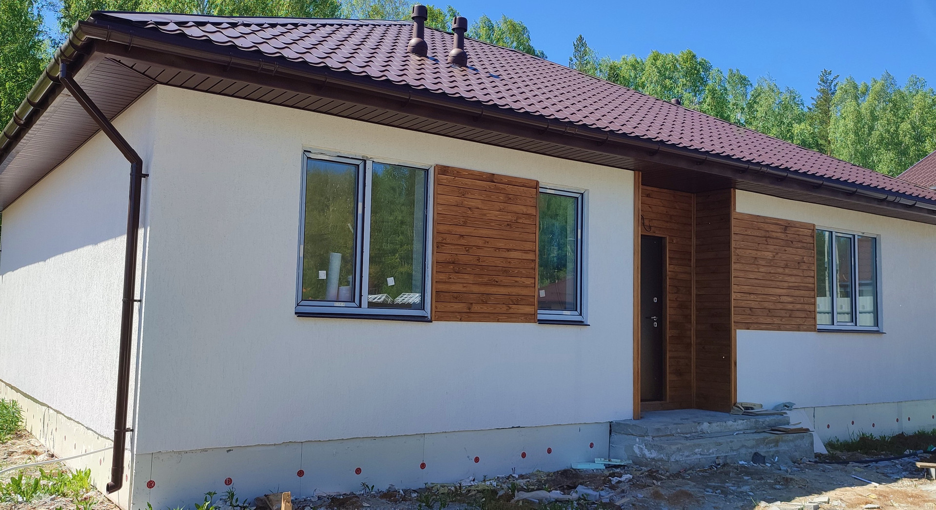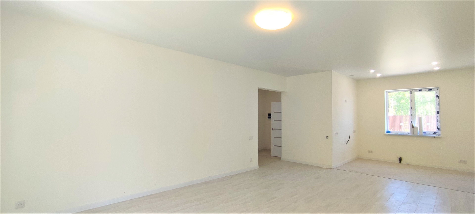 Большая гостиная с кухонной зоной панорамными окнами и выходом во двор. 3 просторных спальных комнаты, ванная комната, гардеробная, котельная, прихожая и 2 коридора.