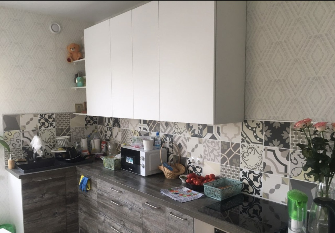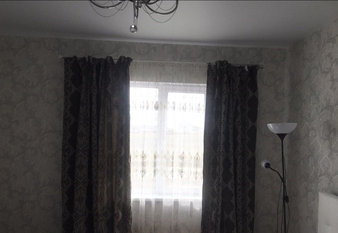 Остаётся кухонный гарнитур, варочная поверхность и духовка, диван, ковёр.