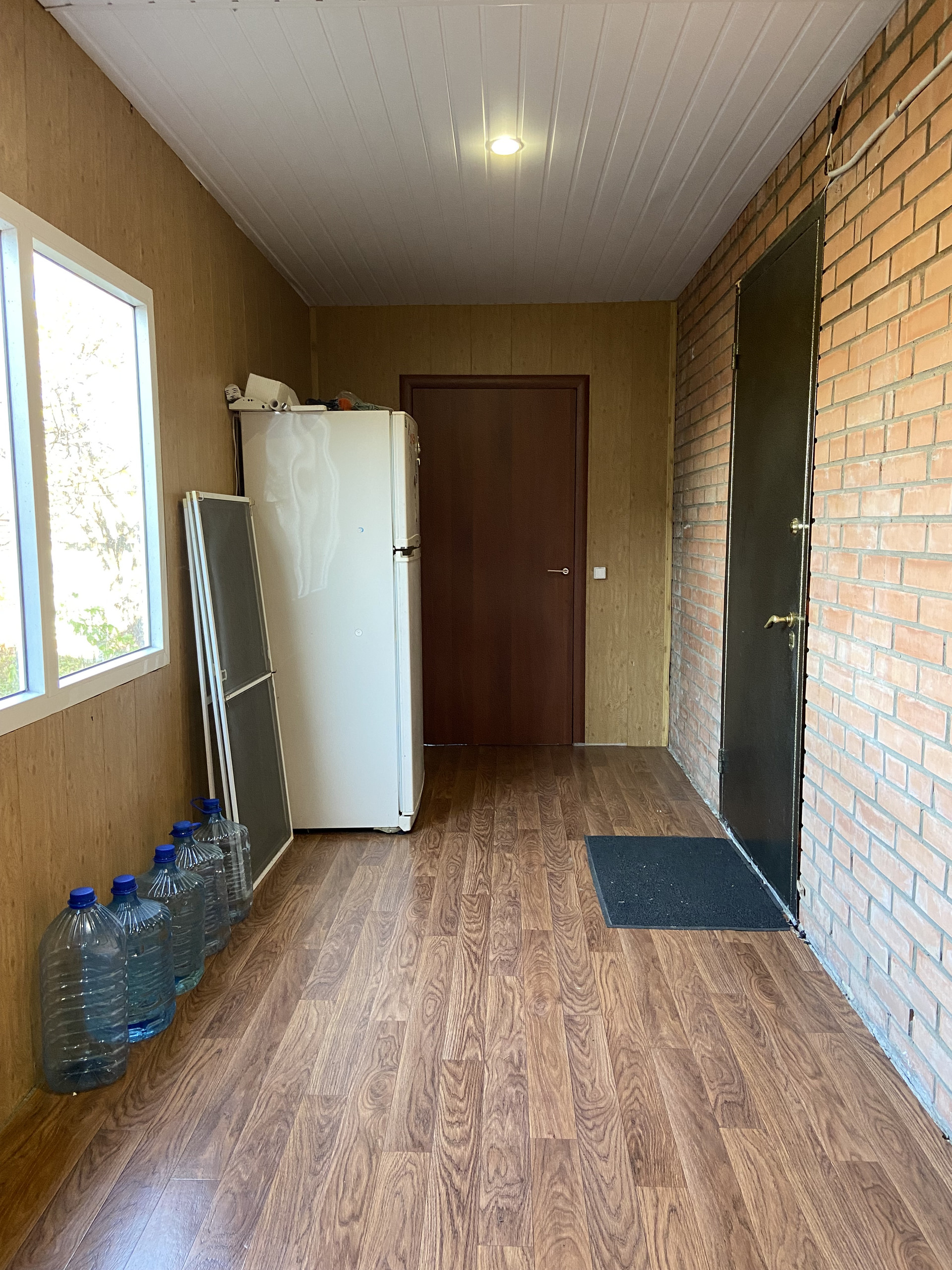 Вход в дом под навесом; большой кирпичный пристрой к дому, в котором расположены гараж, баня, кладовая комната, погреб.