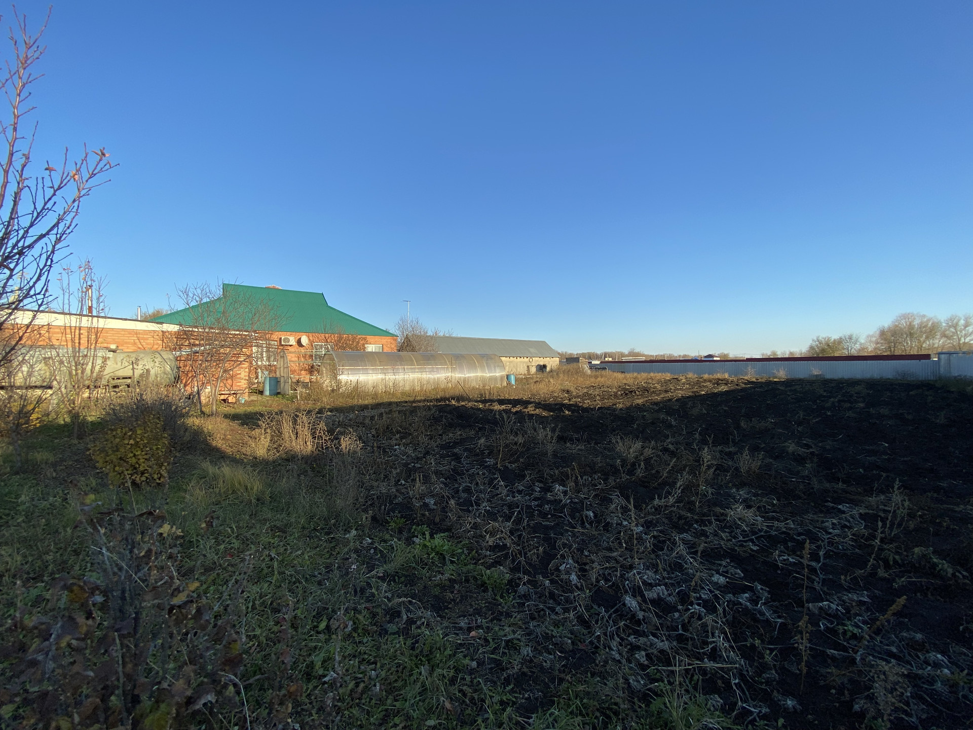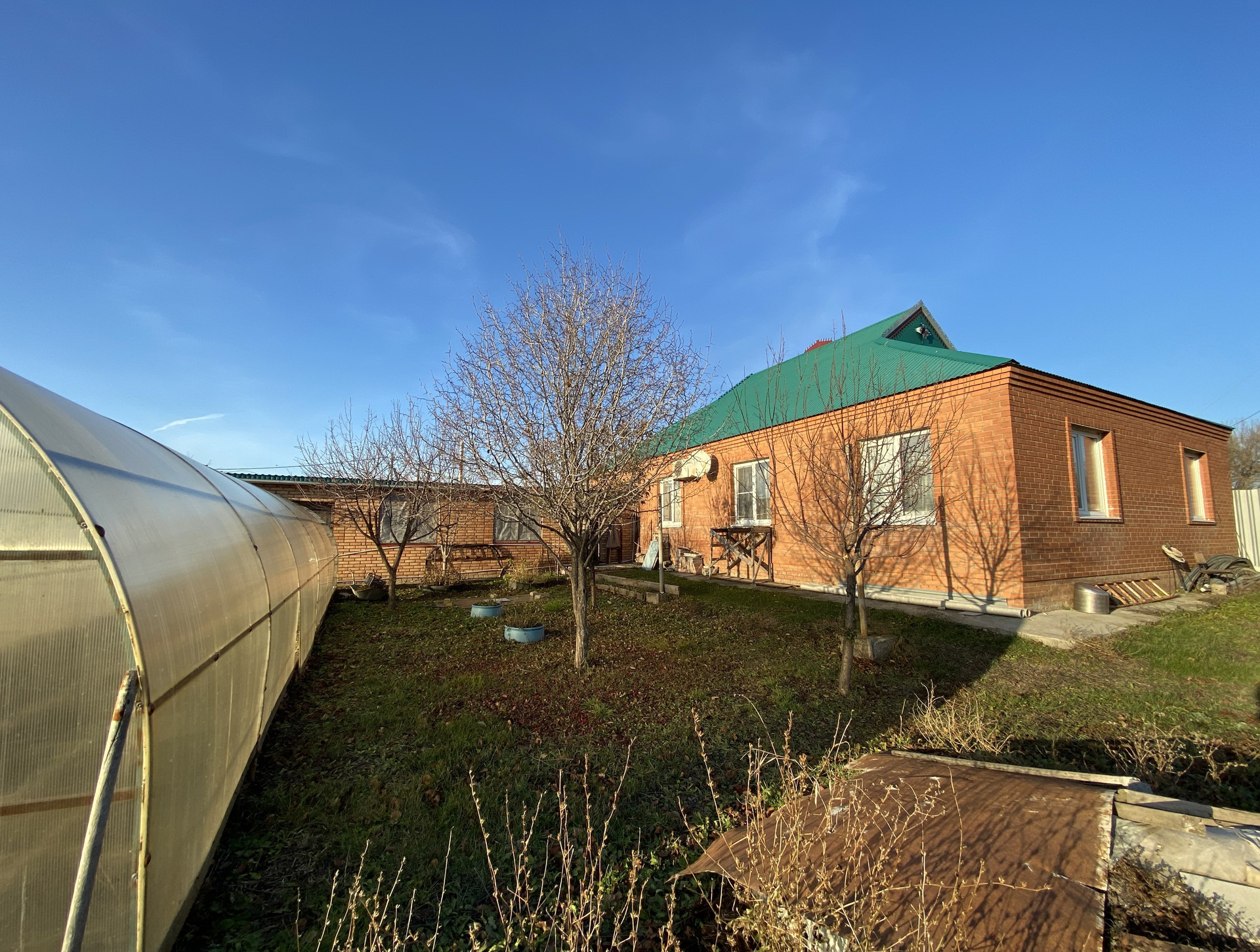 На участке плодовый сад, теплица, бак для воды и большое подсобное кирпичное помещение (сарай/хранилище) примерно 60кв.м.