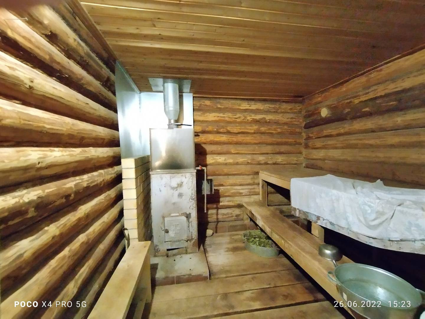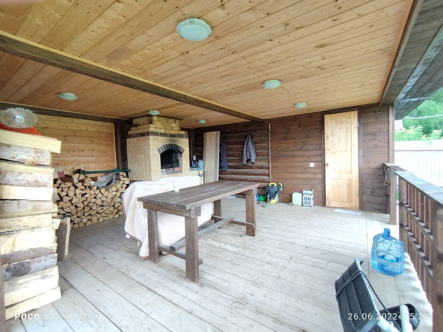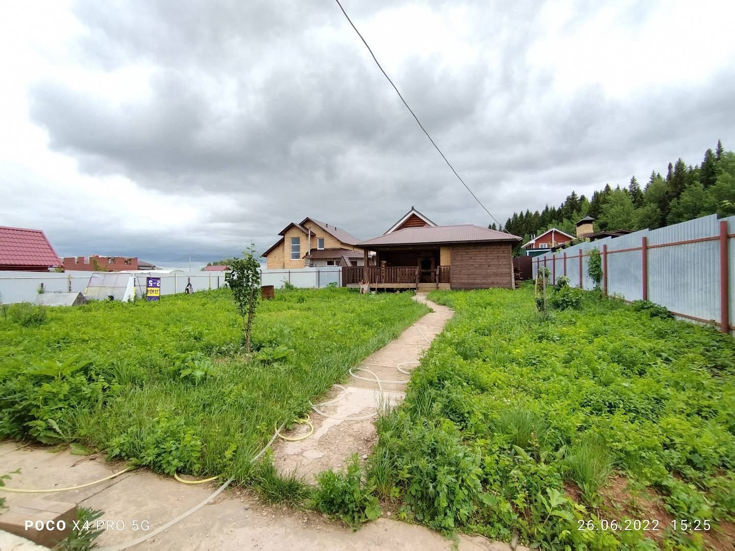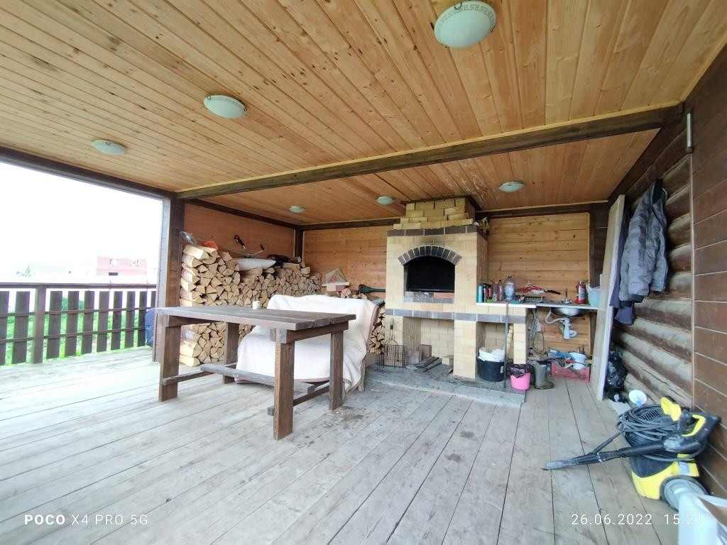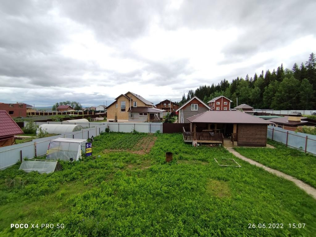 Территория ровного земельного участка правильной формы. На участке разместились действующая баня с верандой и зоной барбекю, теплица, залит фундамент для гаража. Забор по всему периметру, хороший подъезд к дому. Рядом, в 70 метрах от дома, лес.