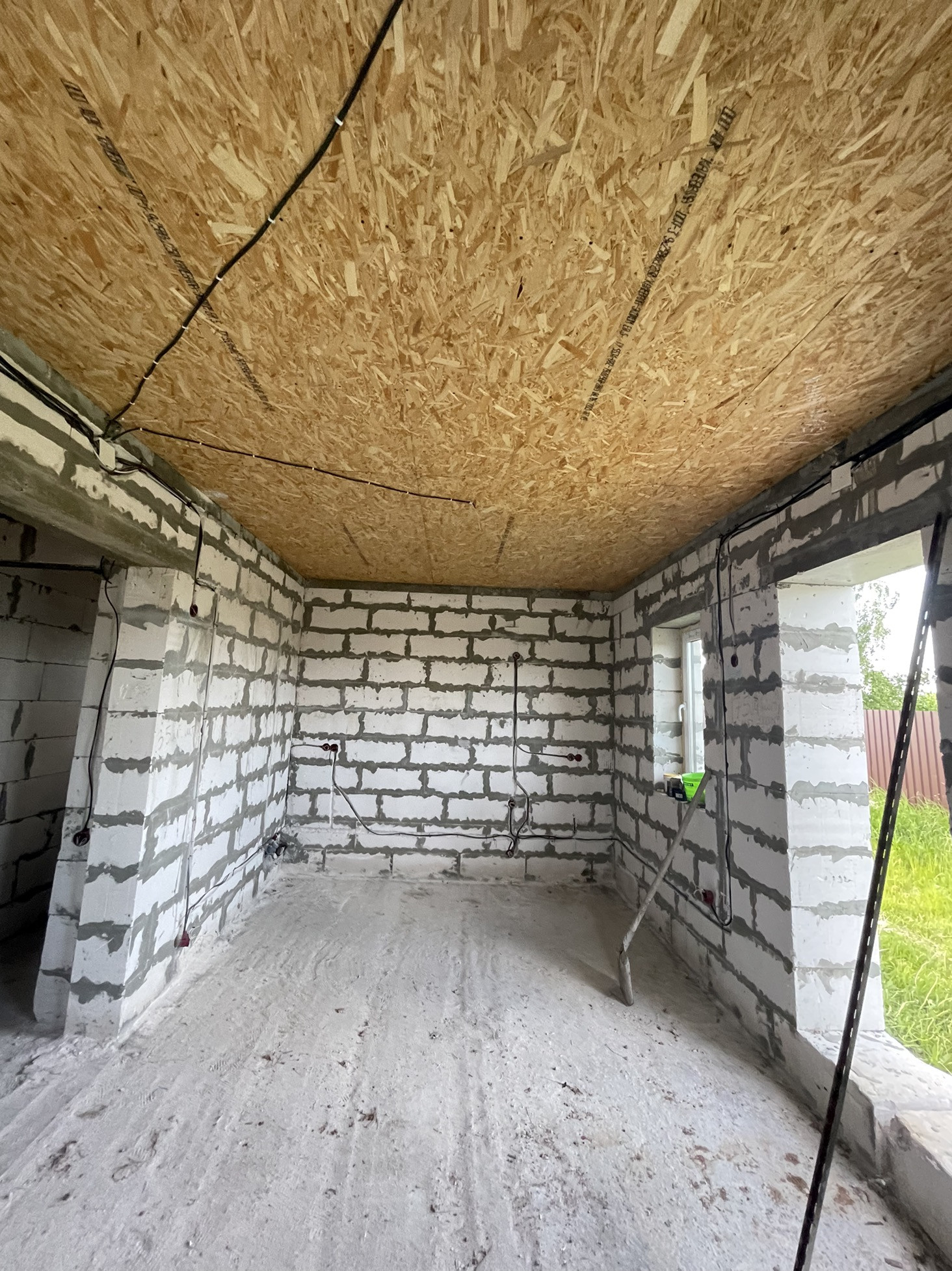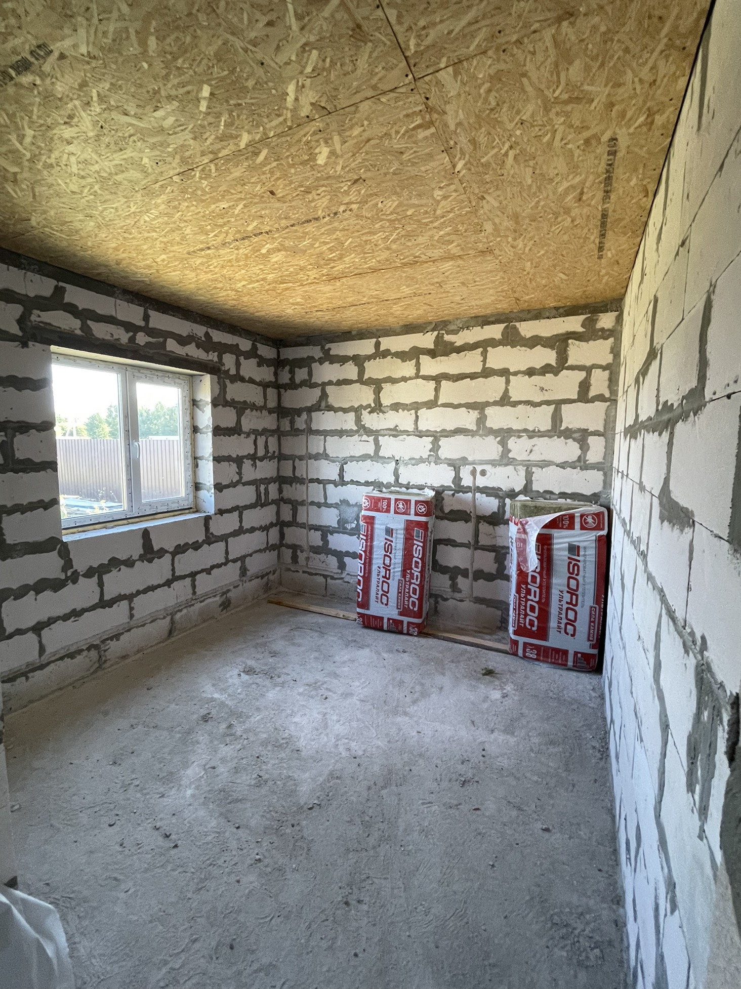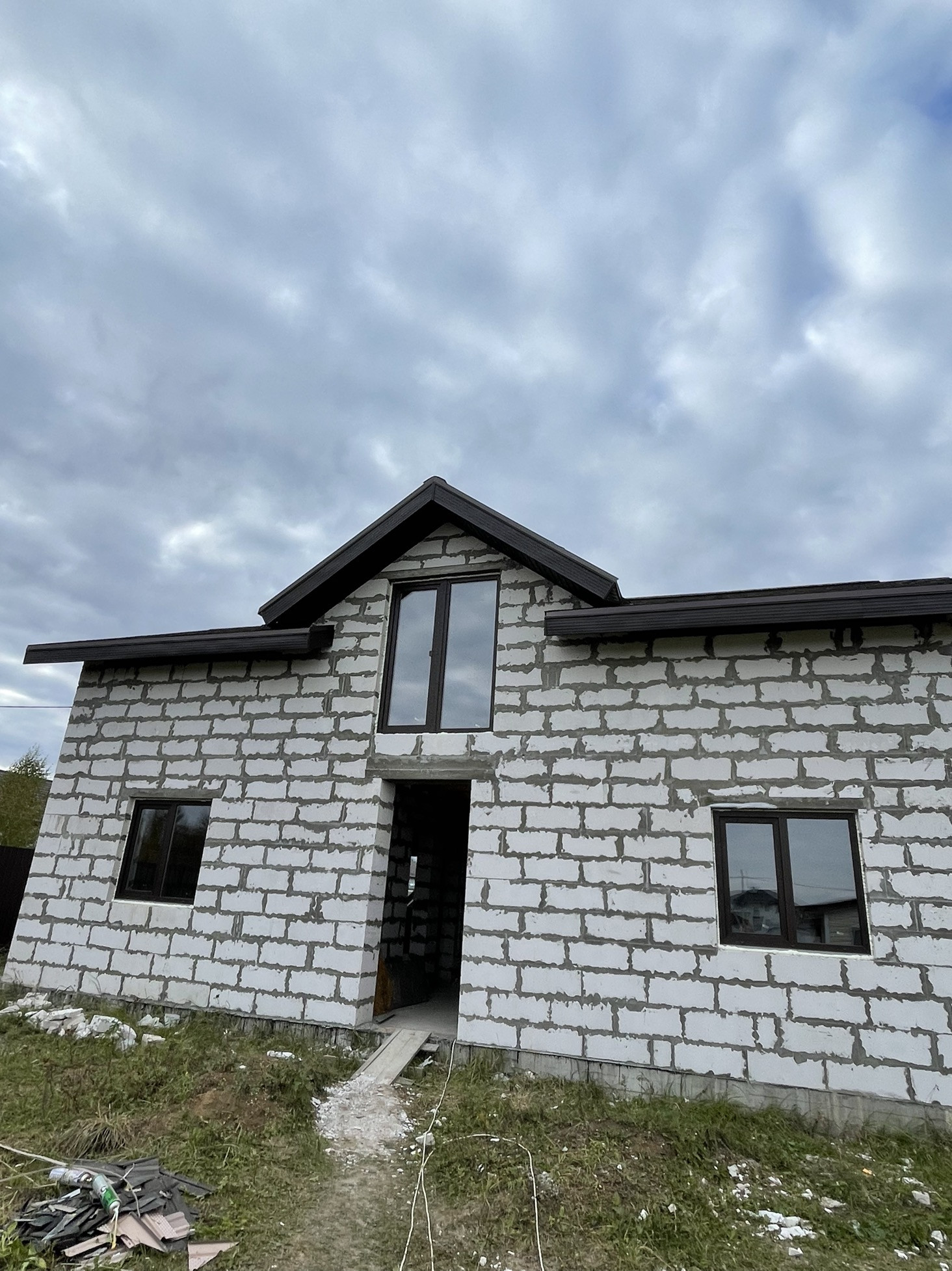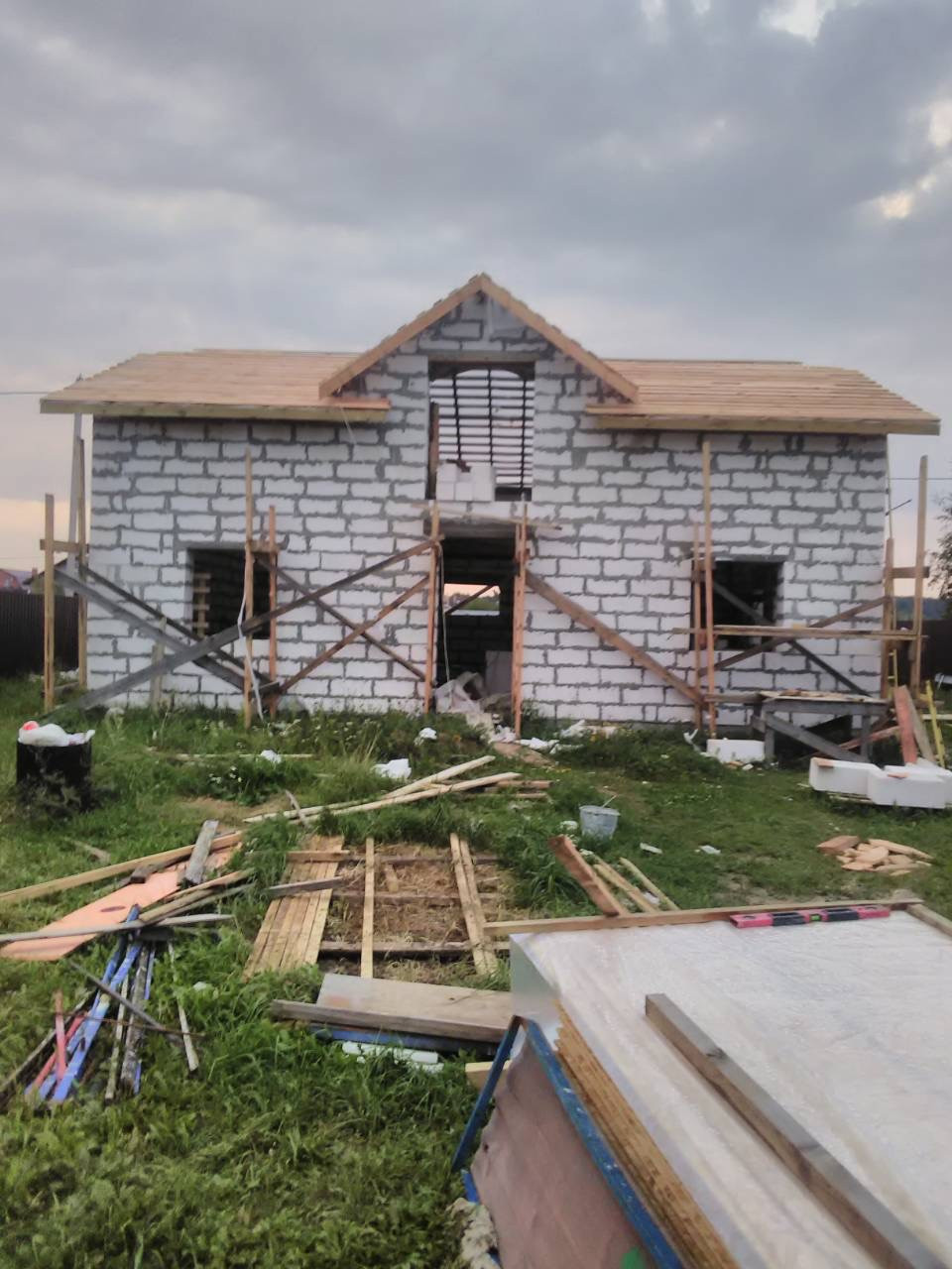 В доме сделана электрика , коммуникаций , вода , газ , канализация в доме , два сан узла , крыша мягкая кровля с 15см утеплитель с пароотводном , потолок крыши и первого этажа зашит ОСБ 12мм , пол утеплитель 15 см + лаги + ОСБ.
