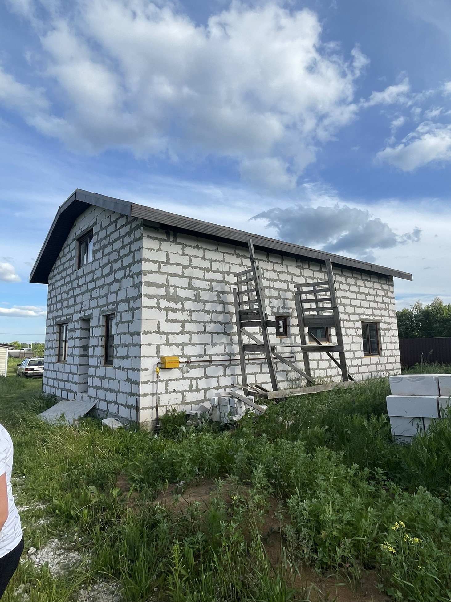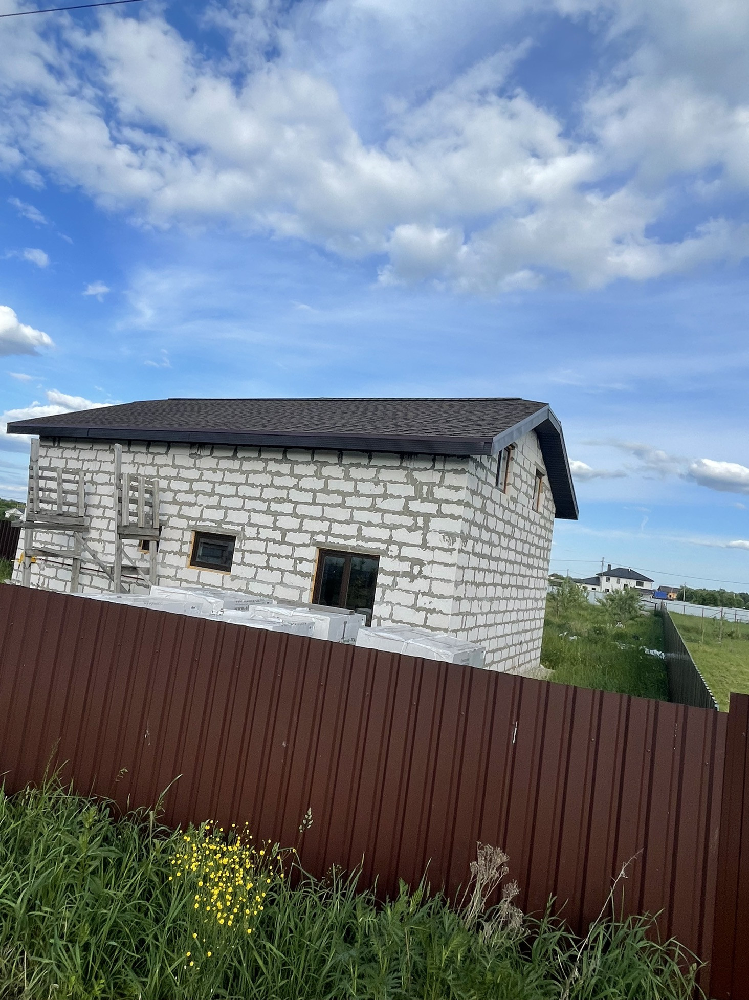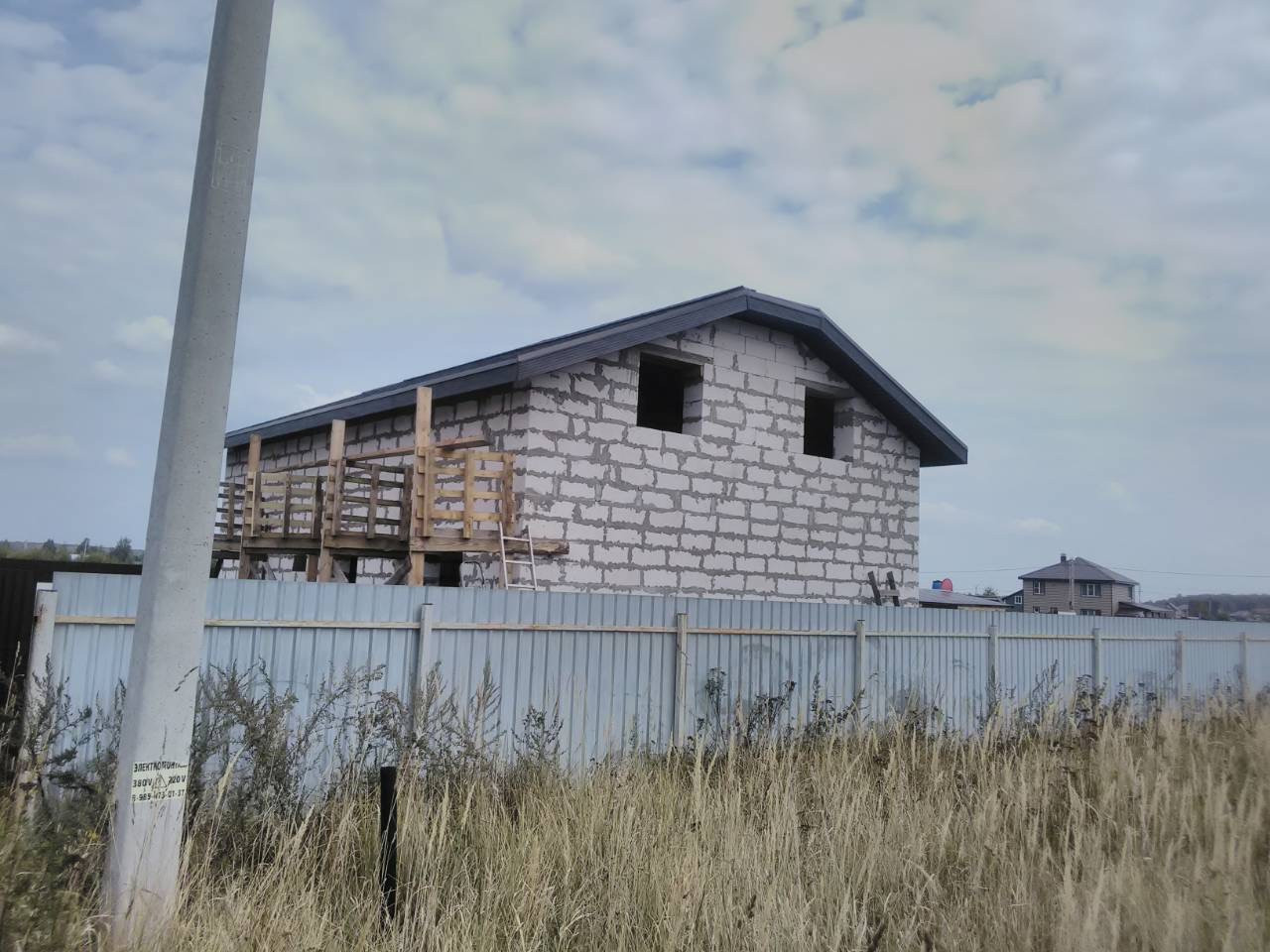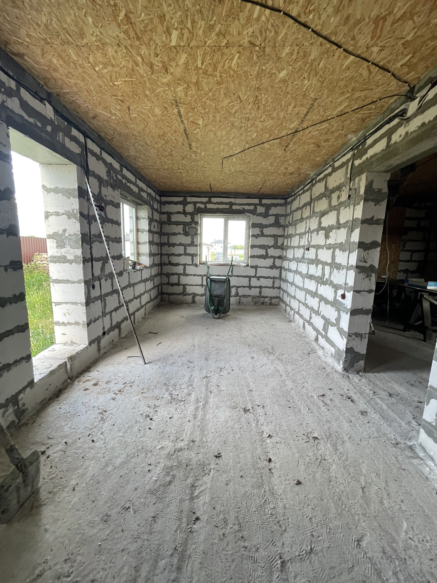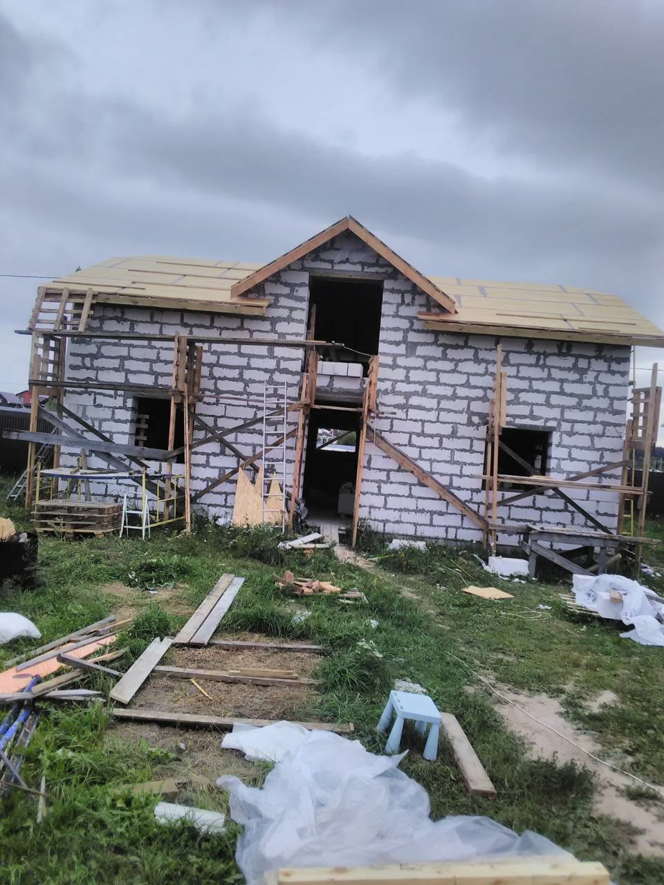 В доме сделана электрика , коммуникаций , вода , газ , канализация в доме , два сан узла , крыша мягкая кровля с 15см утеплитель с пароотводном , потолок крыши и первого этажа зашит ОСБ 12мм , пол утеплитель 15 см + лаги + ОСБ.