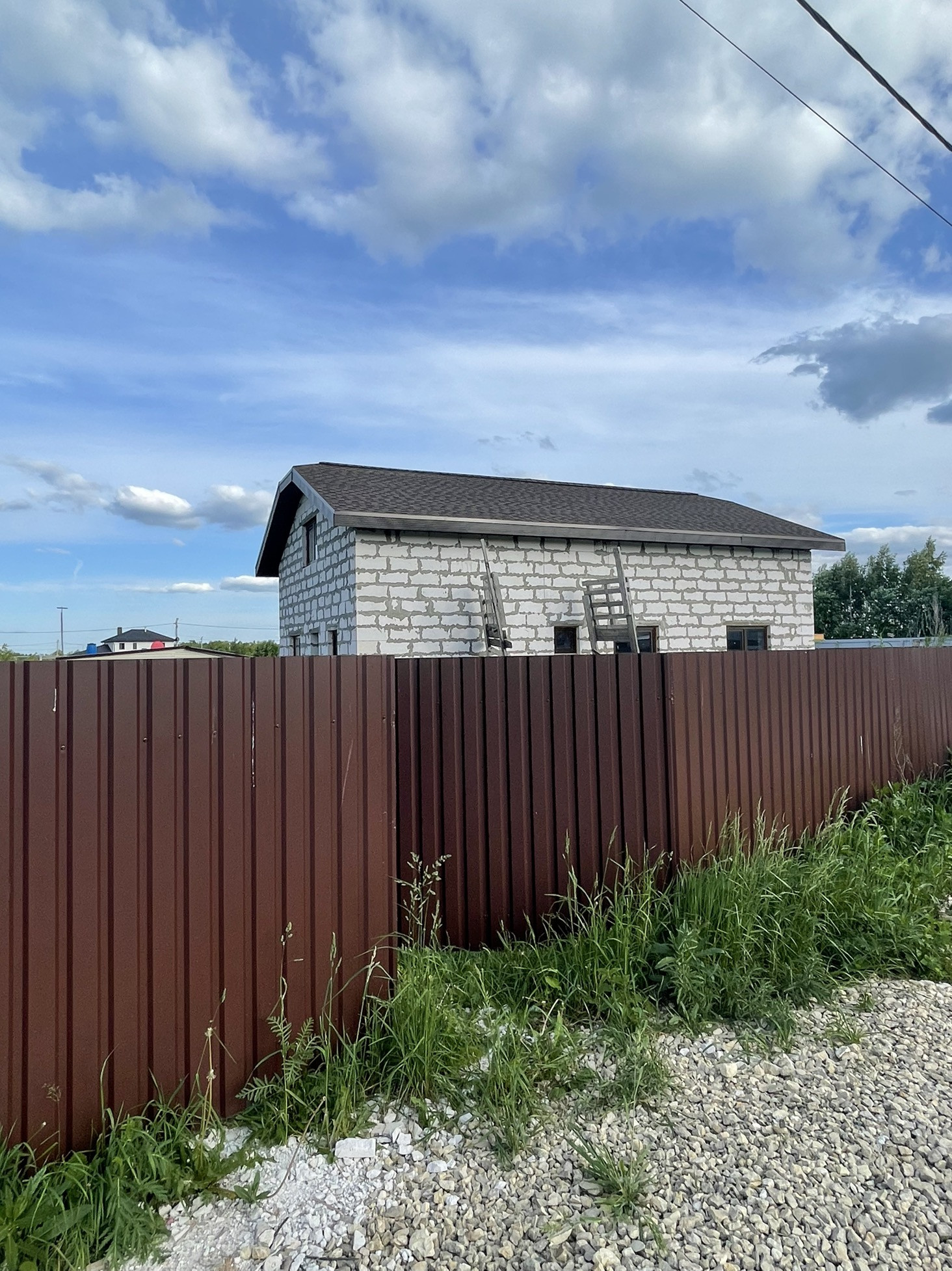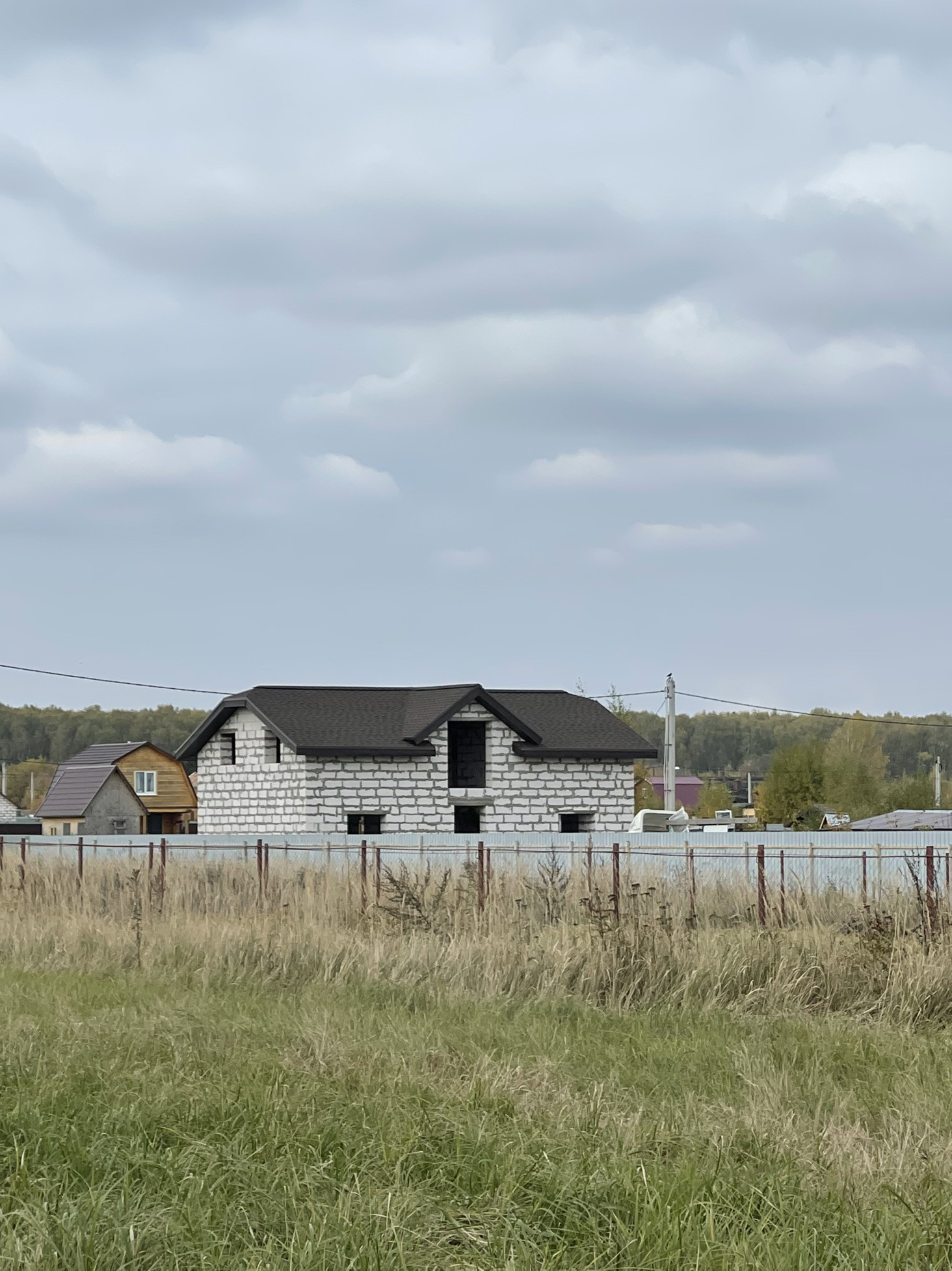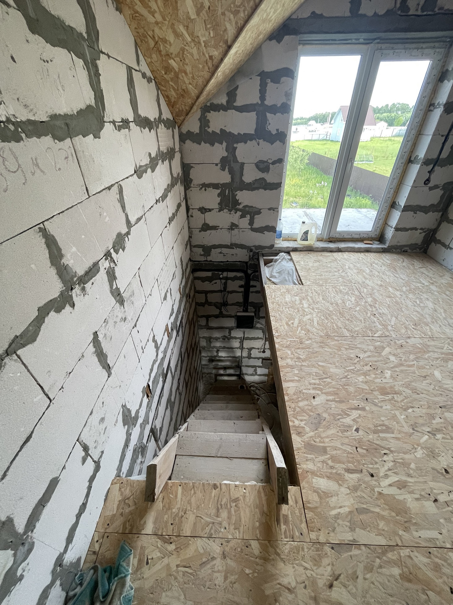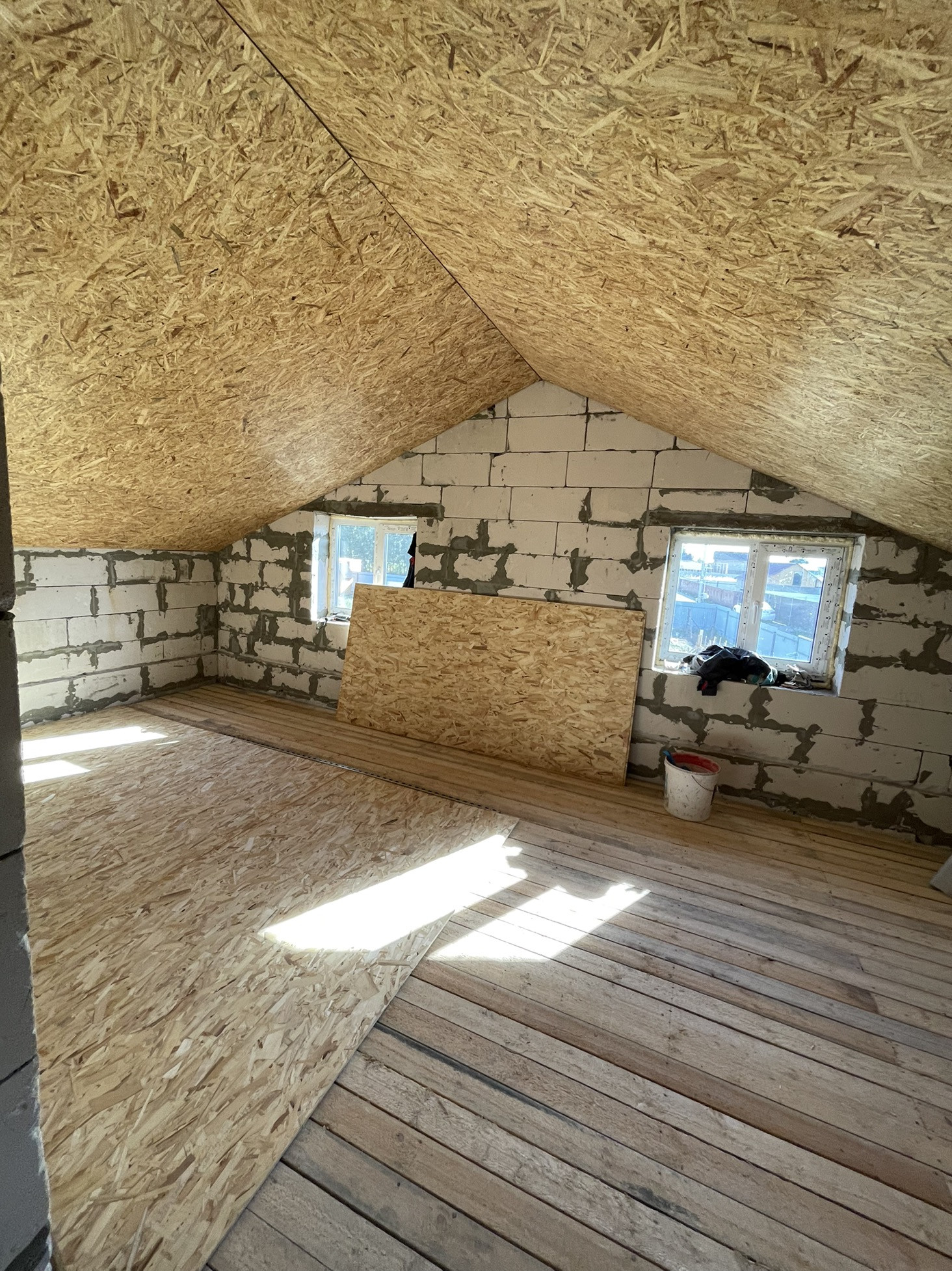 В доме сделана электрика , коммуникаций , вода , газ , канализация в доме , два сан узла , крыша мягкая кровля с 15см утеплитель с пароотводном , потолок крыши и первого этажа зашит ОСБ 12мм , пол утеплитель 15 см + лаги + ОСБ.