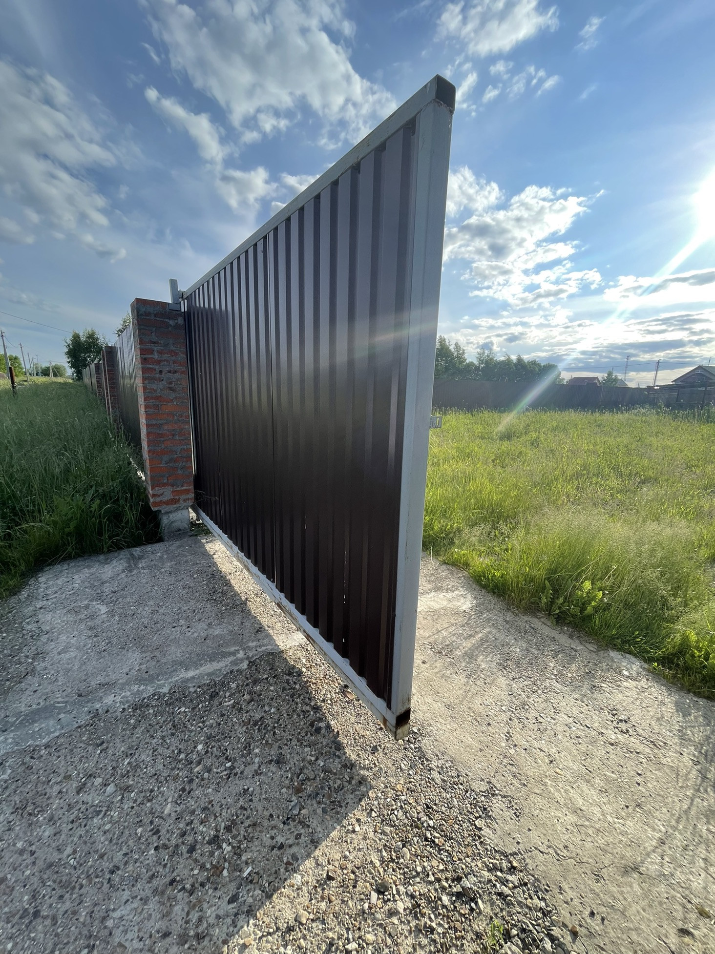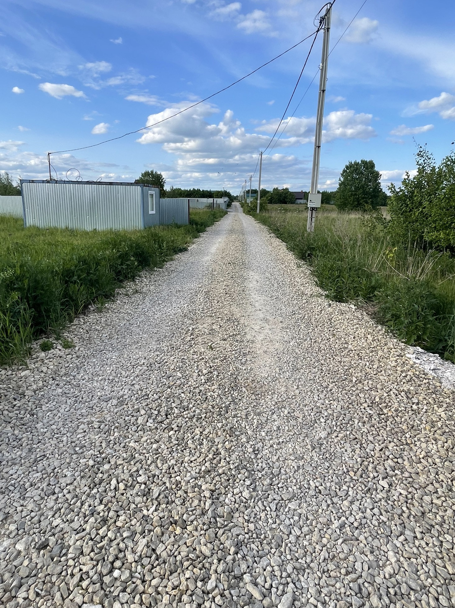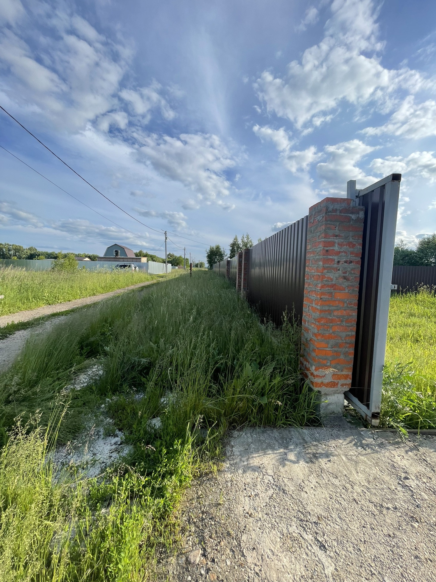 Заезд с двух сторон , дорога засыпана гравием с одной стороны с другой Асфальтная Крошка , откатные ворота , распашные ворота , отступ от дороге предусмотрен , качественный забор по периметру 20 соток (участки разделены по 10 соток)