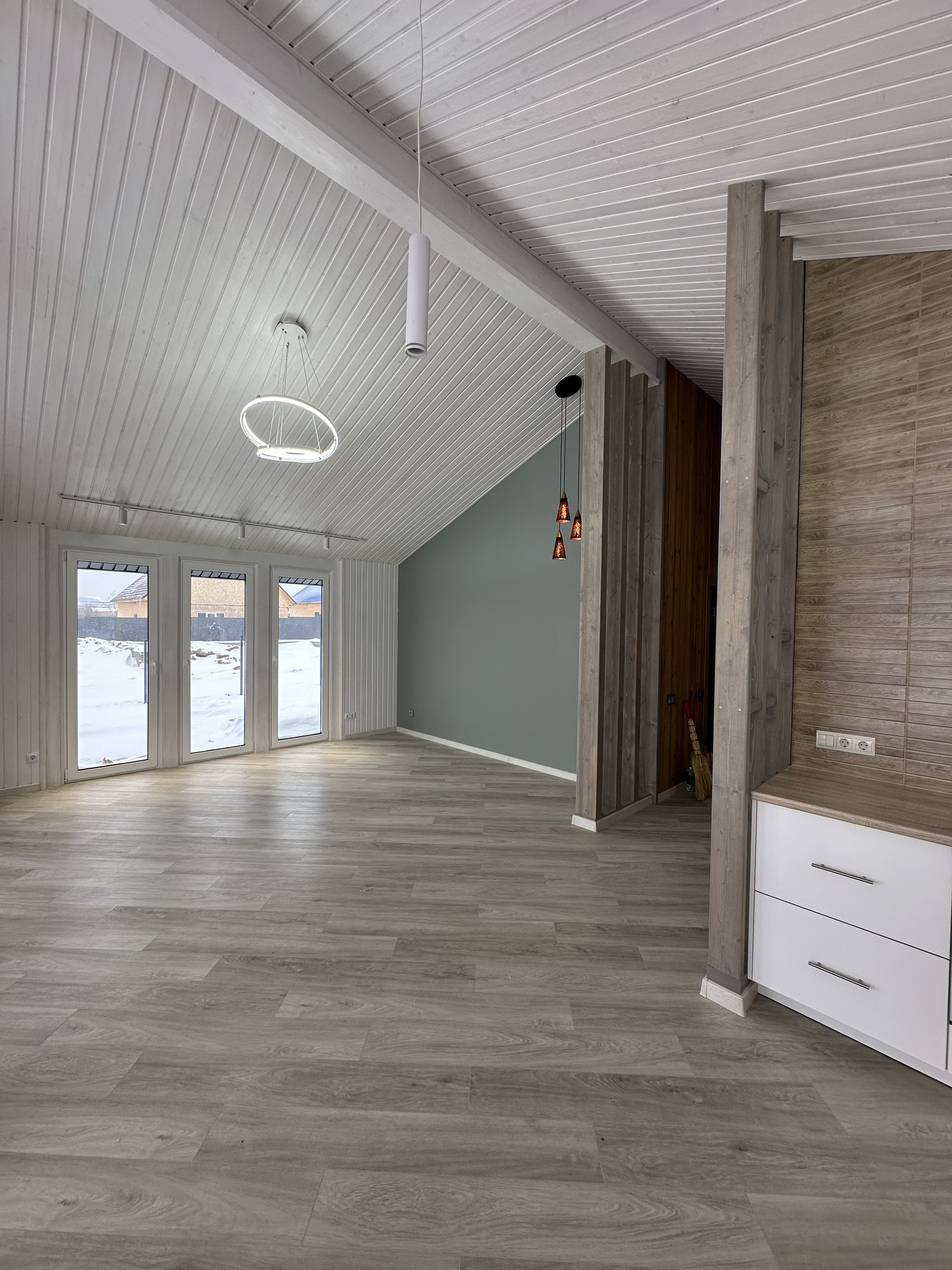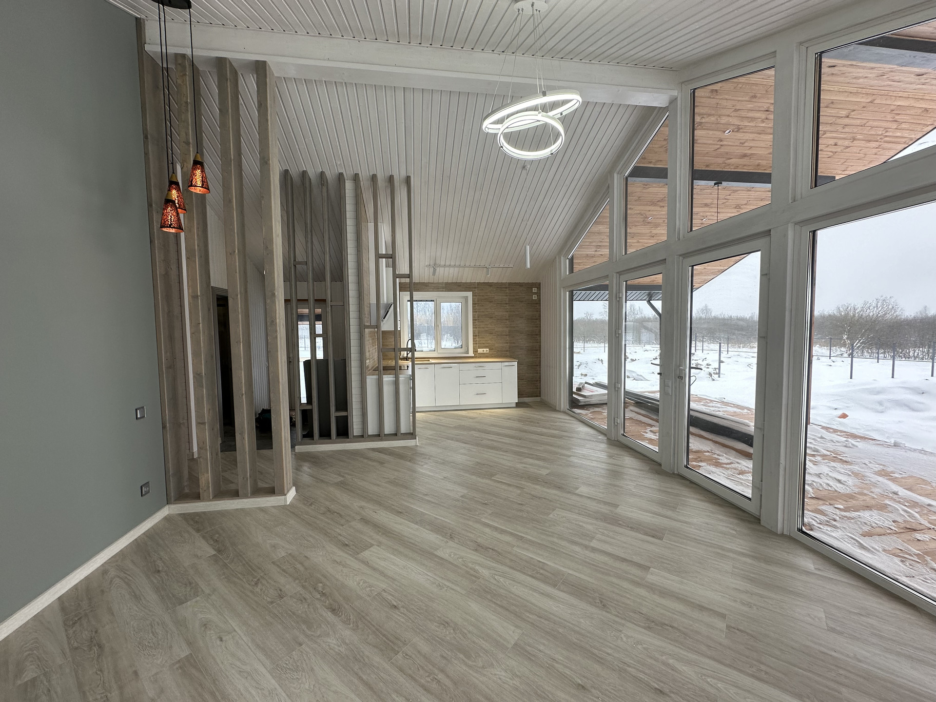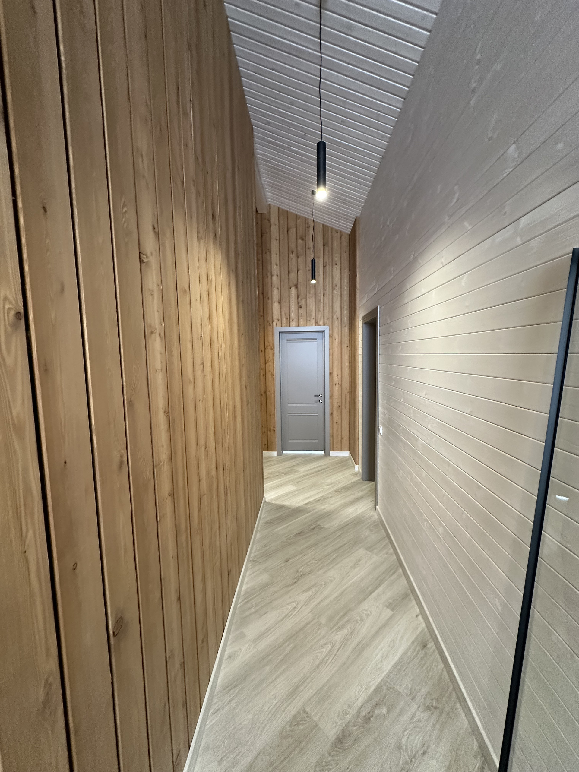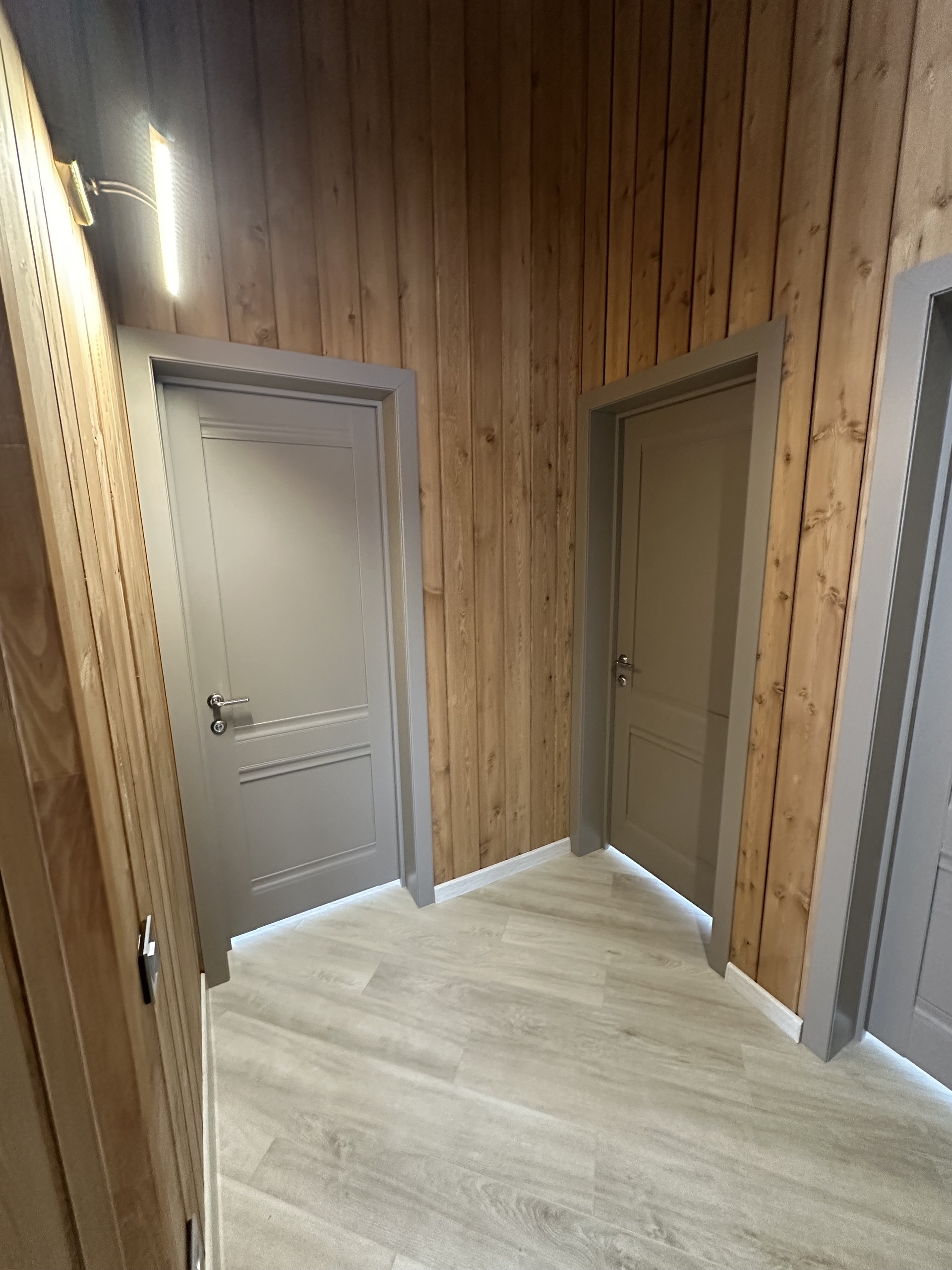 На полах кварцвиниловый ламинат 44класса одним полотном, без порогов- надежно, удобно без расширения, ощущения дерева под ногами