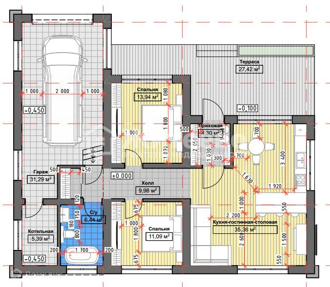 Площадь комнат: две спальни 14м2 и 11м2, кухня-гостиная 35м2