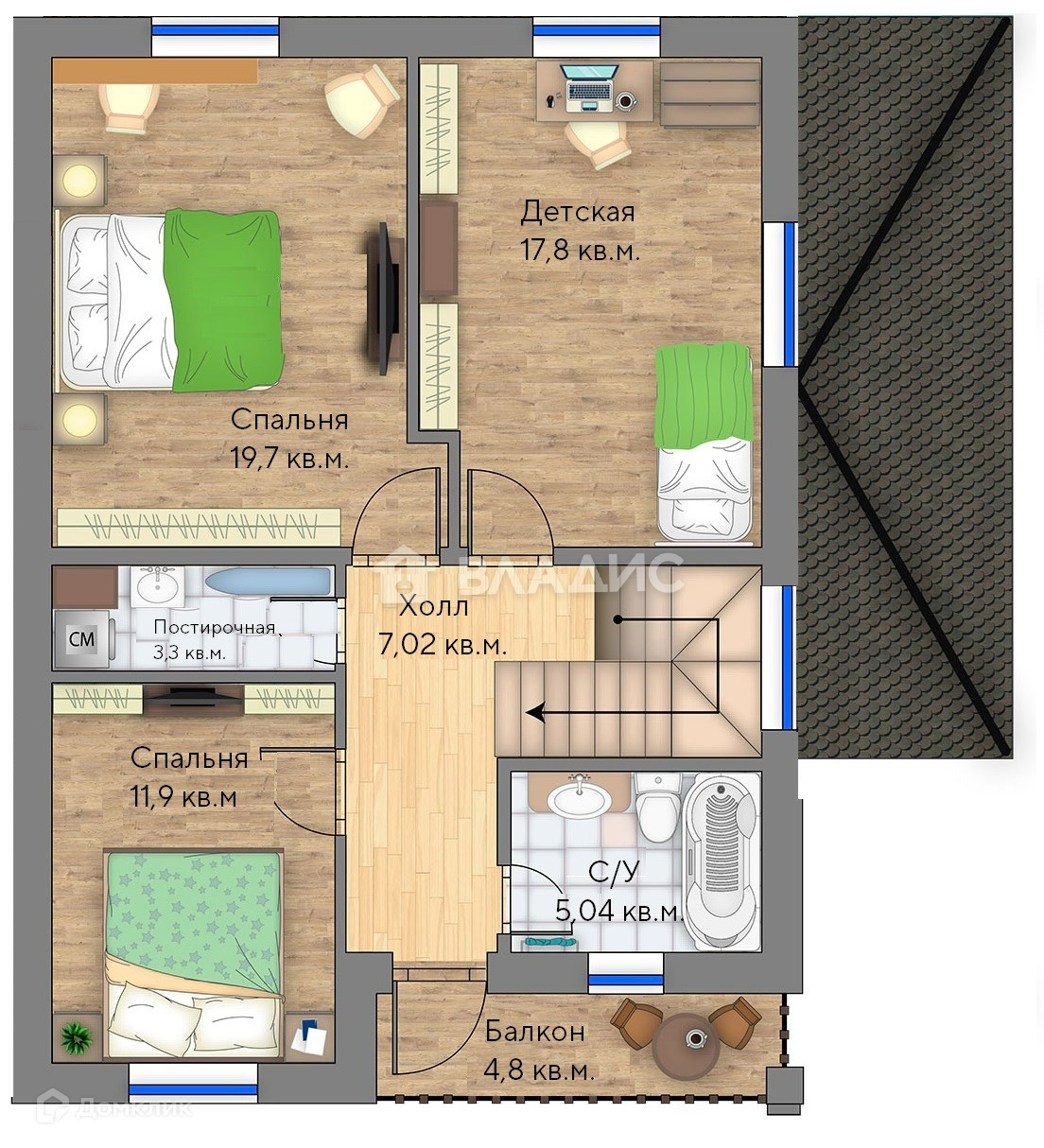 Планировка : кухня-гостиная с выходом на террасу, 4 спальни, 3 санузла, гардеробная, кладовая, балкон.