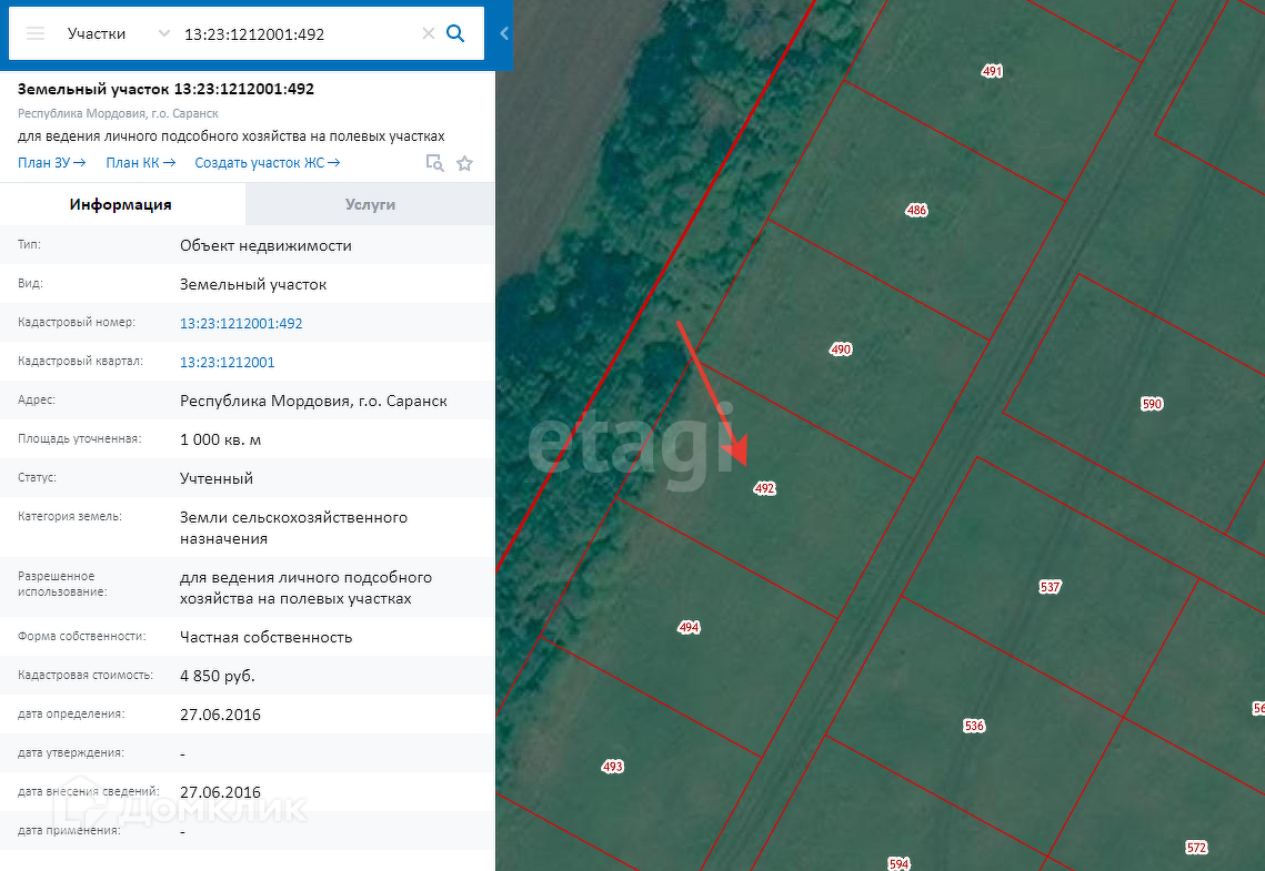 Земельный участок категории земель сельскохозяйственного назначения, границы на местности установлены, кадастровый номер 13:23:1212001:492, вид разрешенного использования - для ведения личного подсобного хозяйства на полевых участках. Участок ровный, земля не обработана, садовые деревья и кустарники отсутствуют.
