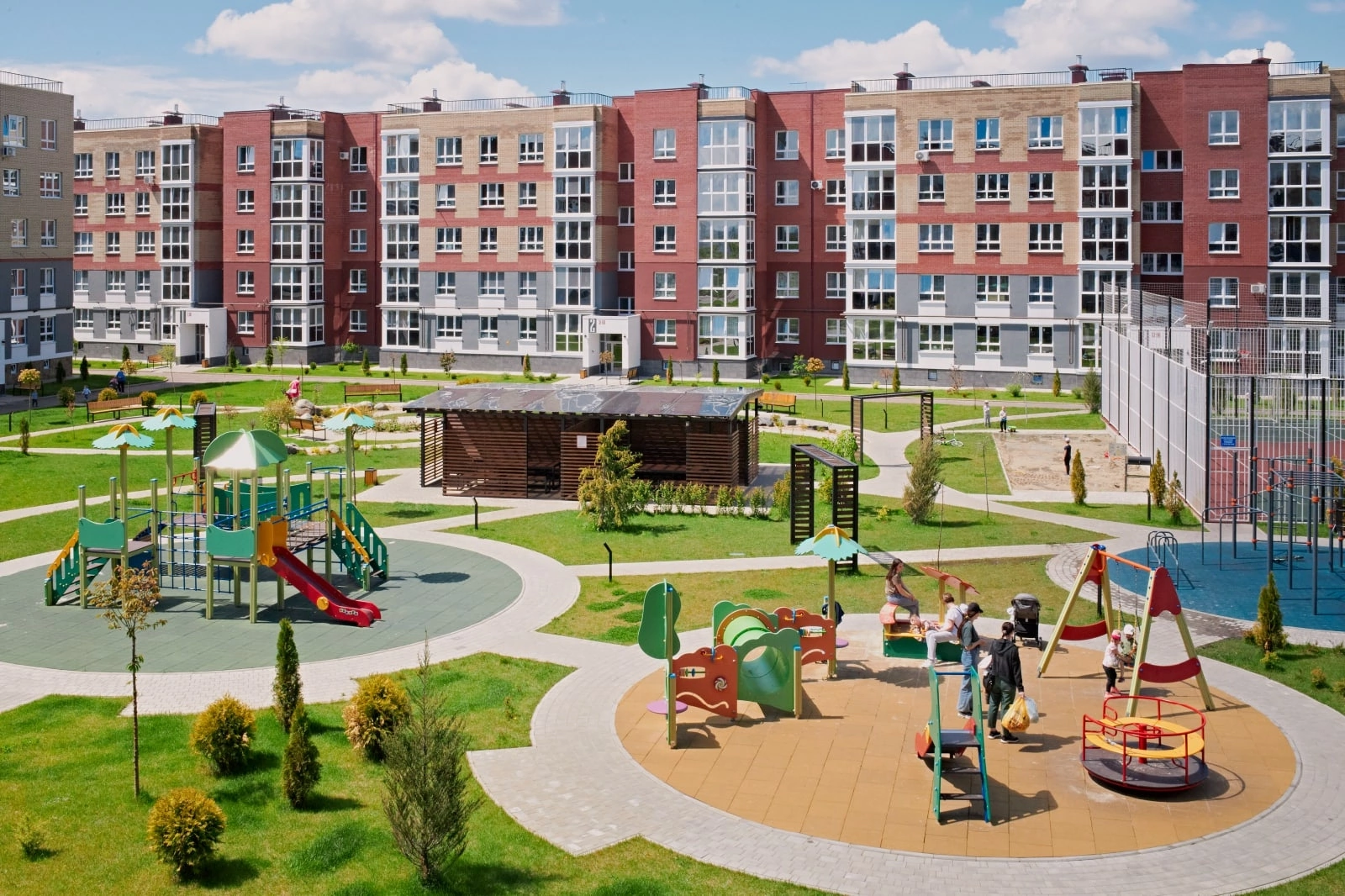 Предусмотрены: 3 детских сада (первый введен в эксплуатацию), школа, спортивный комплекс с бассейном, медицинский центр, торговый и торгово-развлекательный центры, магазины пошаговой доступности. Близость к природе, парки и скверы более 7 Га, пешеходные зоны. На территории пункт полиции и пункт охраны.