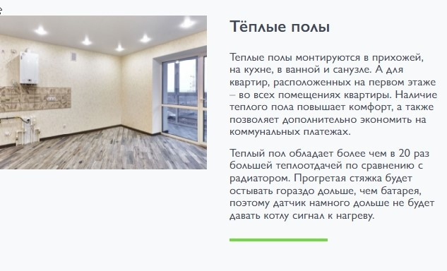 -В квартире полностью сделаны электротехнические работы, подведена вся коммуникация, тёплые полы и климат-контроль во всех помещениях, включая лоджию, стены и полы выровнены по маякам, окна премиум-класса, входная дверь по высокой ценовой категории.