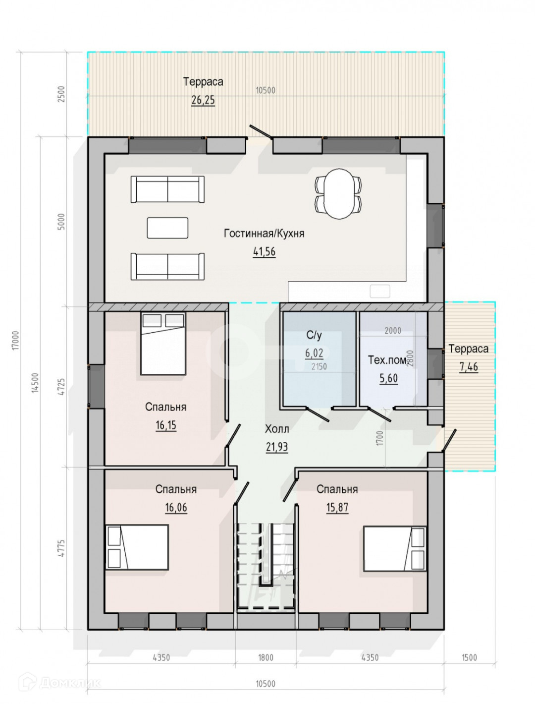Планировка: 3 спальни + огромный зал с кухней-гостиной и раздельными санузлами.