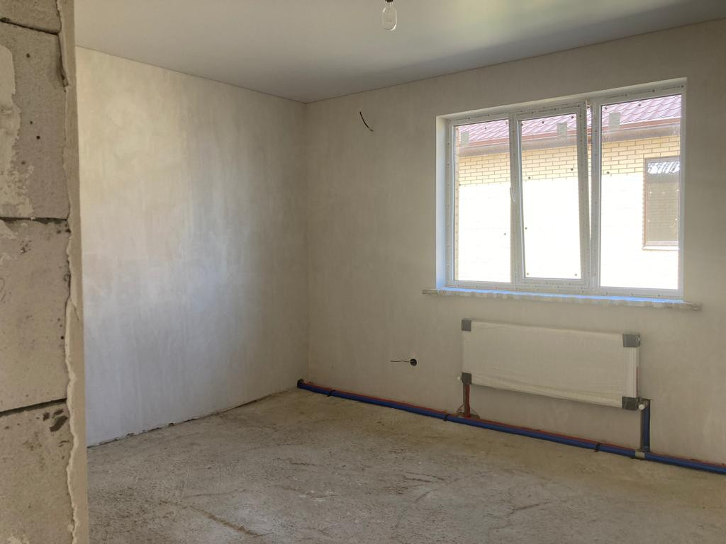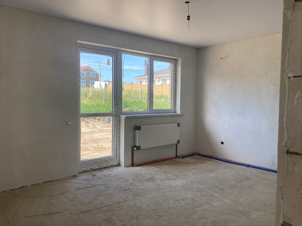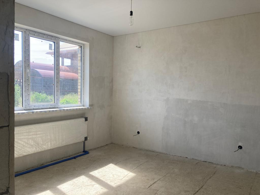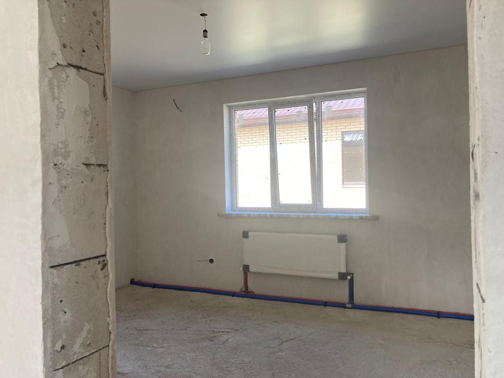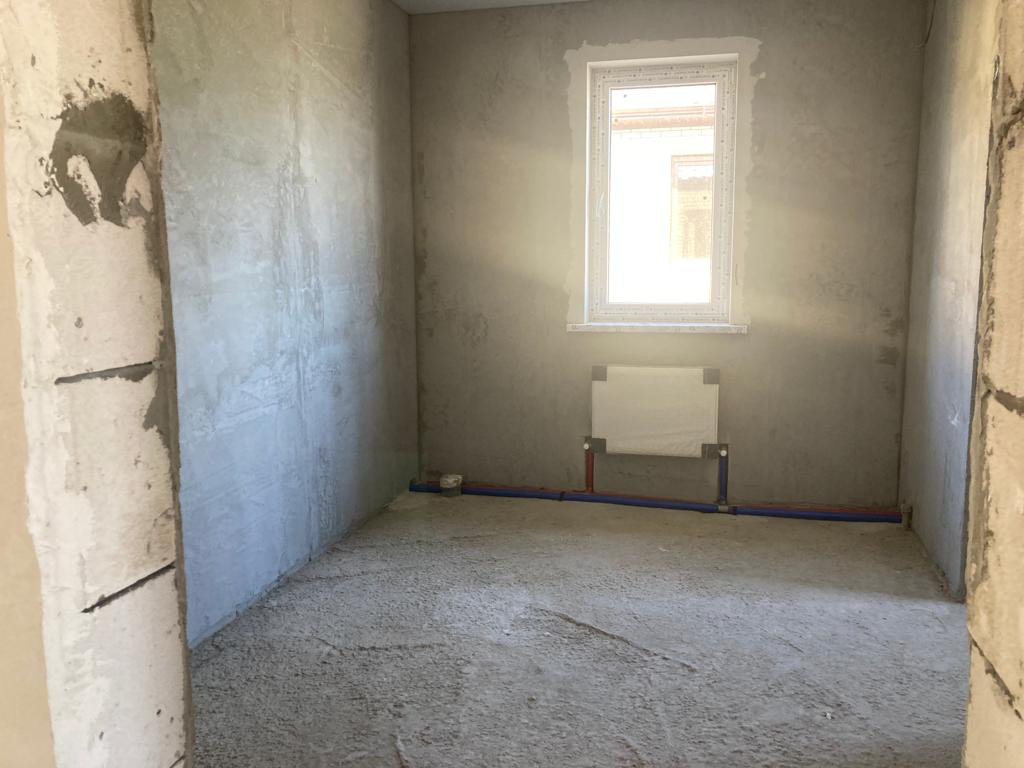 Внутренняя предчистовая отделка, выровненная штукатурка стен под обои, стяжка пола, разводка всех коммуникаций, установка оборудования для нагрева воды и отопления, натяжные потолки, металопластиковые окна, входная металлическая дверь.
