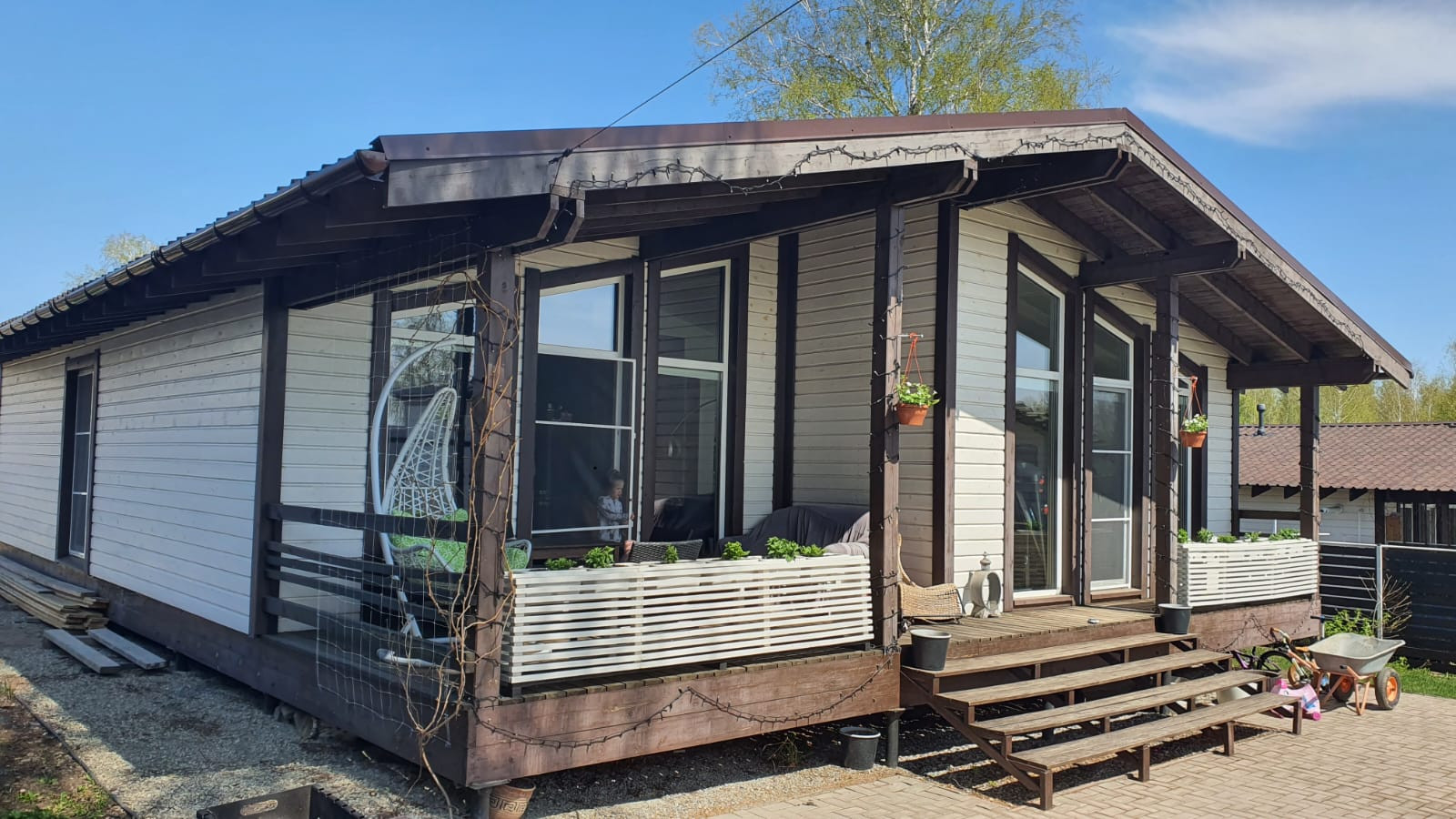 Готовый дом можно посмотреть по предварительной договорённости, там идут внутренние отделочные работы.