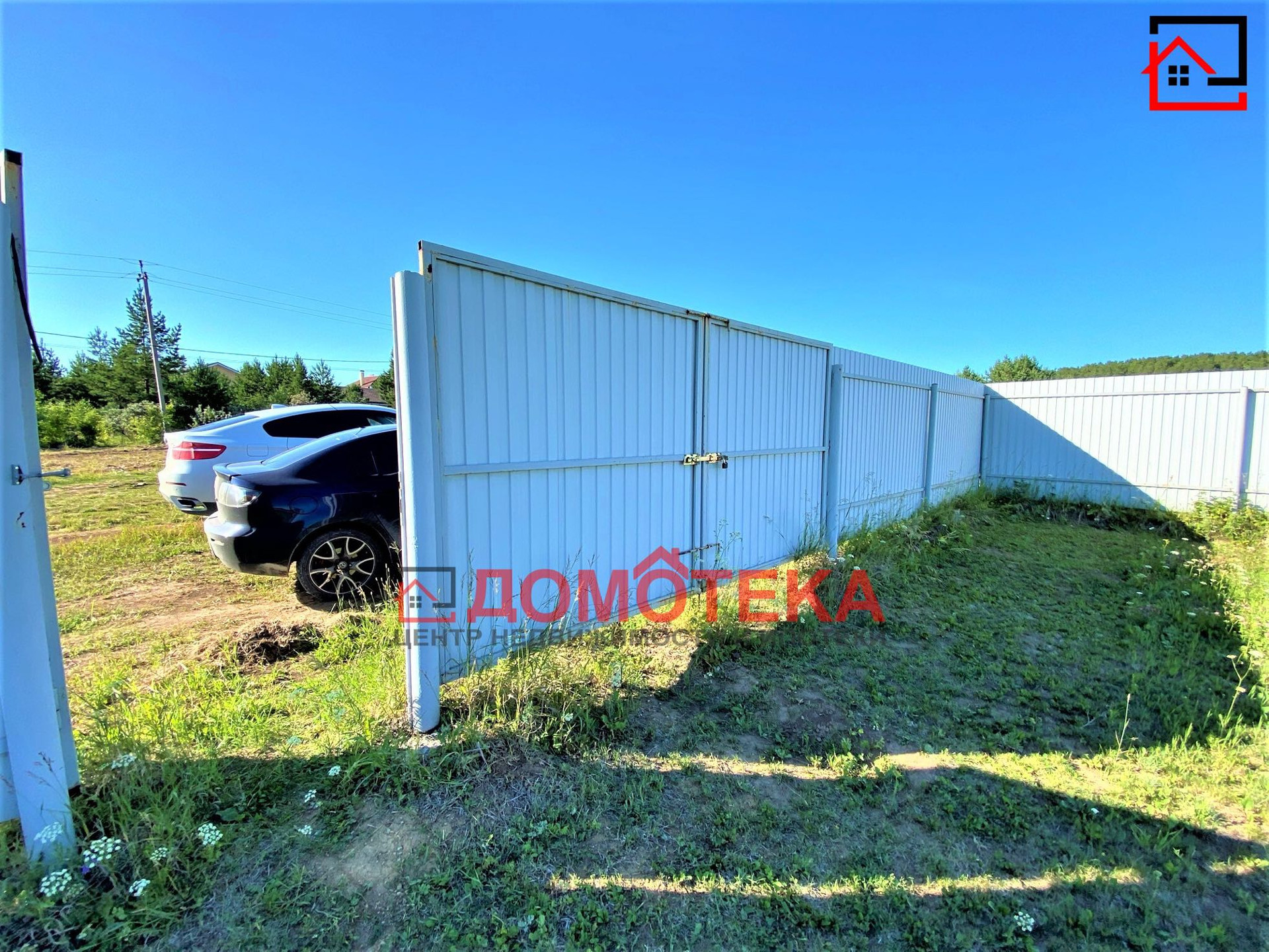Огорожен забором, с распашными воротами и калиткой.