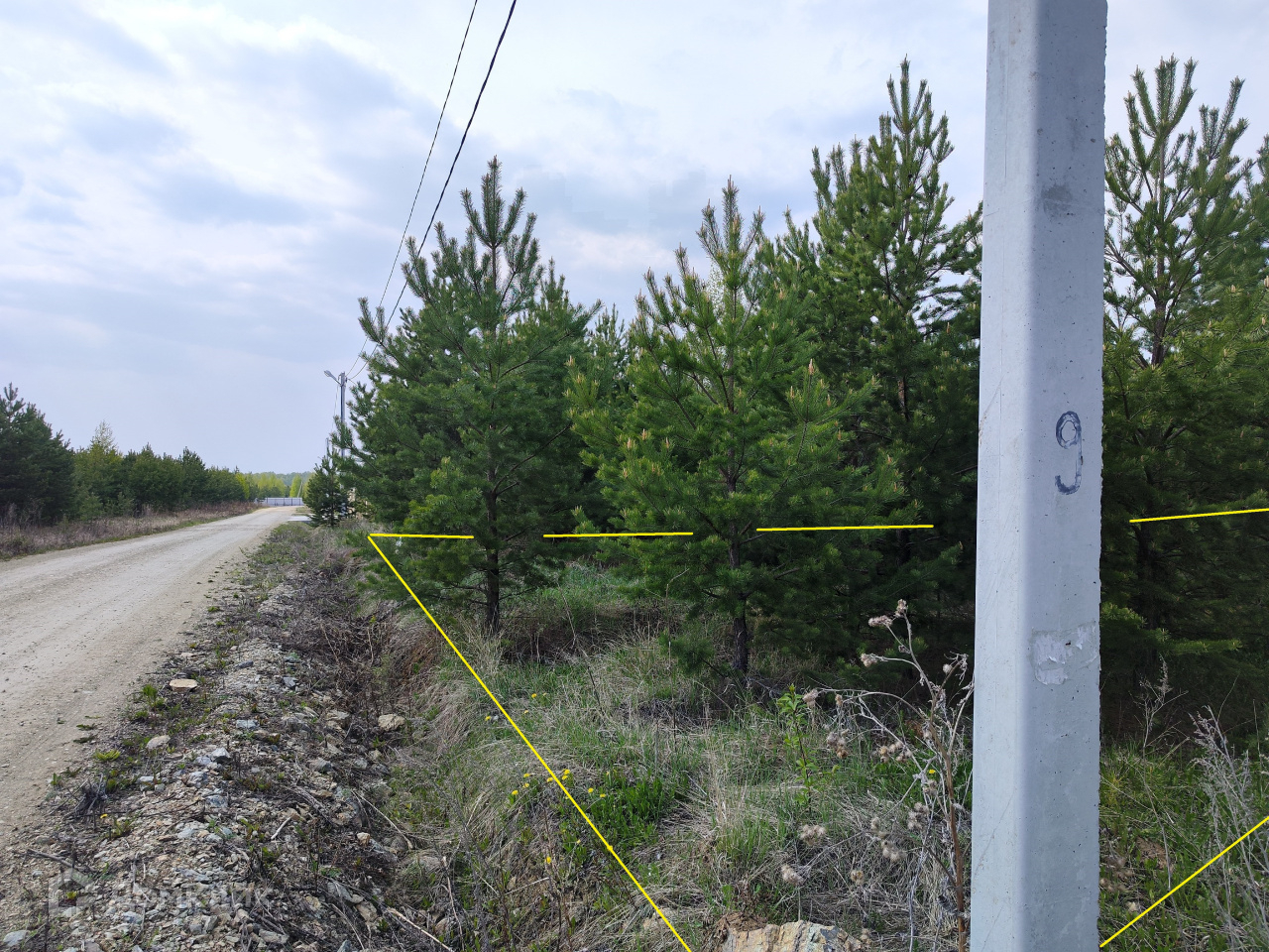 прямоугольные границы, на территории растут  елочки, которые встретят Вас с любовью и помогут определится с участком. На всем участке