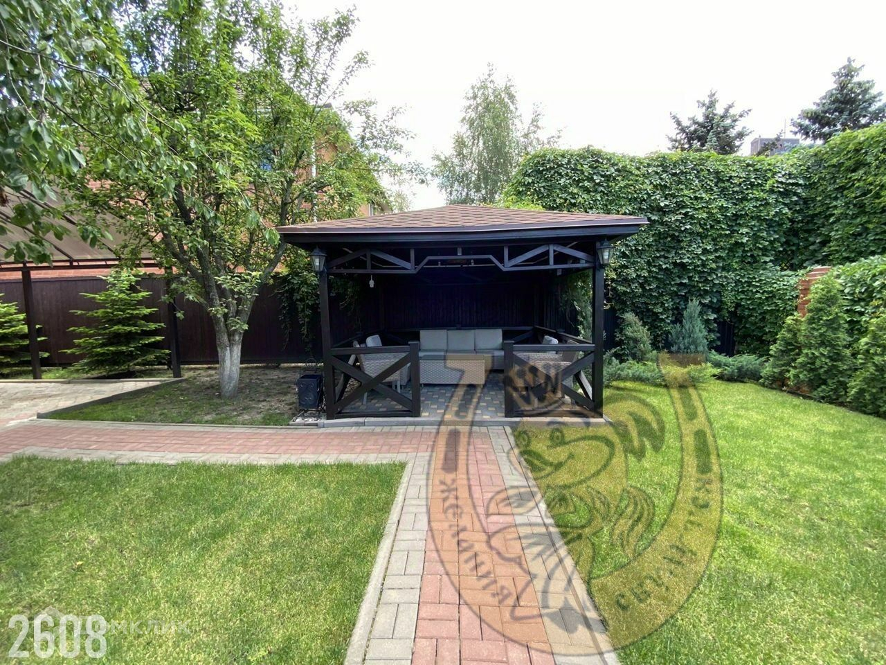 Вся территория в зелени. Деревья, кустарники и газоны ухожены, создают уют и отгораживают от посторонних глаз соседей.
