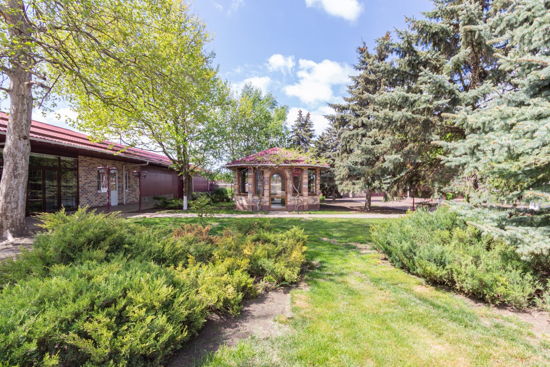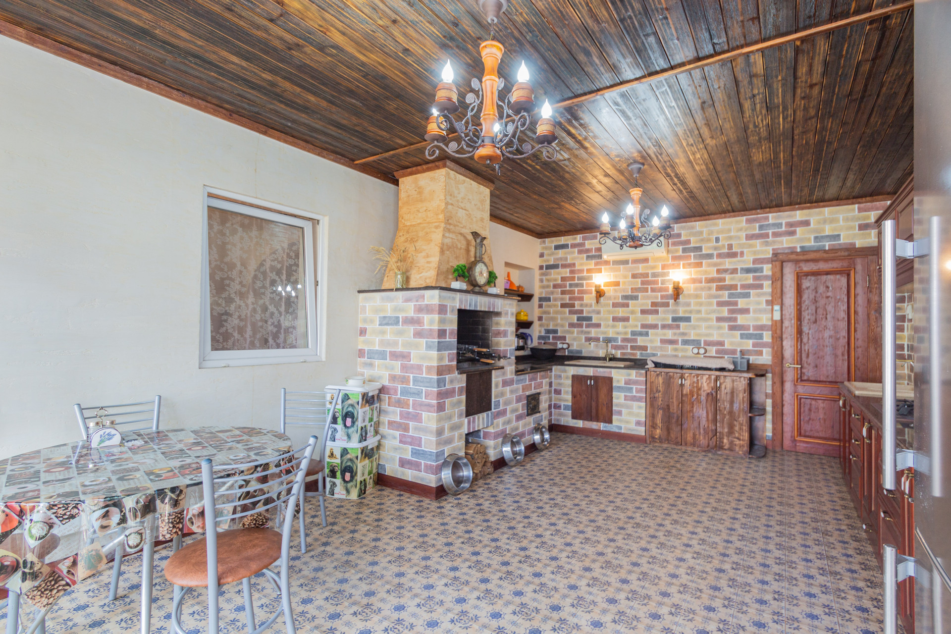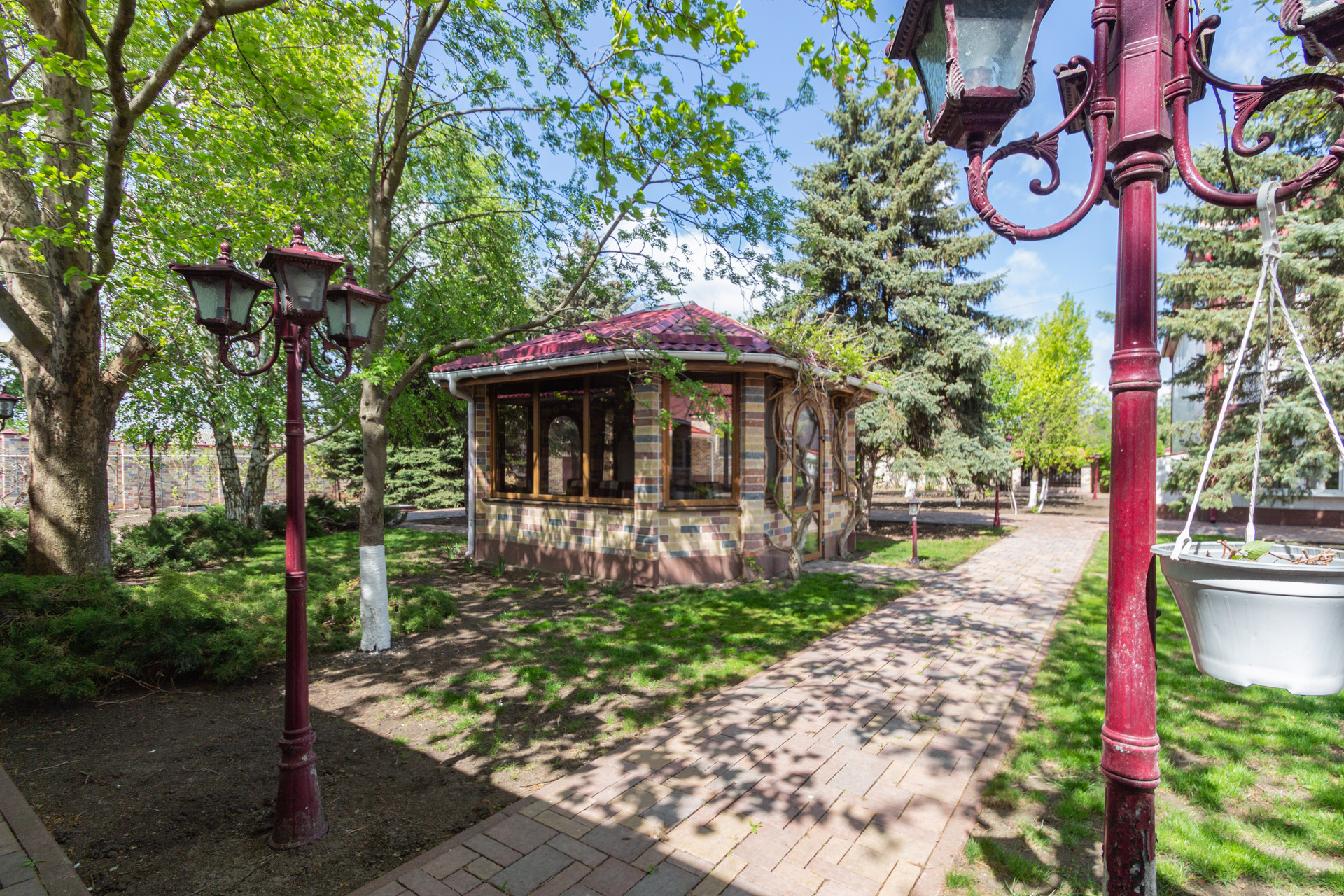 Также это летняя кухня с мангалом и выходом на приусадебный участок, где расположена уютная беседка, утопающая в зеленых насаждениях.