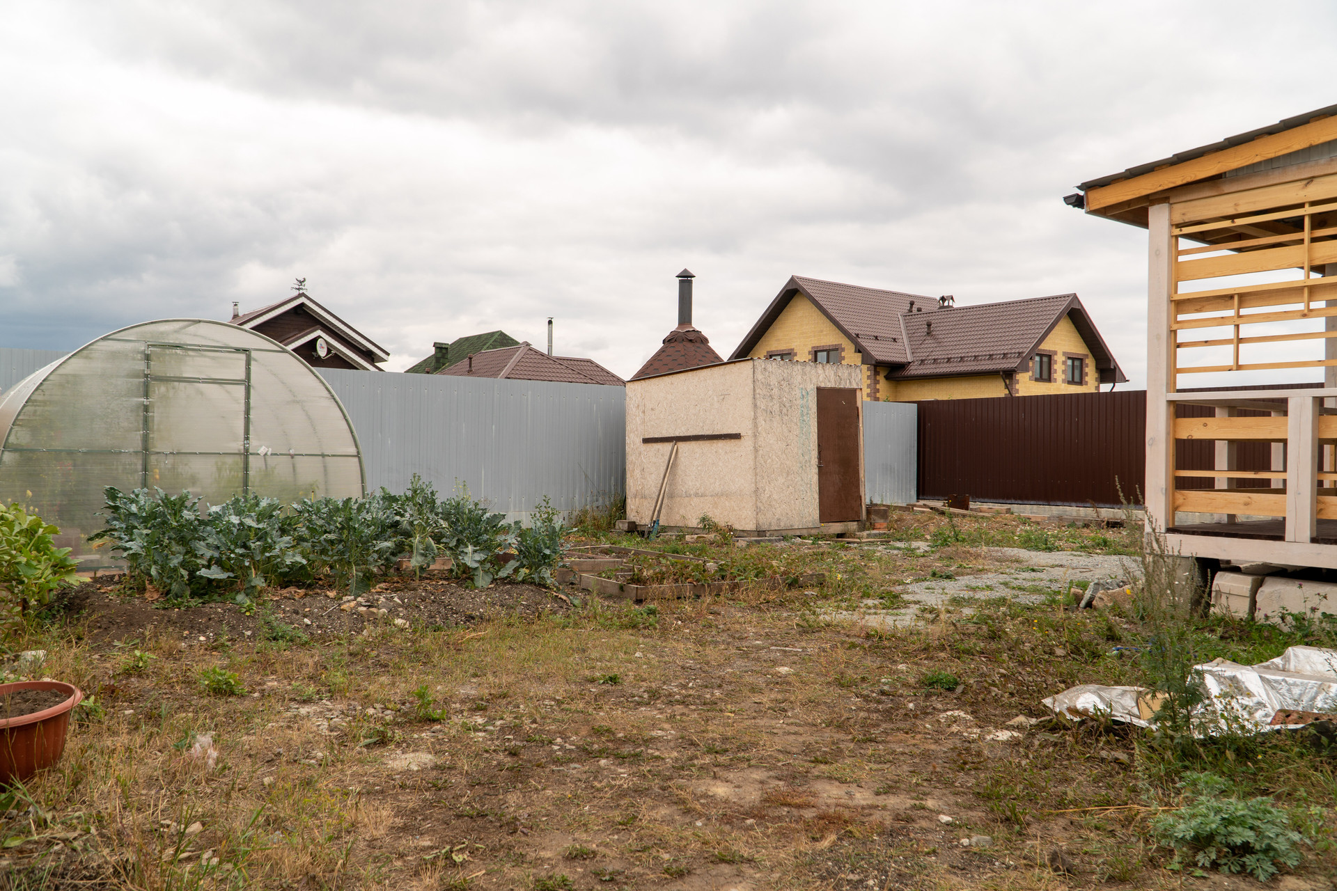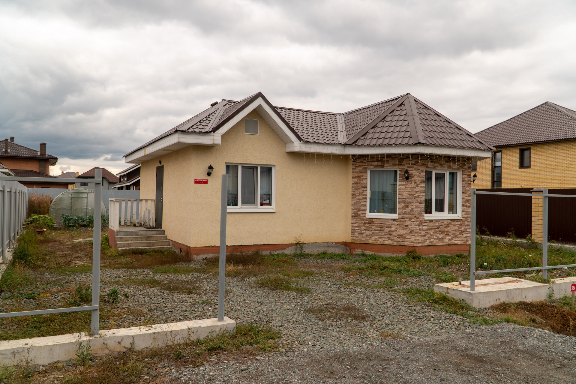 Одноэтажный дом площадью – 65 кв.м на земельном участке 5-ть соток (кат: земли населенных пунктов, ИЖС) Дом построен из полистеролбетонных блоков. Участок с трех сторон огорожен забором, с четвертой-лицевой стороны подготовлены фундамент и конструкция для забора и откатных ворот.