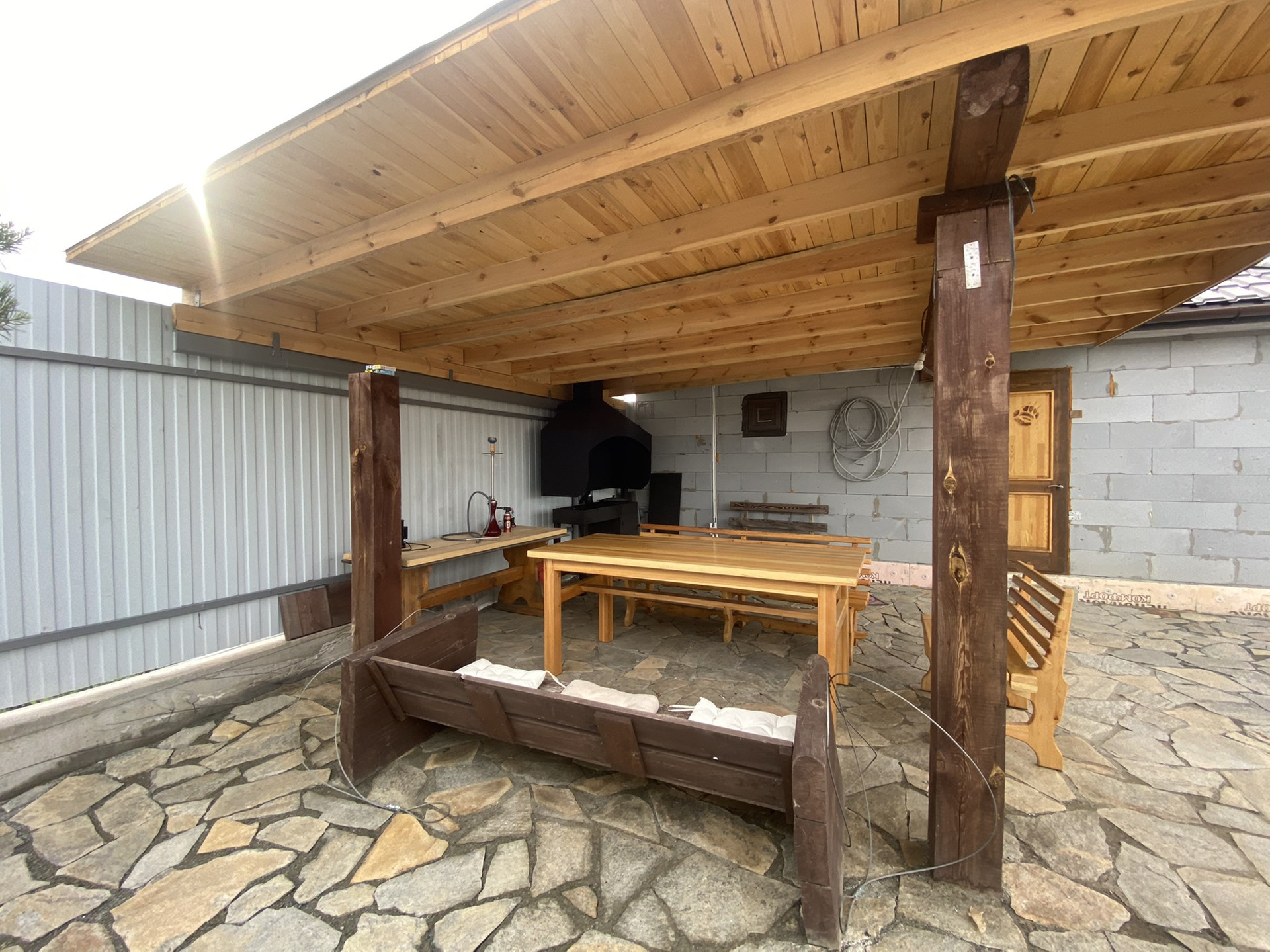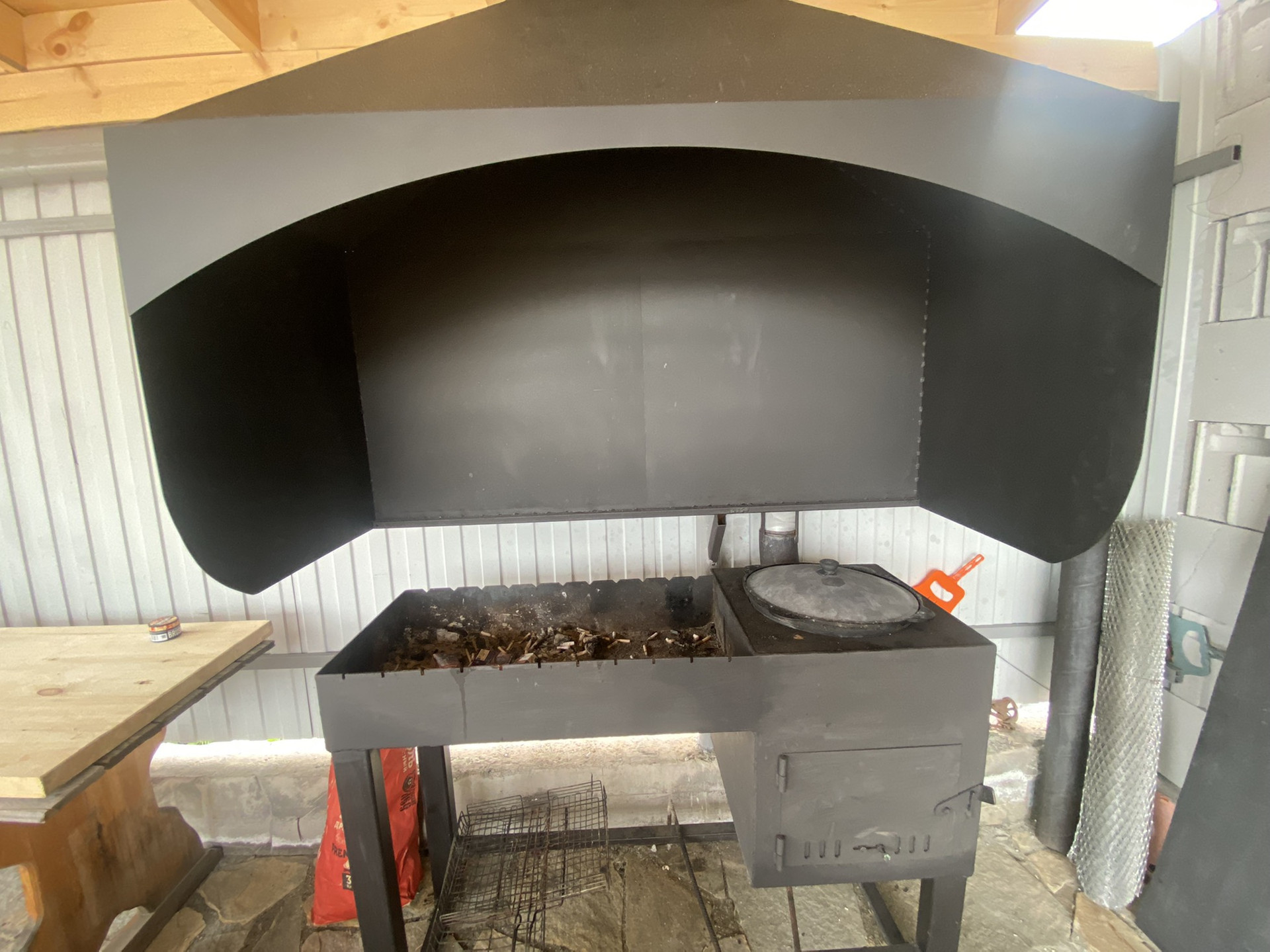 Зона барбекю находится рядом с баней, крытая, оборудована стационарным мангалом с дымоходом.