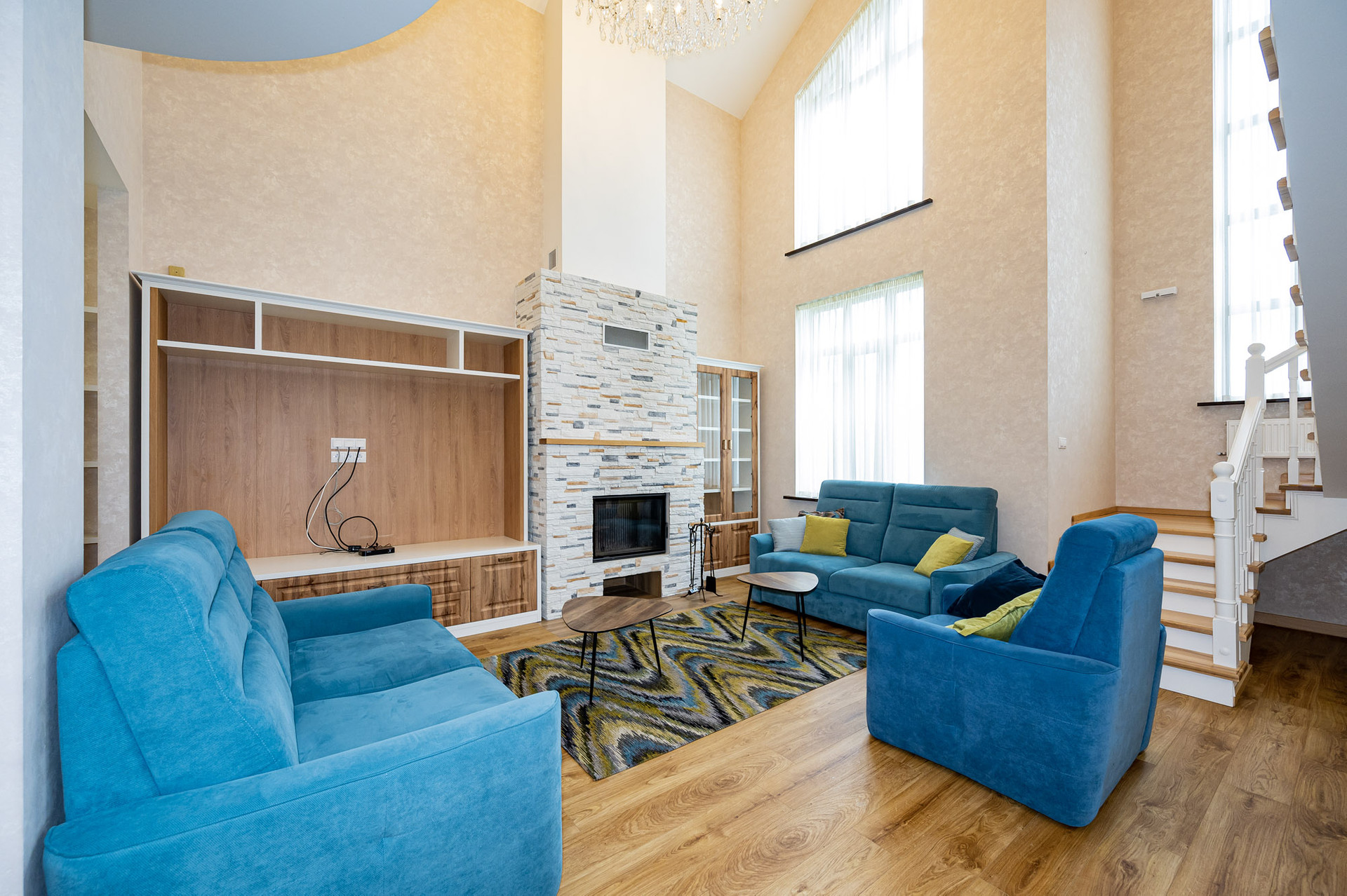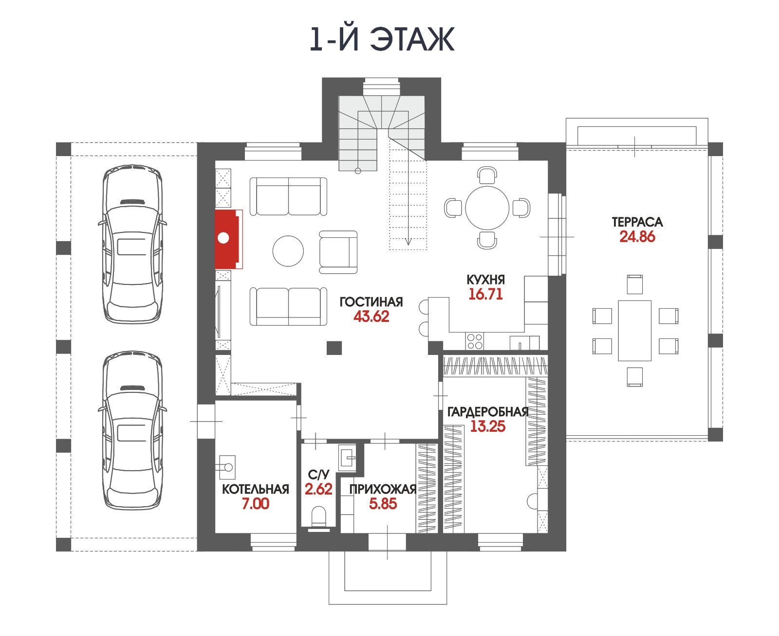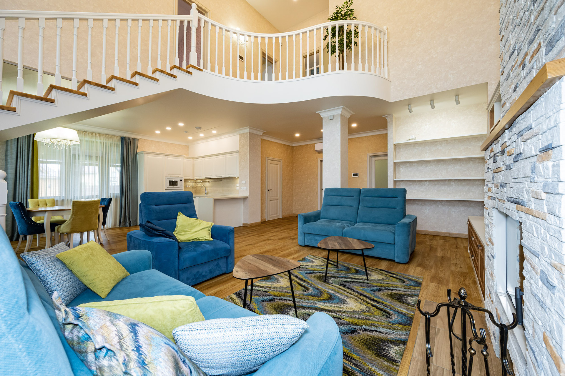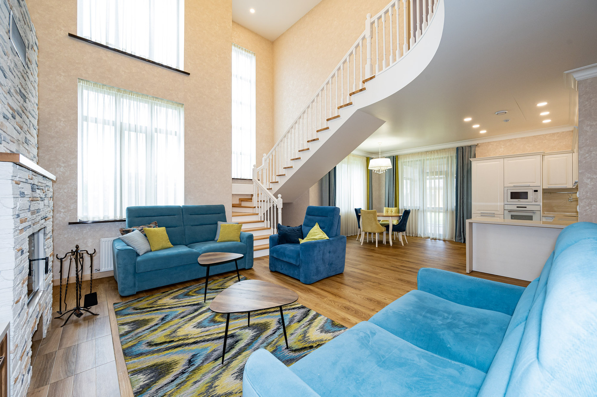 На 1 этаже находится просторная гостиная со вторым светом (44 м 2), кухня - столовая, оборудованная стильным белым гарнитуром и бытовой техникой, вместительная гардеробная, которую можно использовать как кабинет или гостевую комнату, котельная и гостевой санузел.