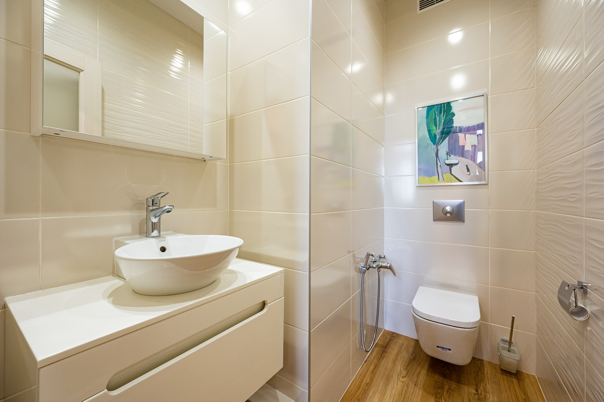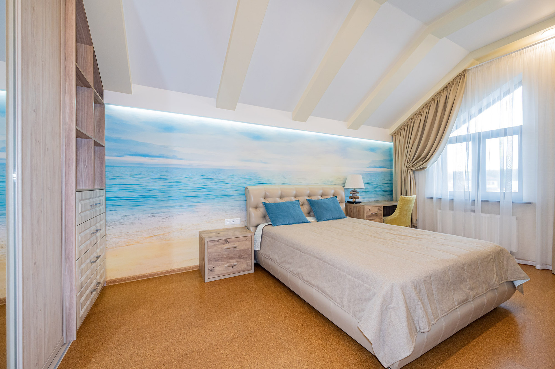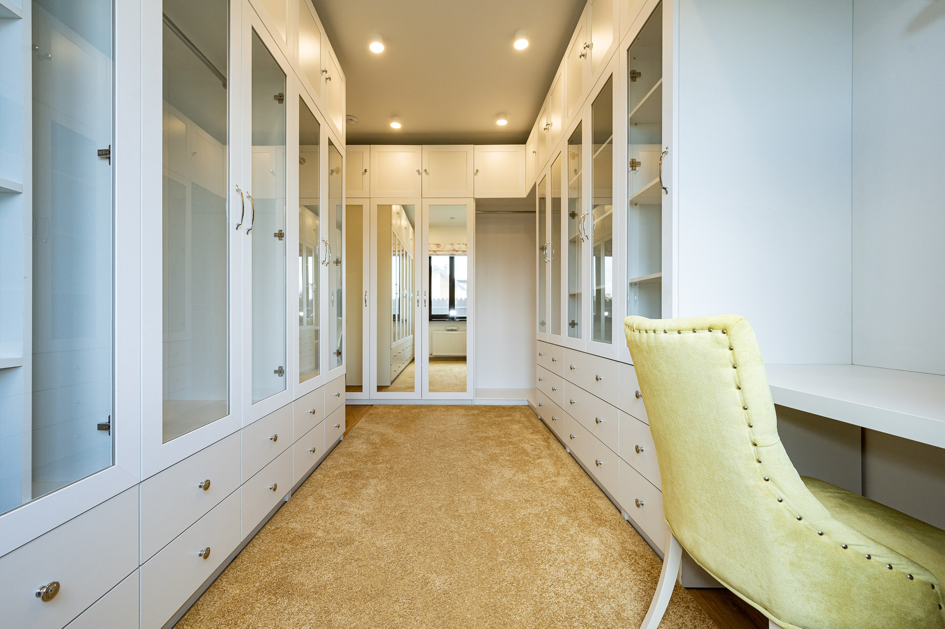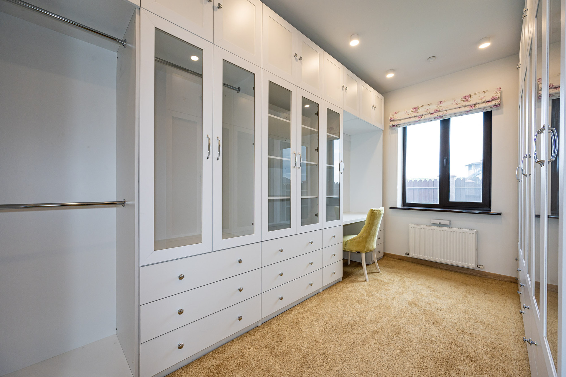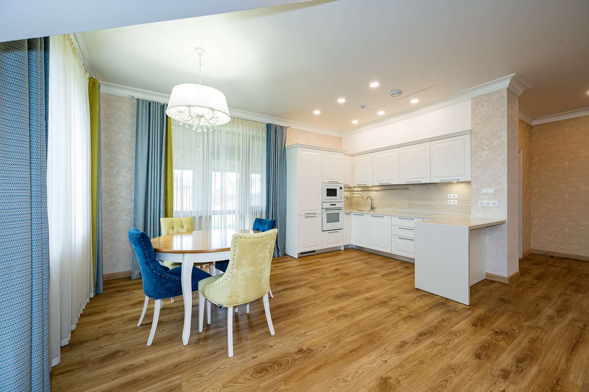 На 1 этаже находится просторная гостиная со вторым светом (44 м 2), кухня - столовая, оборудованная стильным белым гарнитуром и бытовой техникой, вместительная гардеробная, которую можно использовать как кабинет или гостевую комнату, котельная и гостевой санузел.